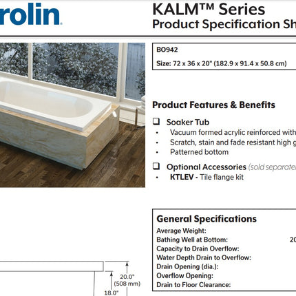 With spacious dimensions of 72 by 36 inches, the Kalm bathtub offers a generous bathing area, allowing you to indulge in relaxation and tranquility. The drop-in design ensures a sleek and modern appearance while providing flexibility in installation, making it suitable for various bathroom layouts.