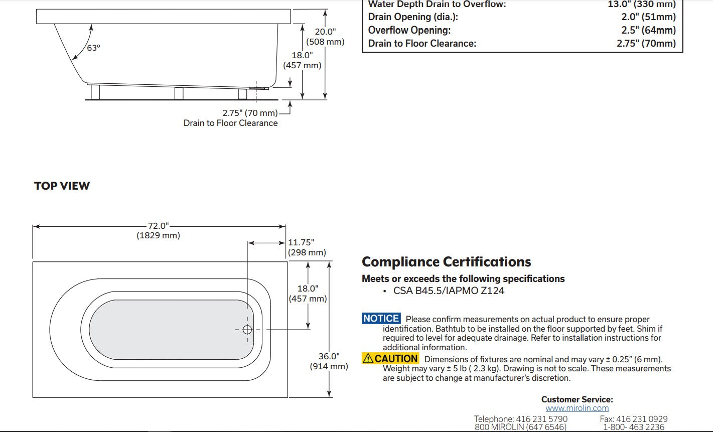 Mirolin Kalm 72 x 36 Drop-in Bathtub