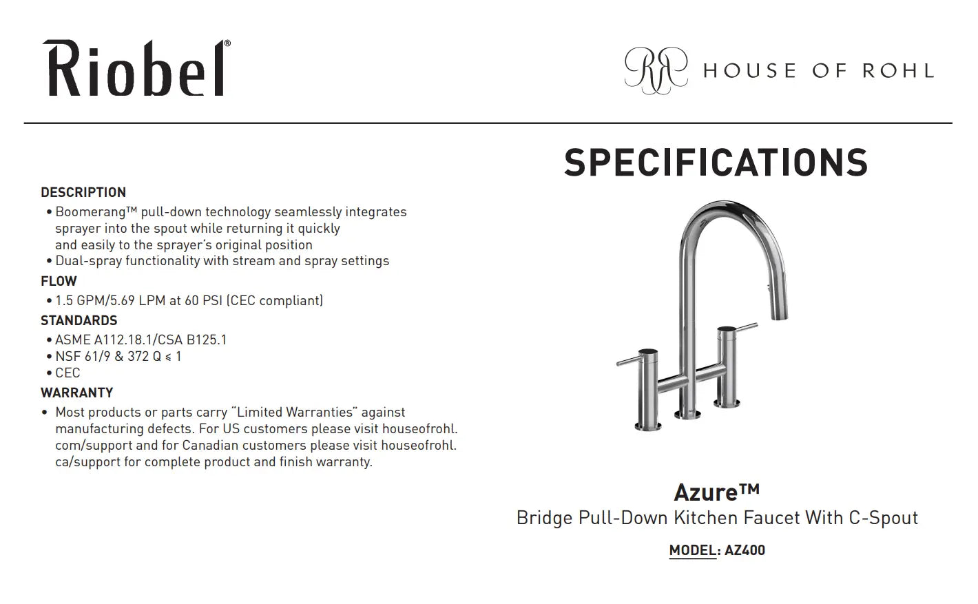 - Matching Bar/Food Prep kitchen faucet is available