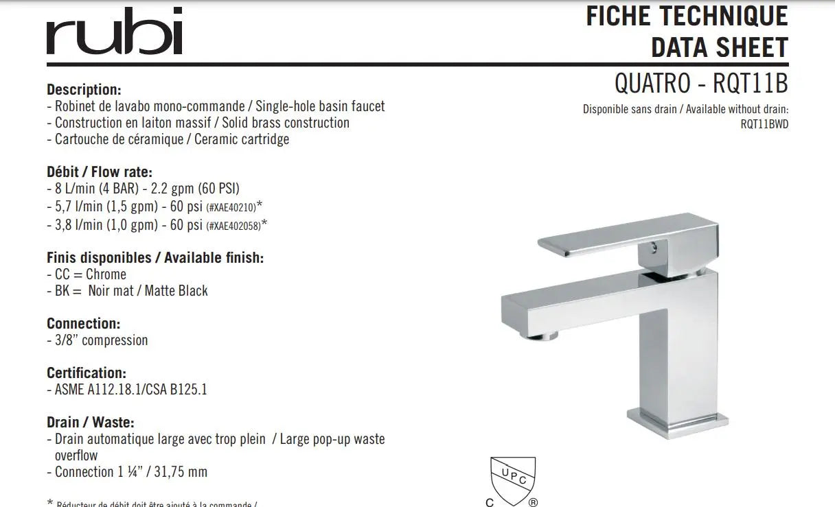 Rubi Quatrio Single Hole Bathroom Sink Faucet With Pop Up Drain