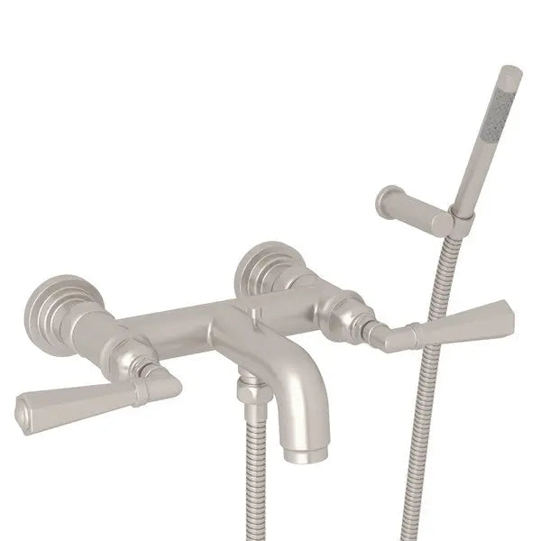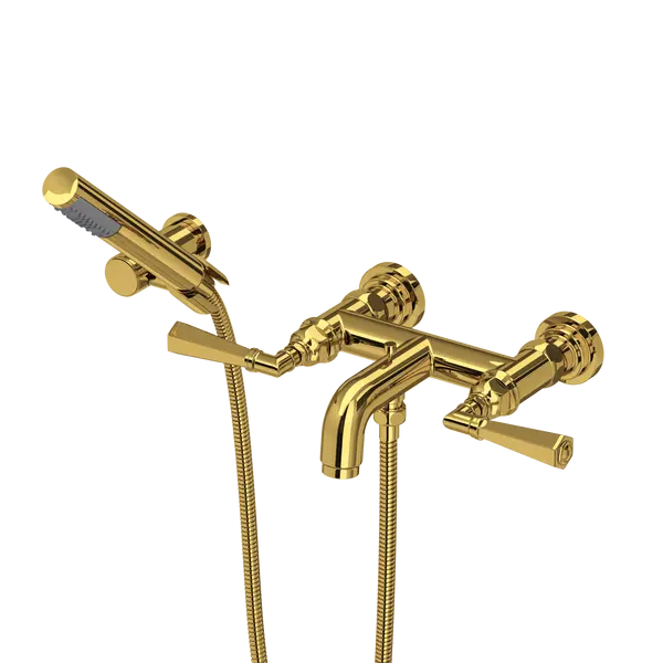 • Wall mount exposed two handle tub filler with handshower holder bracket and single-function ABS handshower