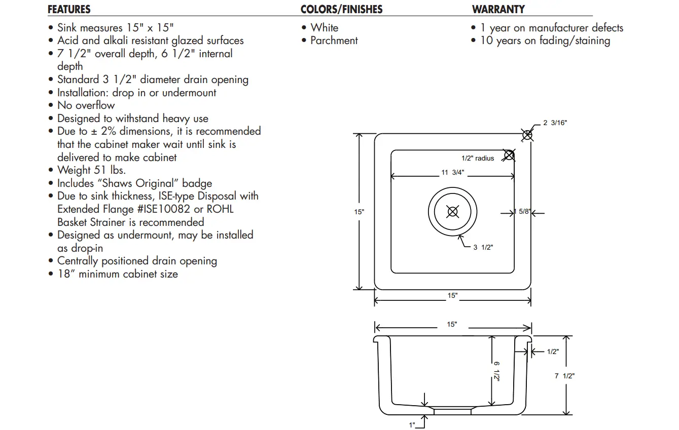 Shaws Original Lancaster Single Bowl Fireclay Bar & Food Prep Sink RC1515WH