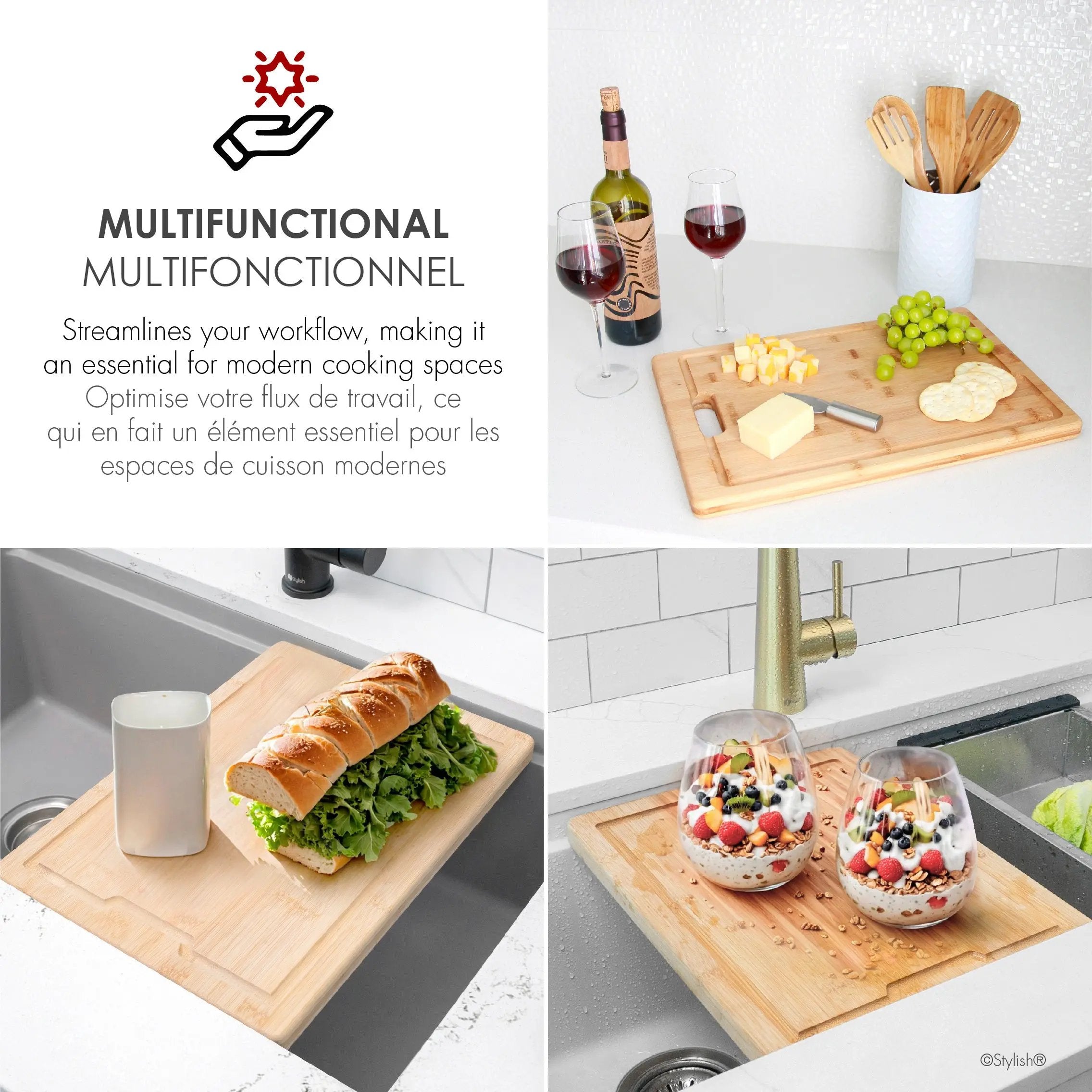 This premium bamboo cutting board is attractive, durable, environmentally conscious and has a built-in handle. The bamboo is stronger than maple, giving a long-lasting cutting board that will never crack or splinter, and it is moisture resistant, ensuring the best tasting meals possible for family and friends. This top notch quality cutting board is extremely safe to use. It has been made from high quality anti-microbial bamboo wood and it is BPA free. This cutting board offers a solution for everyday kitchen tasks like slicing, dicing, chopping, and it even doubles as a serving tray over the sink, elegantly complementing the kitchen. It also comes with a deep groove, containing the juices form fruit, veggies and meat to neatly without creating a mess on your countertop, the perfect addition to your kitchen. Our bamboo is treated with a light mineral oil application before it leaves the factory, so it arrives ready for you to use! Some tips for proper care of your bamboo board: - Coat the bamboo with a food-safe mineral oil. - Hand wash with gentle dish soap and warm water. - Avoid soaking your board, and NEVER use the dishwasher!