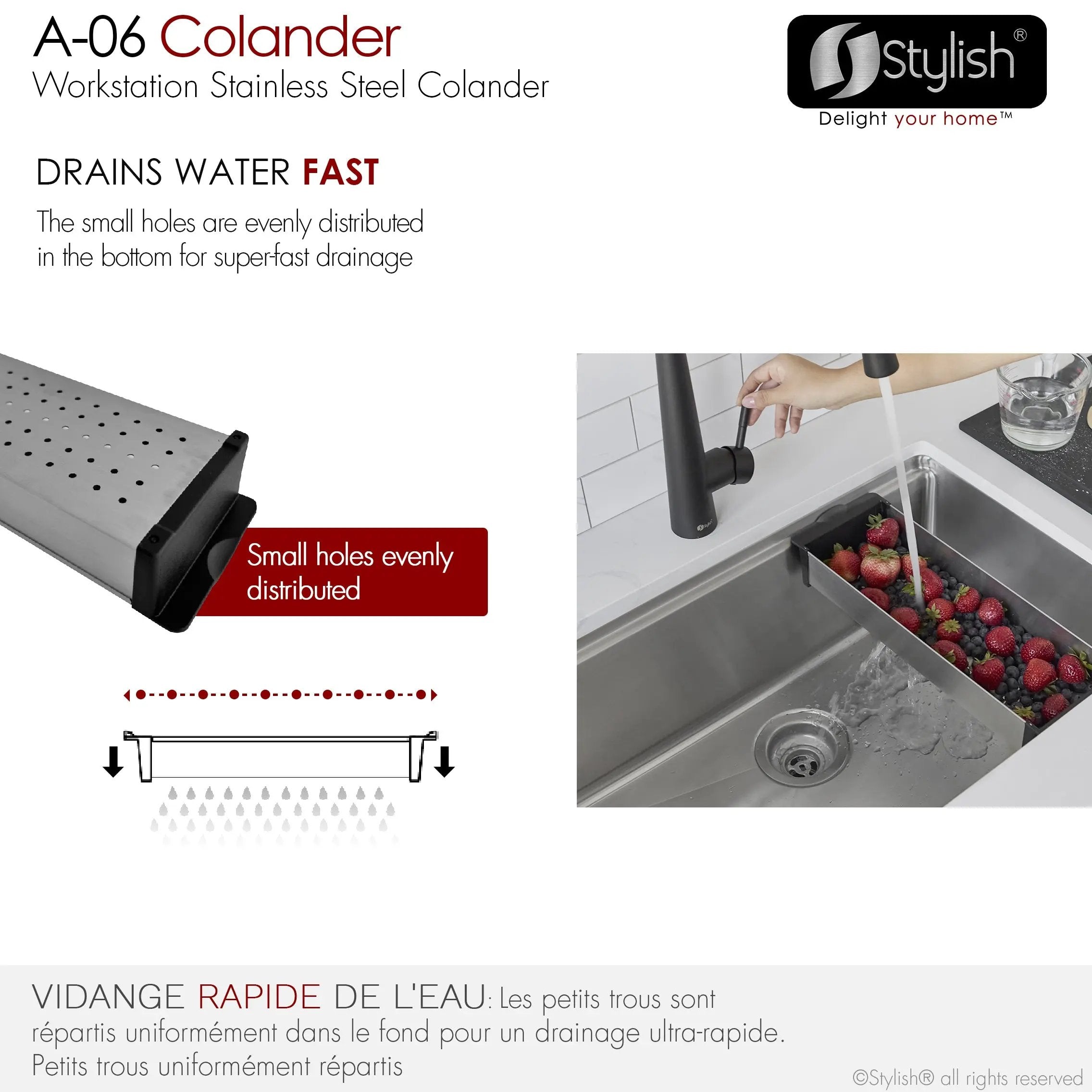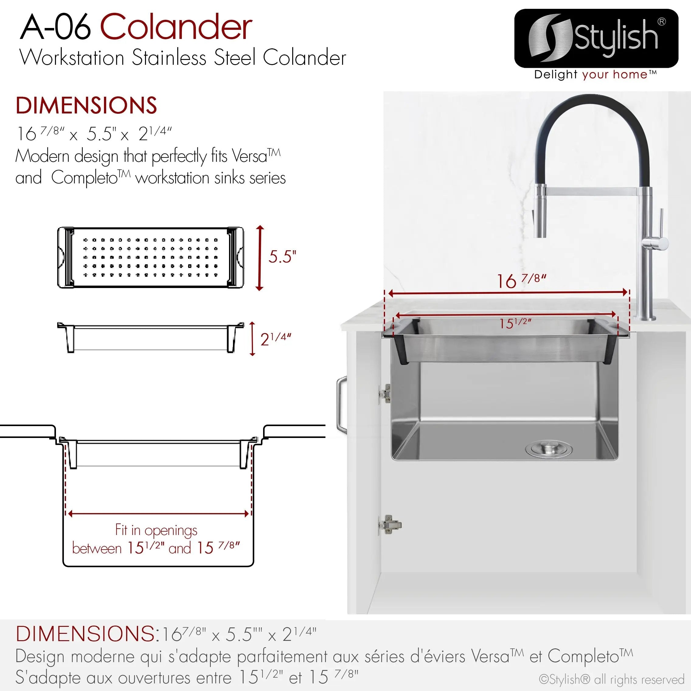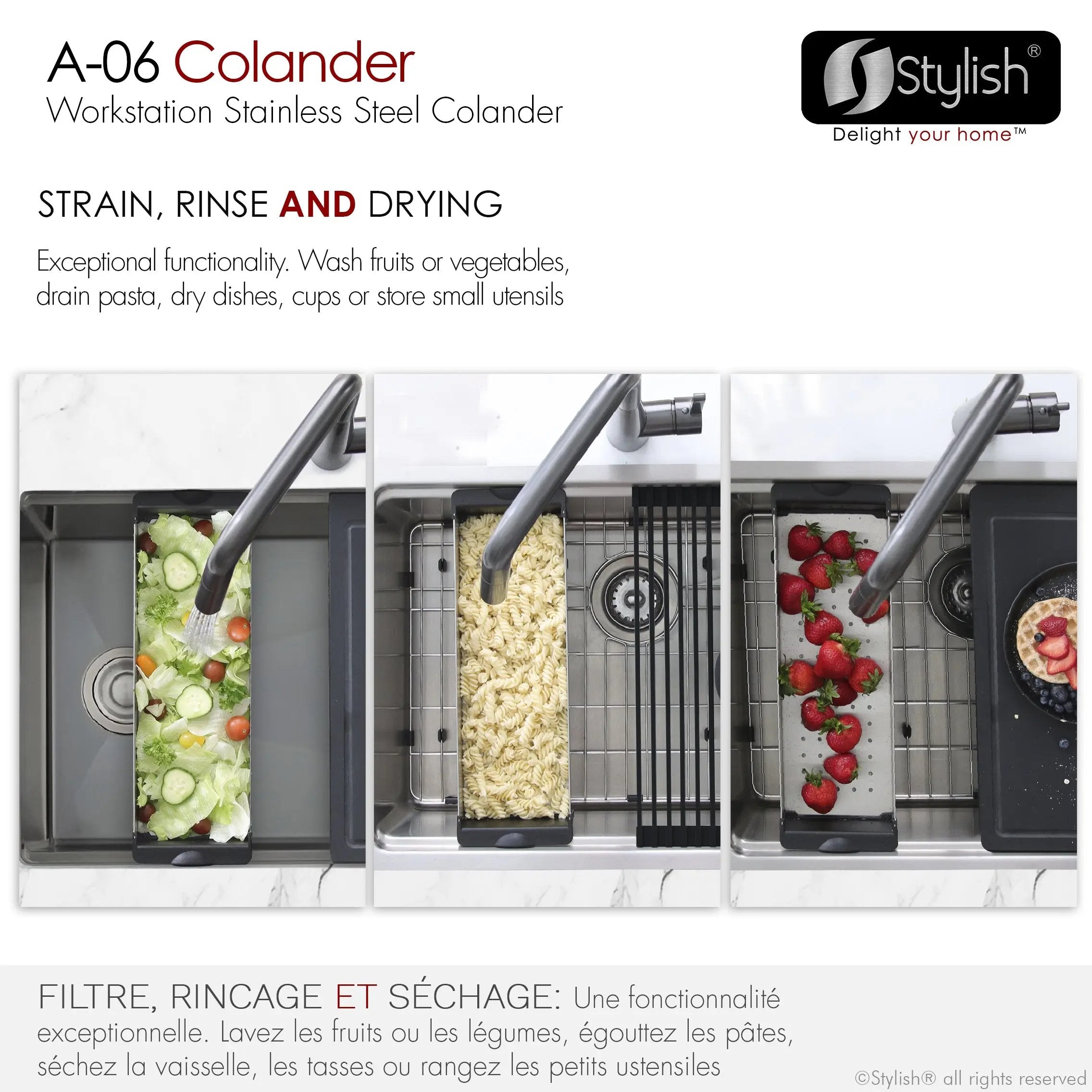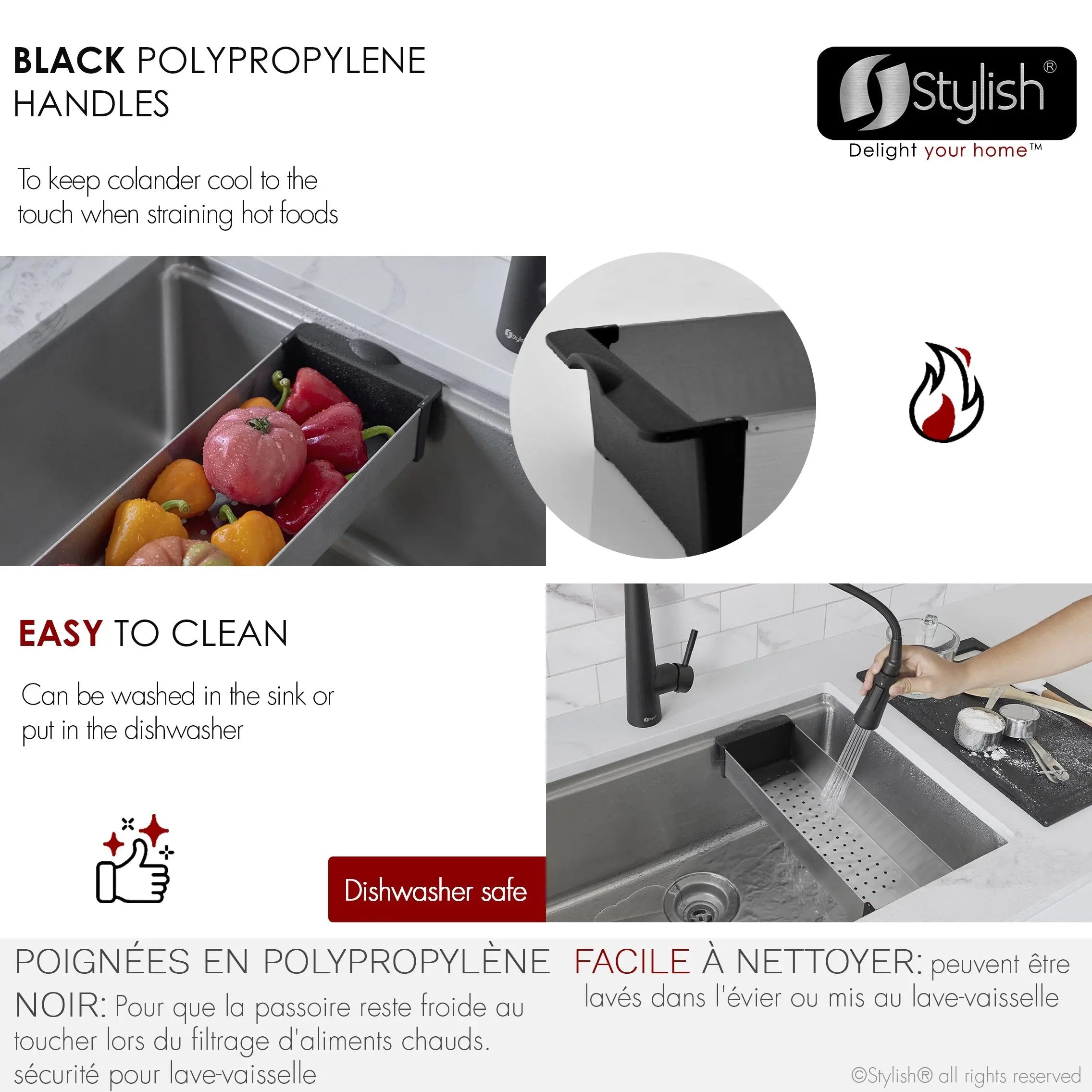Stylish 16 7/8" Stainless Steel Over the Sink Colander with Black Handles