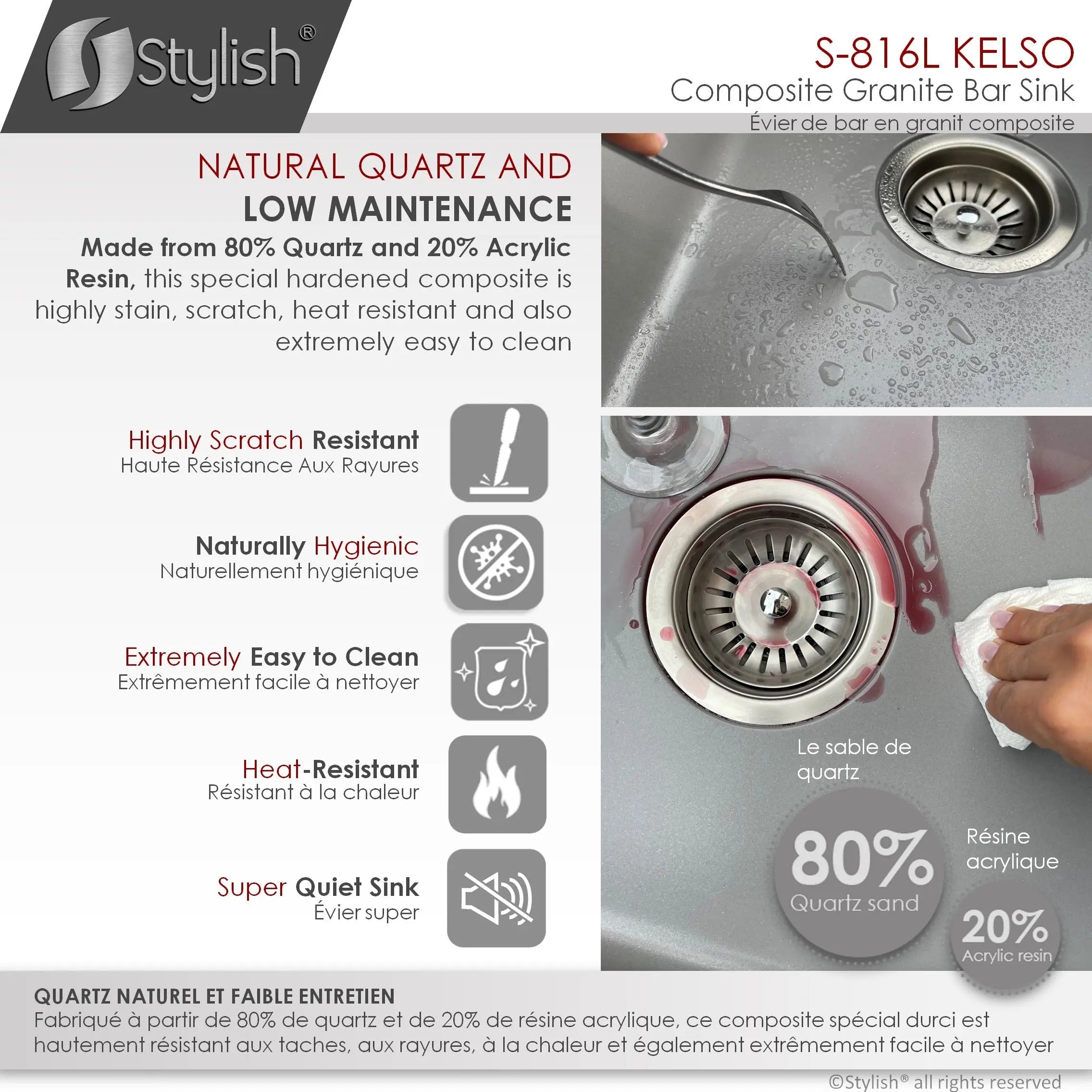Rock your kitchen experience with this amazing 15.5-inch single bowl dual mount composite granite kitchen sink made with 80% natural quartz. This sink is exceptionally durable and low-maintenance, with a stone-like material that is much lighter than solid granite but still great for handling your everyday demands. Highly resistant to scratches and dirt, this sink is also quite easy to clean and maintain. Designed for dual mount installation, it can be installed over the countertop or as an undermount sink for a more seamless appearance.