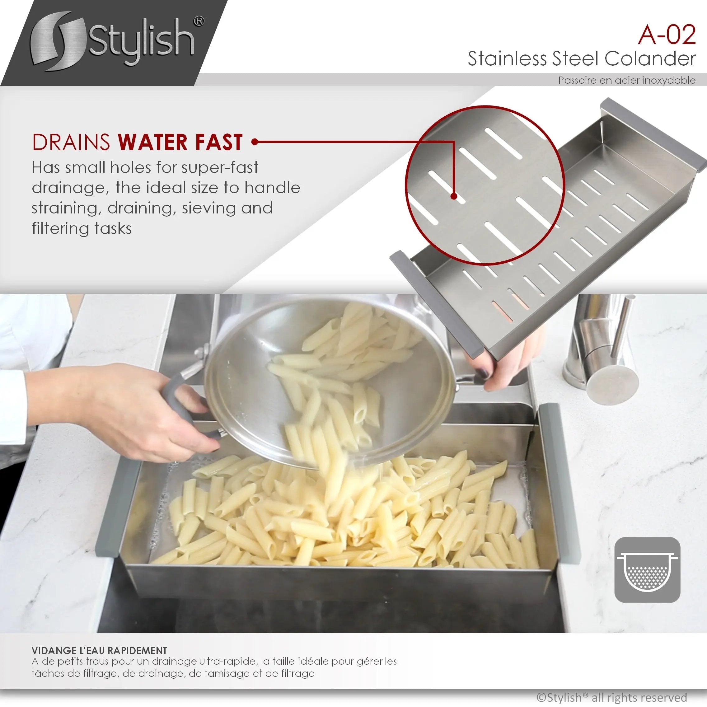 This versatile colander rests securely over your sink, perfect for rinsing vegetables, draining pasta, and drying utensils. It fits 16-inch sink openings (check product listing for dimensions) and complements popular fixtures with its satin finish. Cushioned handles provide flexibility and stability for various kitchen tasks, including filtering and straining. Stylish accessories combine efficiency and sleek design for everyday use