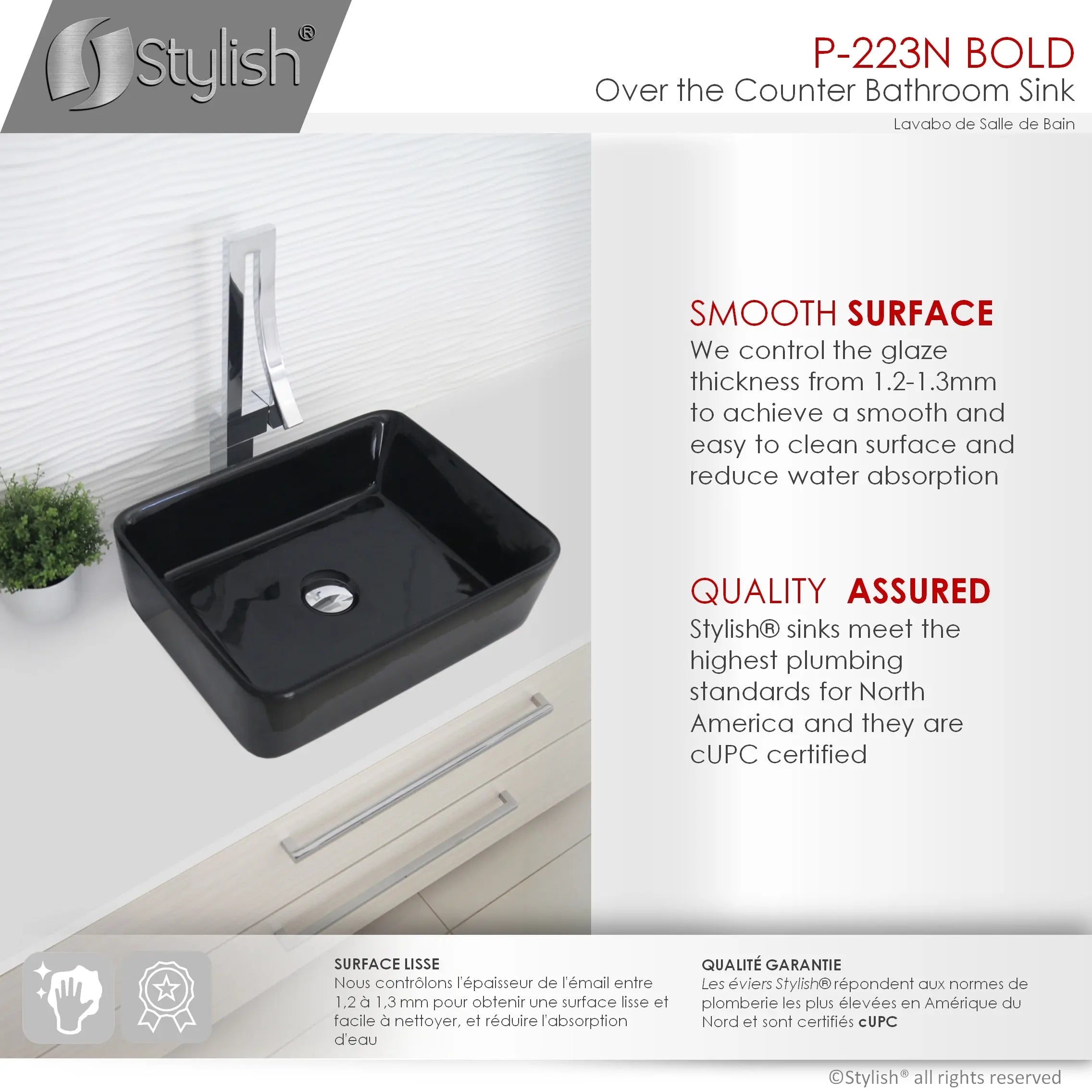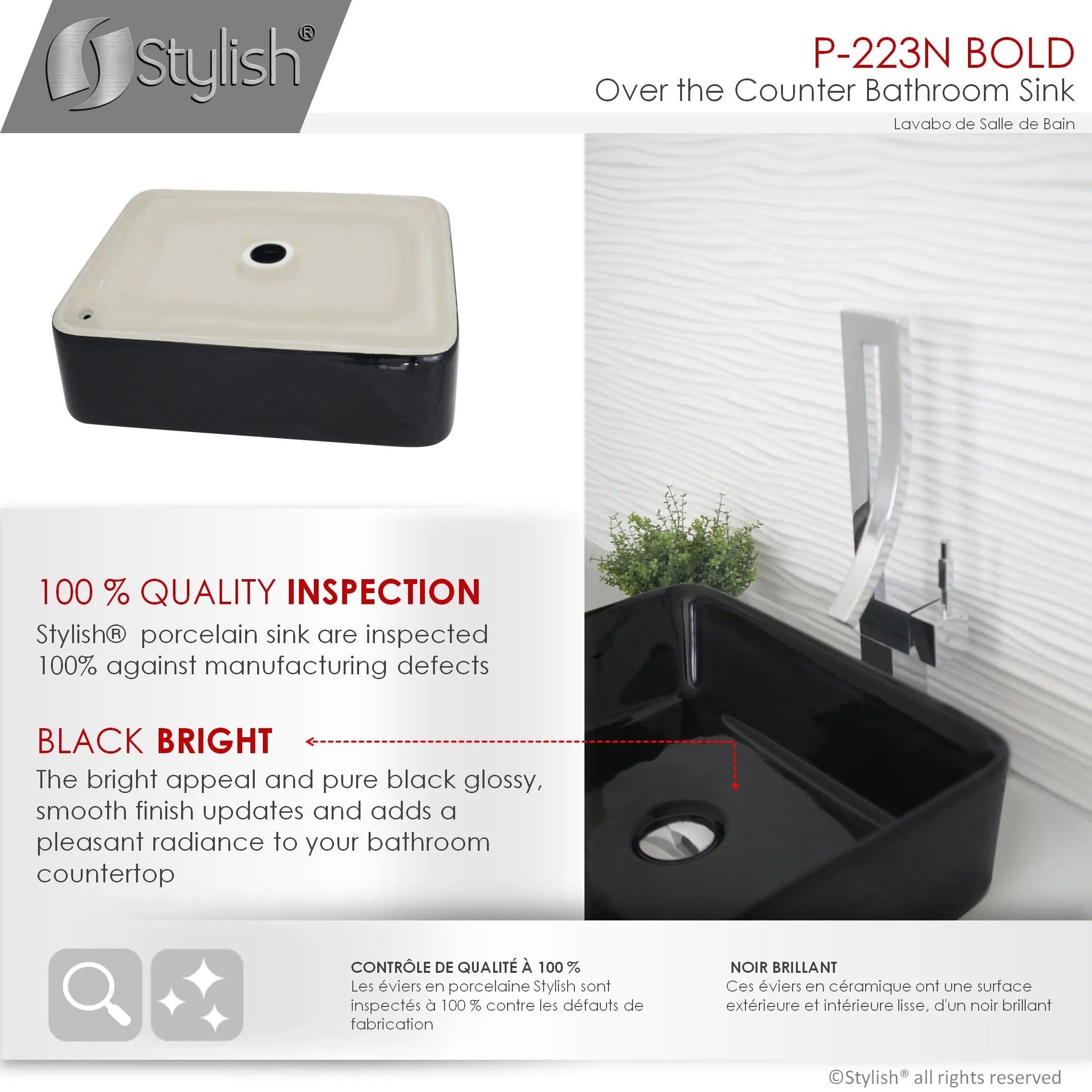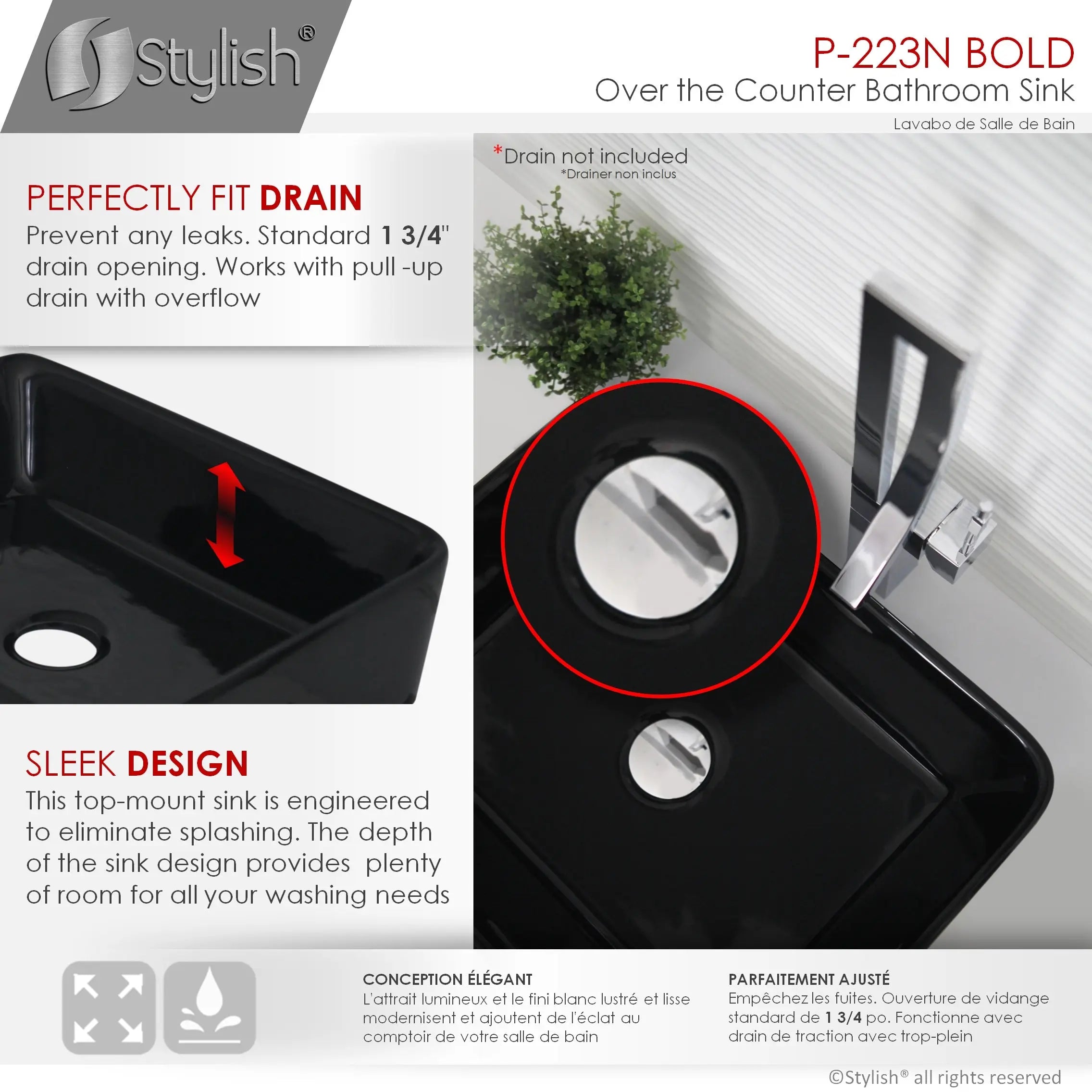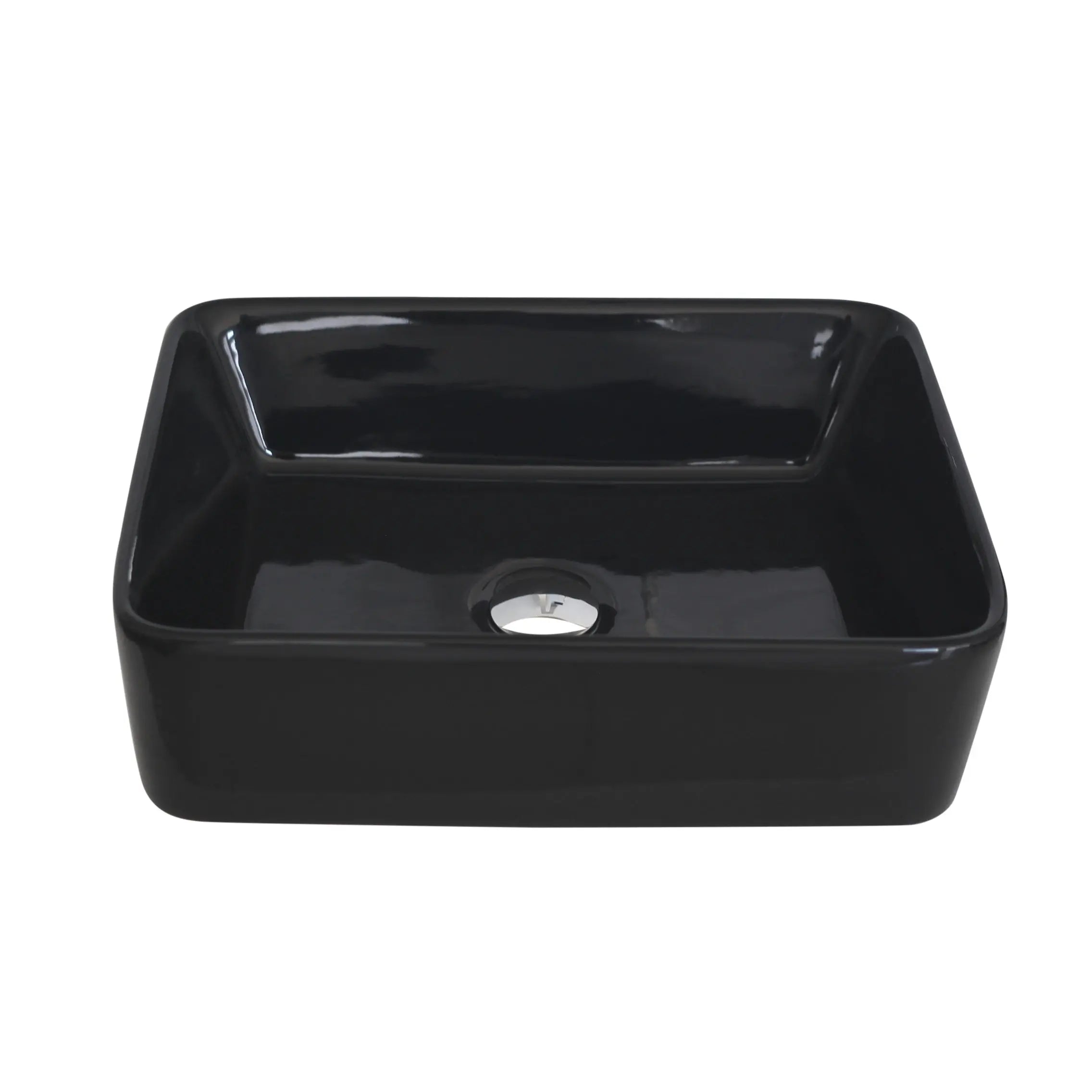 STYLISH® 18 inch Black Rectangular Ceramic Vessel Bathroom Sink Optimize The Looks of Your Bathroom With STYLISH® Ceramic Sinks!In search of… … cost effective ways to decorate your bathroom?… a brand new above the counter sink vessel?… durable yet elegant bathroom sinks?… a sink vessel that is stain and chip resistant?Search no more! You have just found the ultimate bathroom vessel sinks!Add one to your bathroom décor today and enjoy it for the many years to come!The glamorous shine and impeccable square shape will make any bathroom space look absolutely stunning.Perfect not only for your home but for commercial use as well. Ideal for hotels, public restrooms, bars and restaurants, spa and massage centers, business, receptions, and pretty much any place with a bathroom!When Quality ; Style Finally Meet… STYLISH® Is The Way To Go! Combining high quality ceramic, ultra resilient craftsmanship, and stain resistant properties, this bathroom sink vessel shouldn’t be missing from your bathroom counter! The lovely square shape is great for any bathroom style. Available in two finished, choose from Bright Black or White.From retro, colorful, minimalistic, and country, to modern, vintage, shabby chic, industrial, and romantic. Minimize Cleaning! Maximize Pleasure! Make your life easy again and facilitate cleaning time to the fullest.This ceramic bathroom vessel sink is really easy to clean and maintain. Just wipe it clean with a damp cloth or some soap. Being resistant to stains, fading and chipping, our ceramic sinks are here to satisfy even your most demanding needsPop-up drain is not included.