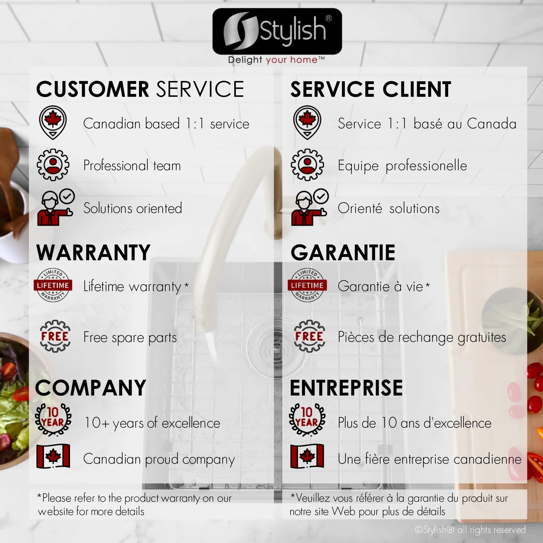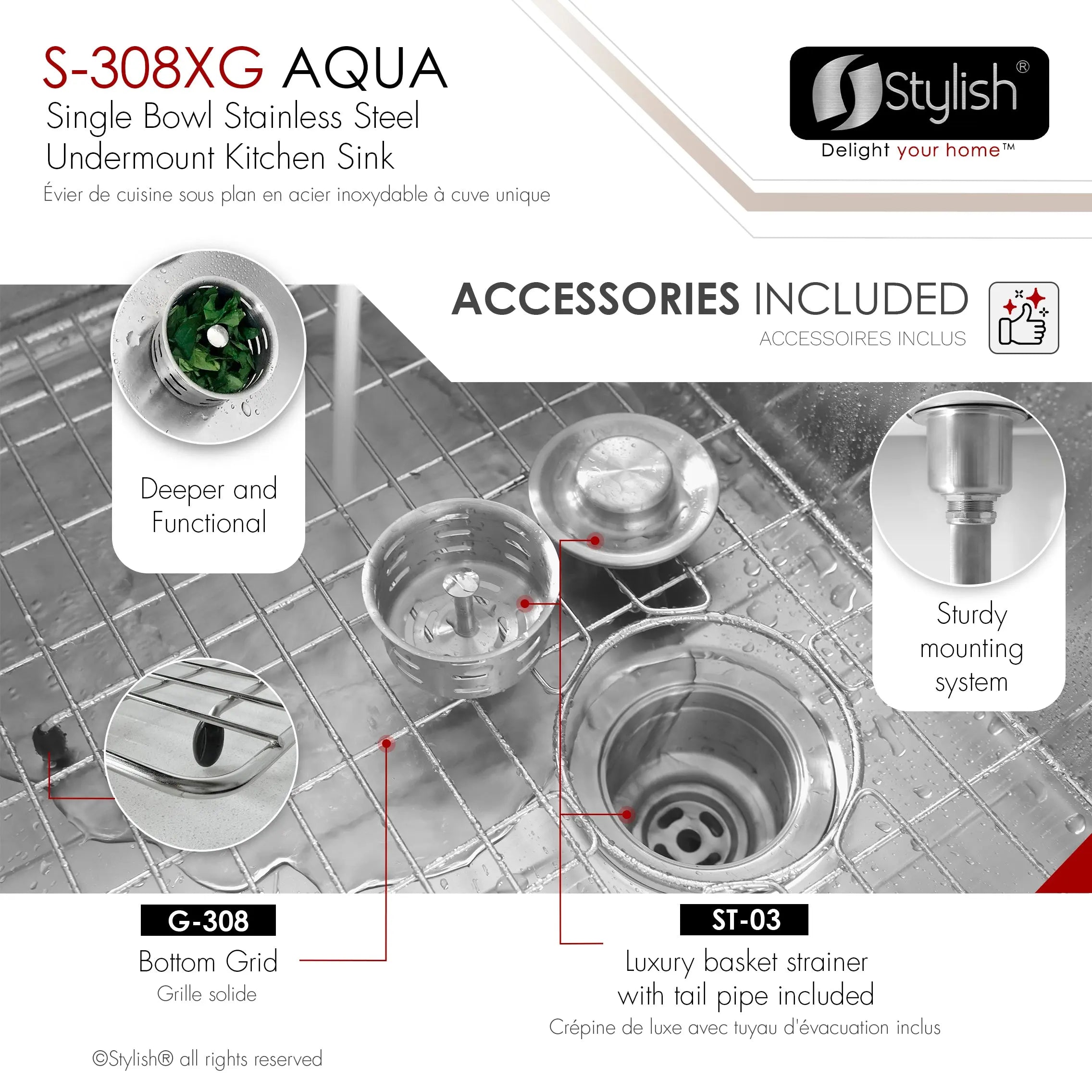 19 in Single Bowl Kitchen Sink, 16 Gauge Stainless Steel with Grid and Basket Strainer, by Stylish® S-308XG Aqua Imagine this stunning 19” x 18” undermount single bowl stainless steel sink as the focal point of your kitchen. Its modern style and rectangular shape adapts into any kitchen style. Not only will this sink add luxury to your space, it is also very functional and easy to maintain. This single bowl undermount kitchen sink is deep and spacious. Extra-deep basins contain splashing and easily accommodate your largest kitchenware, like baking sheets, skillets, and stockpots. A practical choice for a busy kitchen. It is engineered for optimal drainage with channel grooves to prevent water pooling in the bottom of the kitchen sink basin. This stainless steel sink is fully padded and has a noise undercoating sprayed over the extra thick rubber pads, to create a noticeable lower - tone and quieter sink. Handmade of heavy-duty 16 Gauge T-304 Stainless Steel, this kitchen sink is durable and dent-resistant. The commercial grade brushed satin finish is scratch resistant and specially chosen to help hide water spots and maintain a uniform patina finish as the sink ages. For added functionality, this single bowl undermount kitchen sink come with a luxury basket drain strainer, which is deeper and much more functional for catching food scraps than the regular strainers. The sink comes with a drain opening towards the rear, for better utilization of the space under the sink cabinet. Also included with the sink is the cutting template, mounting brackets and a perfect fit stainless steel bottom grid to protect the sink frim dents and scratches. This stainless steel kitchen sink is Canadian designed and meets the highest plumbing standards for North America.