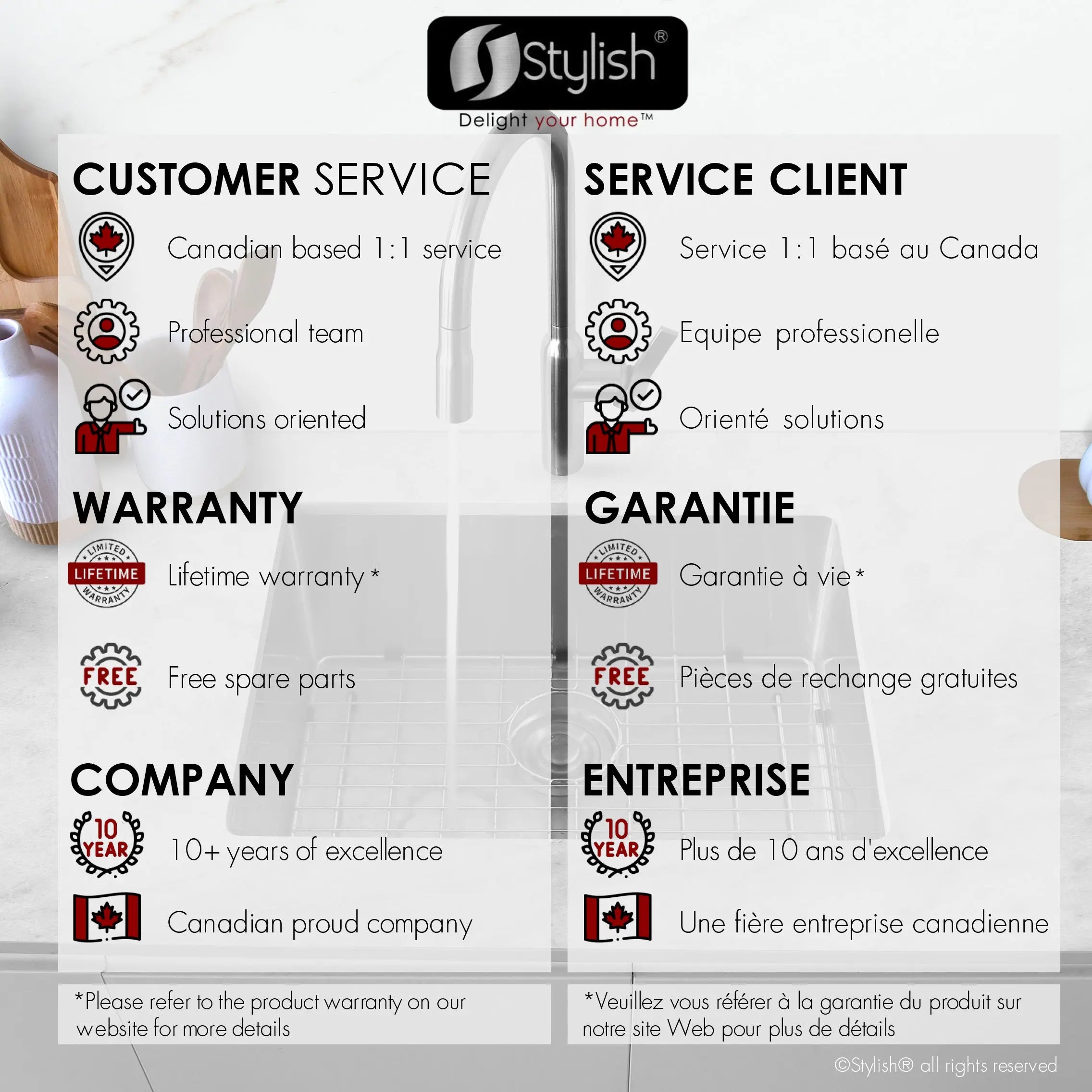 23 in Single Bowl Kitchen Sink, 16 Gauge Stainless Steel with Grid and Basket Strainer, by Stylish® S-307XG Citrine This 23” x 18” single bowl undermount stainless steel kitchen sink is perfect for your kitchen. The sink will give your space a luxurious look thanks to its modern style and rectangular shape. Handmade of surgical grade SUS 304 16G stainless steel, this sleek and luxurious kitchen sink with a brushed satin finish will look amazing in your kitchen! Even after years of constant use, the patina finish of the kitchen sink will never oxidize. The X-pattern drain grooves in this undermount kitchen sink’s basin allow for optimal drainage. the undermount sink will drain and dry quickly and effortlessly. Also, the 10mm radius sink corners are smooth and easy to clean, so that your sink will always be shiny and free of bacteria and unpleasant smells. The stainless steel undermount kitchen sink will not only give your space a luxurious look, it will make your life easier. Keep your cabinets intact. Water condensation in kitchen sinks often causes your cabinets to get ruined. This won’t be a problem if you install the STYLISH undermount sink in your kitchen. The stone guard coating of our stainless steel sinks prevents condensations and keeps your sink quiet. With the sink is included a luxury basket drain strainer, which is deeper than regular strainers and will help trap food and debris easier. Also included with the sink is a cutting template, mounting brackets and a perfect fit stainless steel bottom grid to protect your sink from dents and scratches. Our kitchen sinks are Canadian designed and meet the highest plumbing standards for North America. This functional undermount singe bowl kitchen sink will not make loud noises when the water is on. Thanks to the 2mm and 3mm extra thick pads, this is a very quiet sink. The undermount kitchen sink is equipped with a soundproofing system that will keep your kitchen sink very quiet. The extra deep basins of this double undermount kitchen sink can fit large pots and pans easily. The 10-inch depth is also great because it can hide the dirty dishes under the countertop line until you have the time to wash them. Trusted by architects and builders for upscale projects and modern makeovers, this undermount single bowl stainless steel kitchen sink is what you have been looking for.