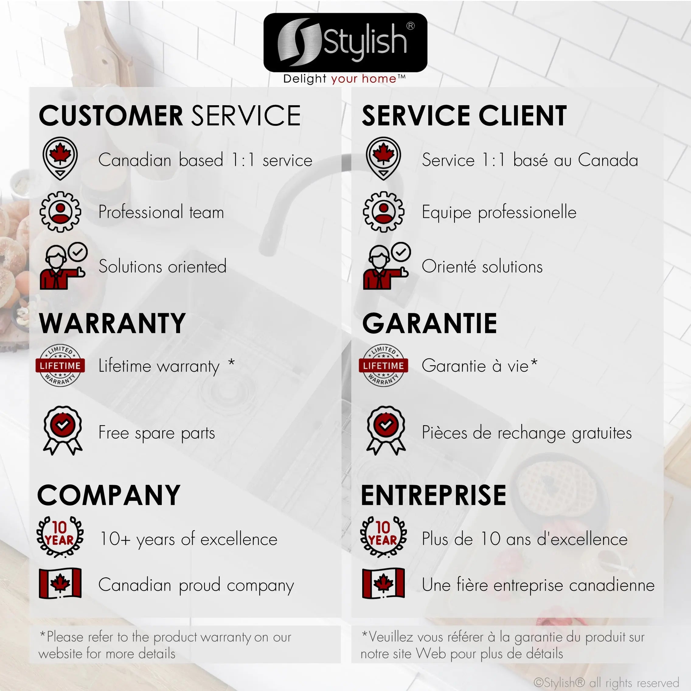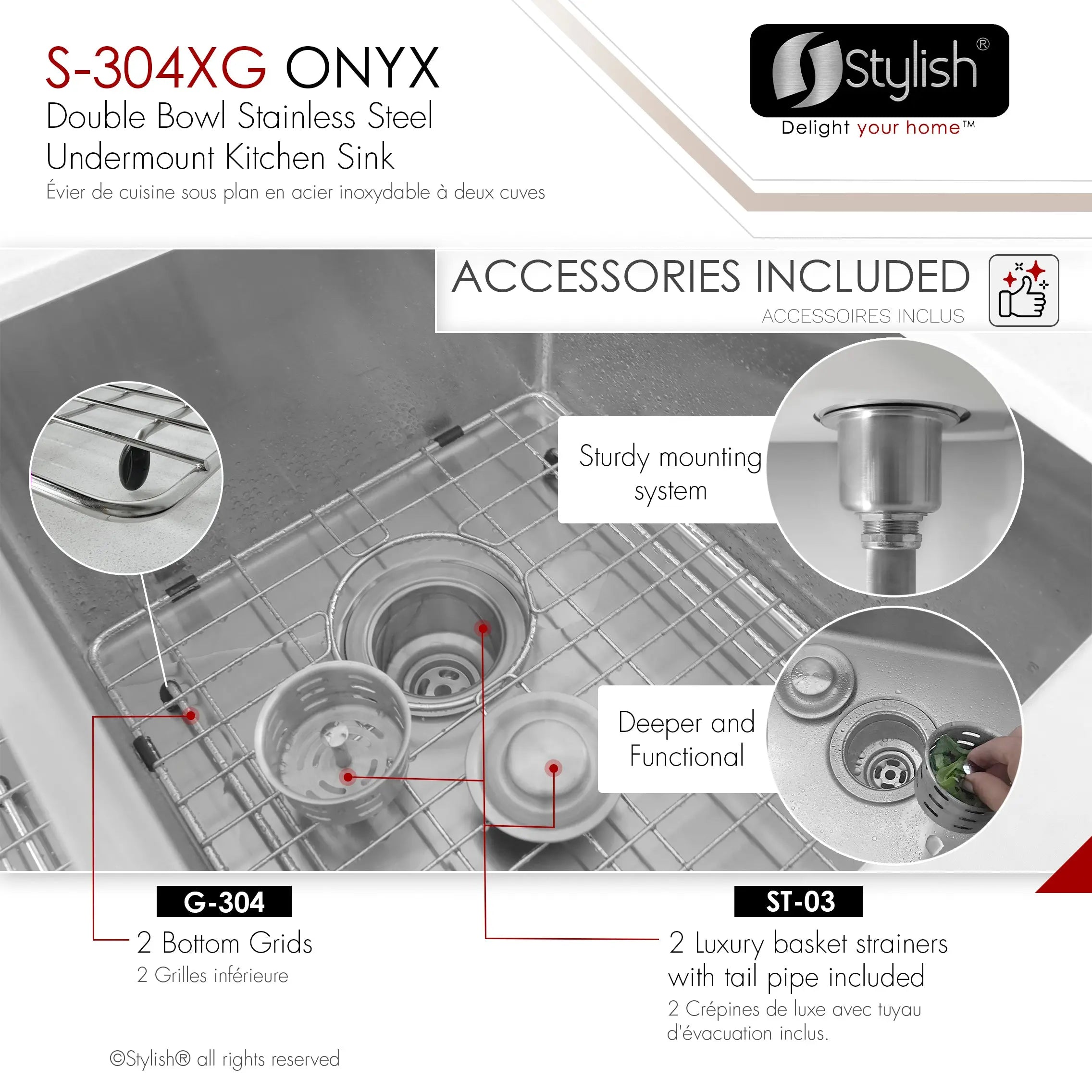 30 in Double Bowl Kitchen Sink, 16 Gauge Stainless Steel with Grids and Basket Strainers, by Stylish® S-304XG Onyx Your kitchen will be delighted with this Canadian designed sink. STYLISH presents you with this 30” x 18” undermount double bowl stainless steel kitchen sink. It includes a 10-inch deep double bowl sink, two luxury basket strainers, cutting template, mounting brackets and two stainless steel protective bottom grids. Making this undermount double bowl sink both stylish and functional. This stainless steel kitchen sink offers a modern, linear style with rectangular bowls and 10mm tight radius in the corners making the sink easy to clean. Made of super thick 16 Gauge T-304 grade stainless steel with a 18:10 Nickel: Chromium content ensuring complete resistance to rusting. The sink is constructed from 16 Gauge stainless steel and comes with thick heavy-duty sound guard padding and spray-coating on the outside on all sides which provides sound insulation against noise and thermal insulation against condensation. The inside of the sink is finished in commercial grade brushed finish which will help to create a uniform patina as the sink ages. This double bowl undermount stainless steel kitchen sink will fit perfectly in any kitchen space.