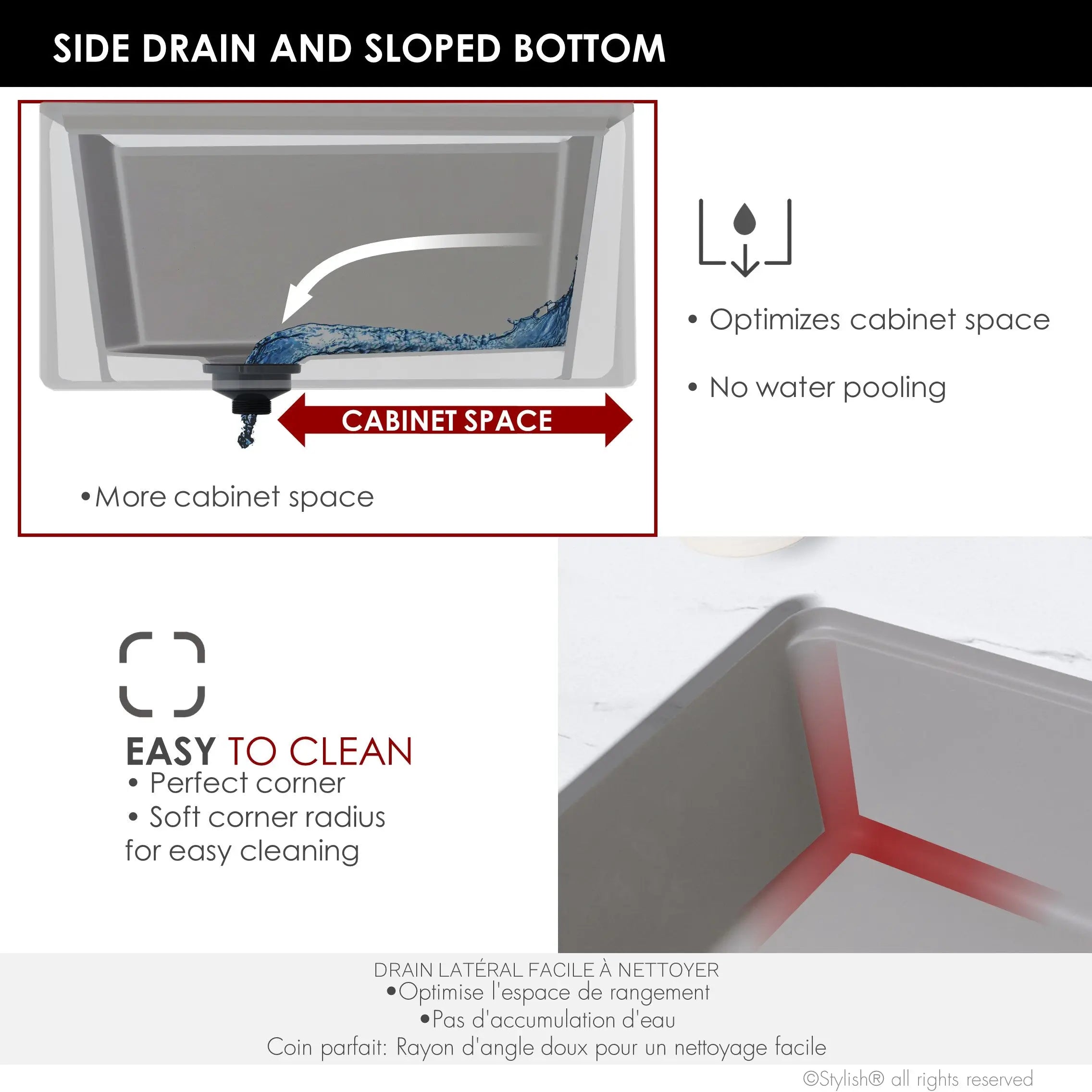 A clever and modern design is part of this stunning composite granite apron workstation kitchen sink. Rock your kitchen experience with the included standard strainer, metal colander, and perfect-fit cutting board. This amazing 30-inch single bowl under-mount composite granite apron sink is made with 80% natural quartz, making this stone-like sink exceptionally durable and low maintenance. This sink material is great for handling your everyday demands. If that wasn't enough, it has been cleverly designed with a ledge that allows the kitchen sink accessories to perfectly fit on top of the kitchen sink, saving space and adding functionality. This single-bowl granite apron kitchen sink is highly resistant to dirt and scratches and easy to clean and maintain.