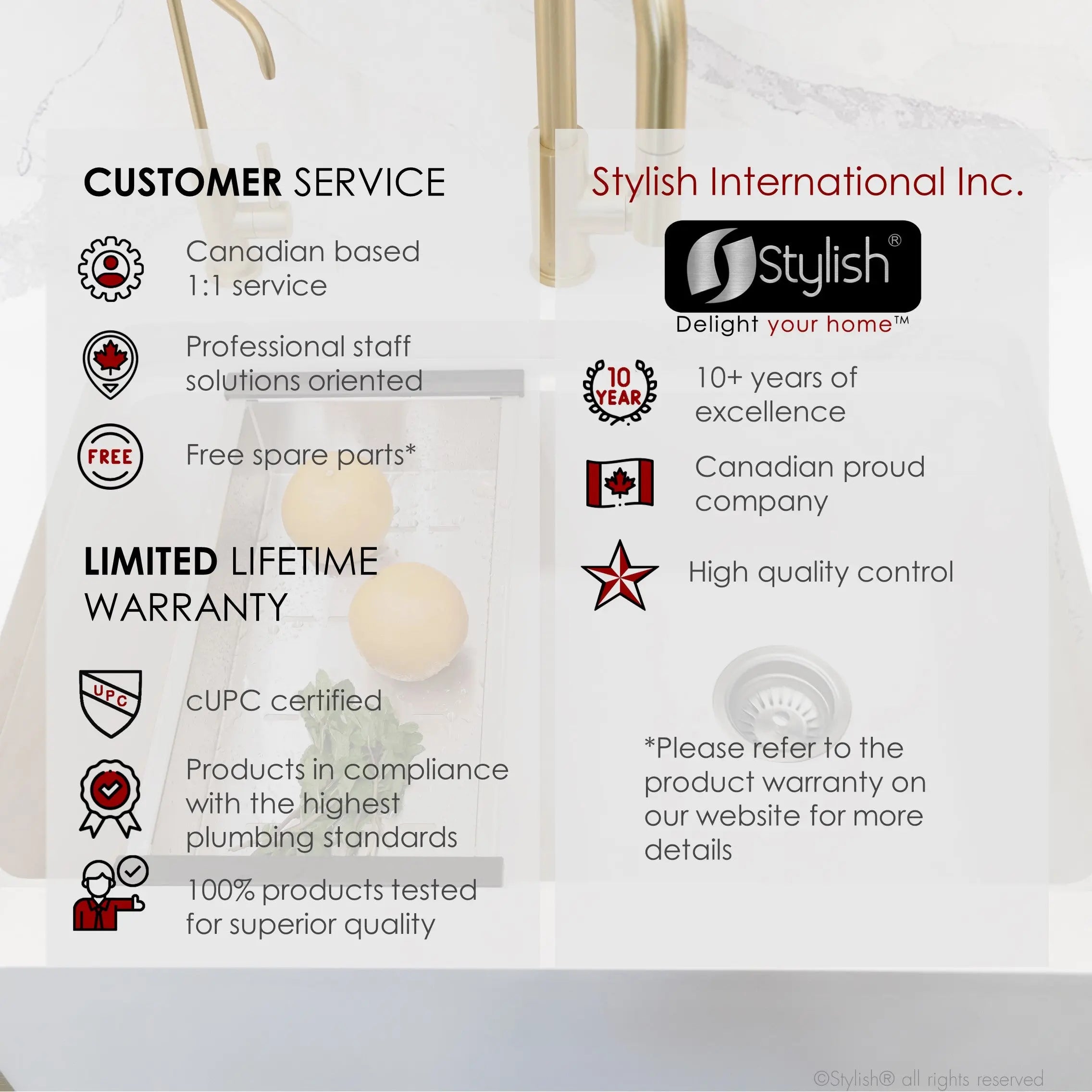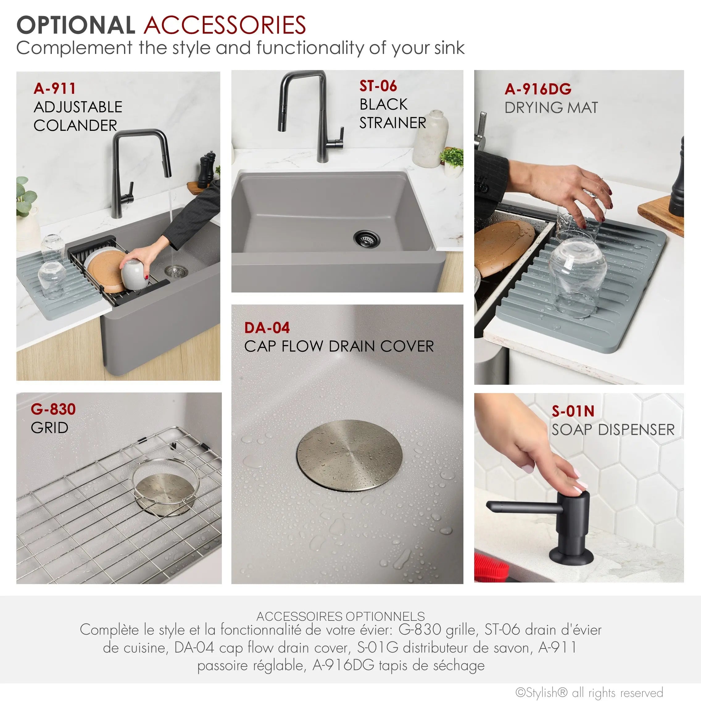 Complement the style and functionality of your sink with our accessories, designed to perfectly fit your single bowl dual mount composite granite sink while offering great convenience. The sink includes these high-quality accessories: