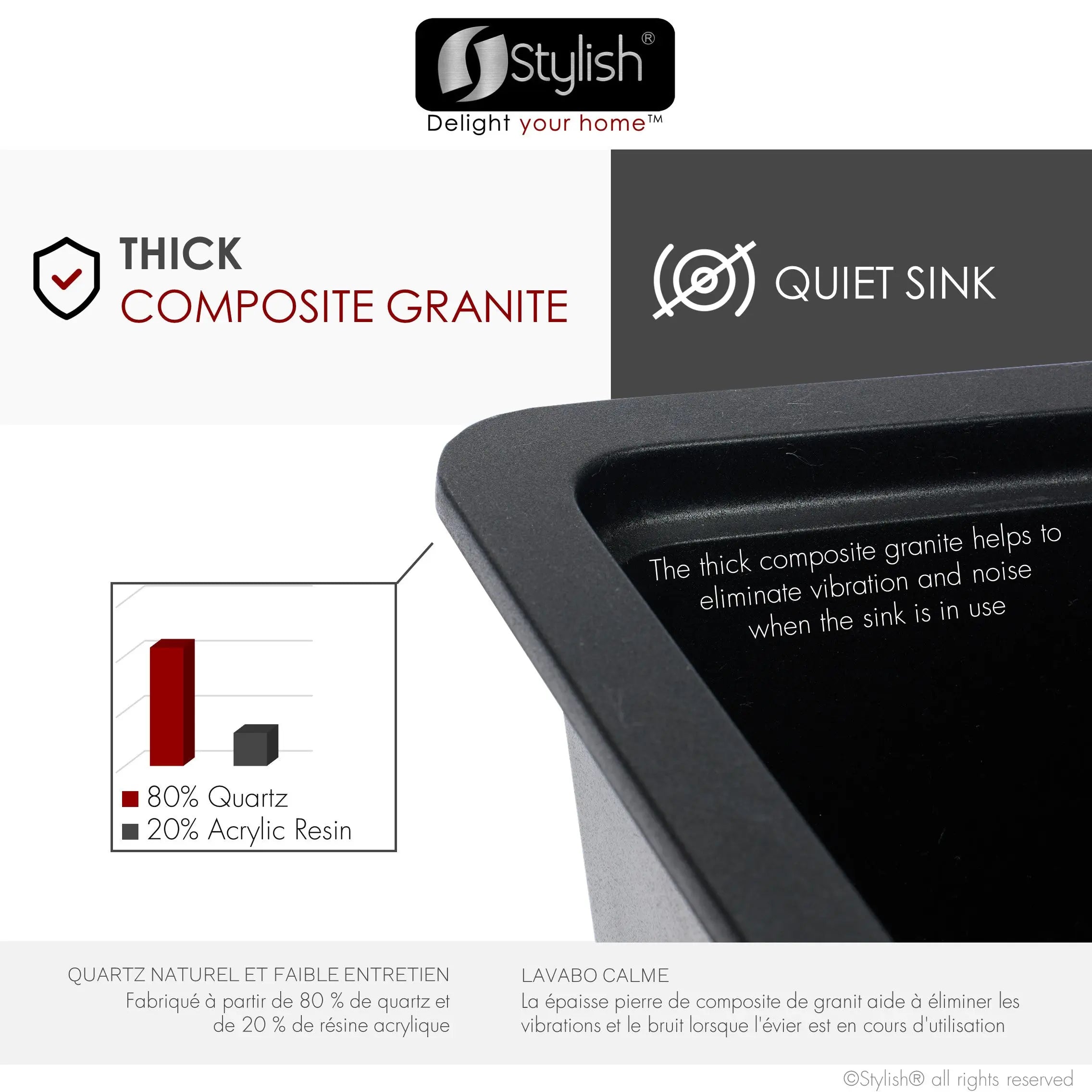 The thick composite granite helps to eliminate vibration and noise when the sink is in use, ensuring that turning on your faucet won't ever be anything less than enjoyable.