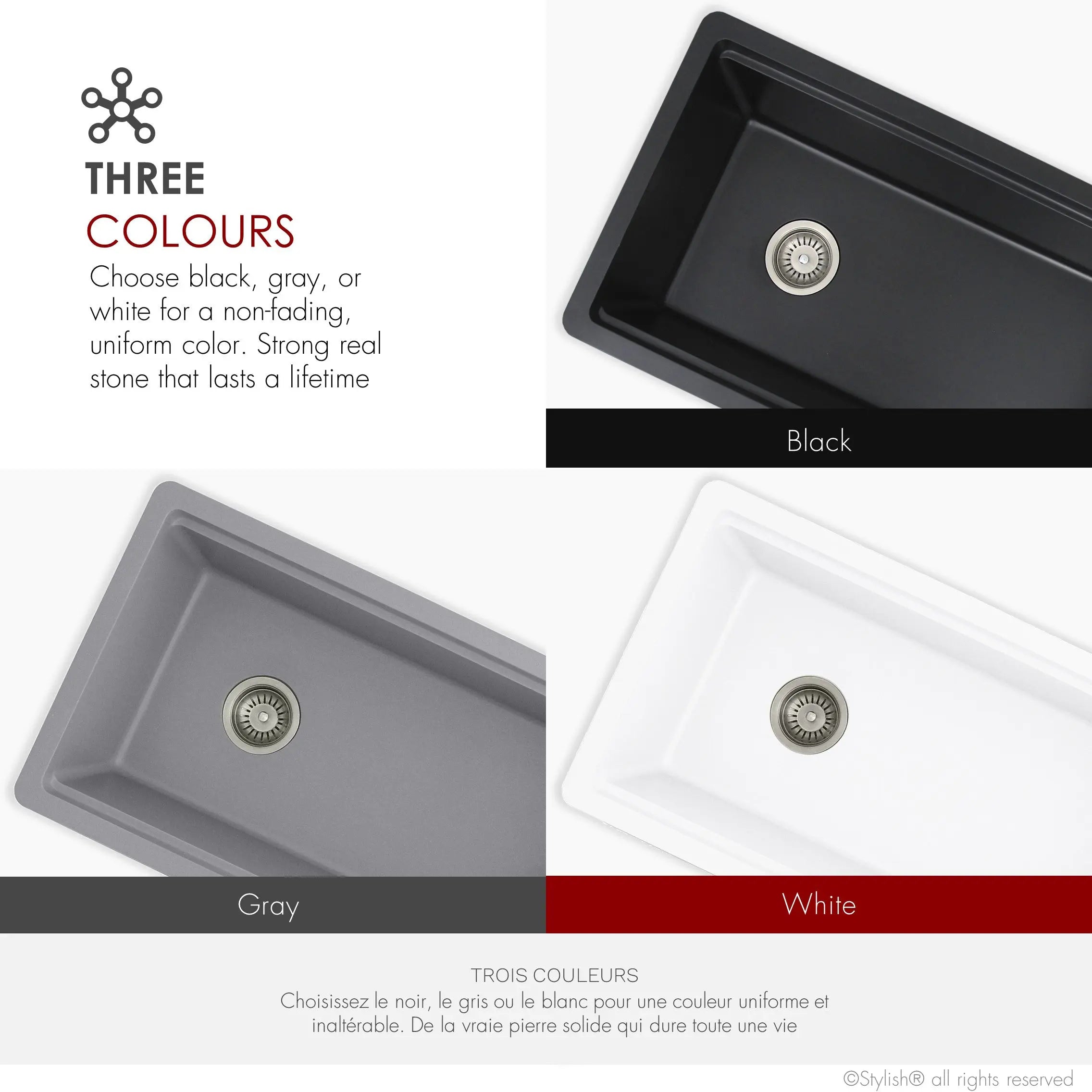 Choose between Black, Gray, or White. Whichever you choose, we can promise non-fading and uniform color will last a lifetime, with the look and feel of real stone.