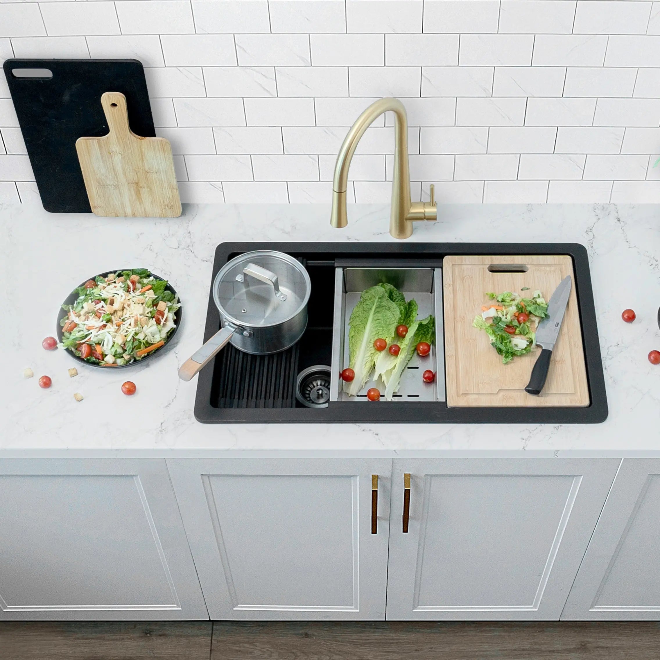 This composite granite kitchen sink comes with great accessories that slide across the built-in ledge, saving space on the kitchen countertop and helping you use your space to the fullest.