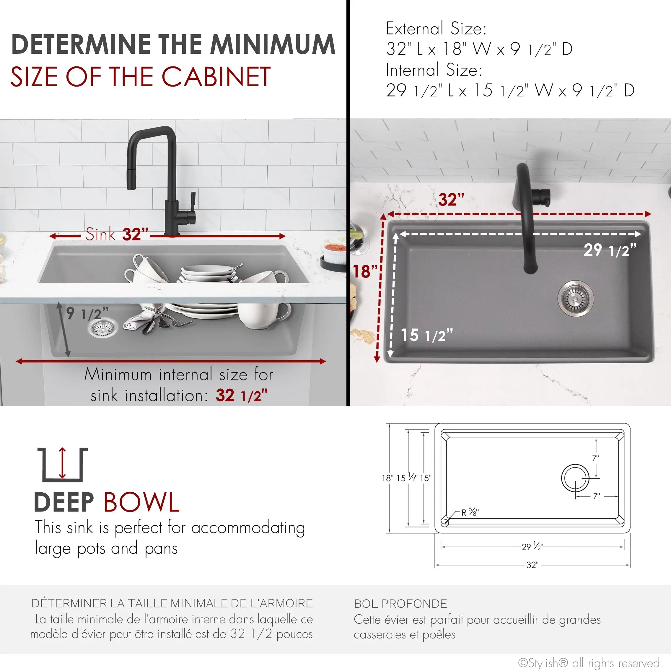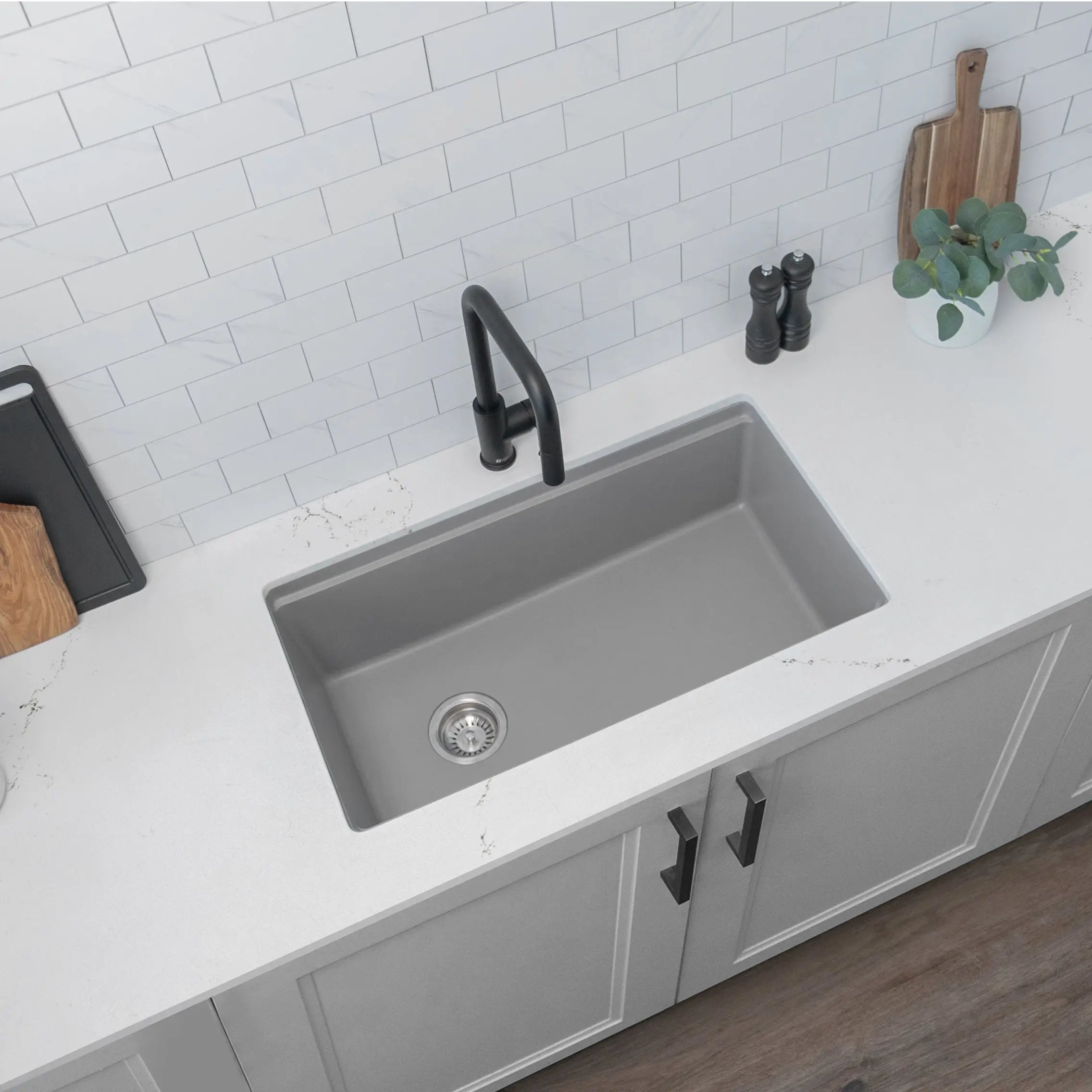 A clever and modern design is part of this stunning granite workstation kitchen sink. Rock your kitchen experience with the included standard strainer, roll-up drying rack, stainless steel colander, and perfect-fit bamboo cutting board. This amazing 32-inch single bowl dual mount composite granite kitchen sink is made with 80% natural quartz, making this sink exceptionally durable and low-maintenance, with a stone-like material that is much lighter than solid granite, but still great for handling your everyday demands.