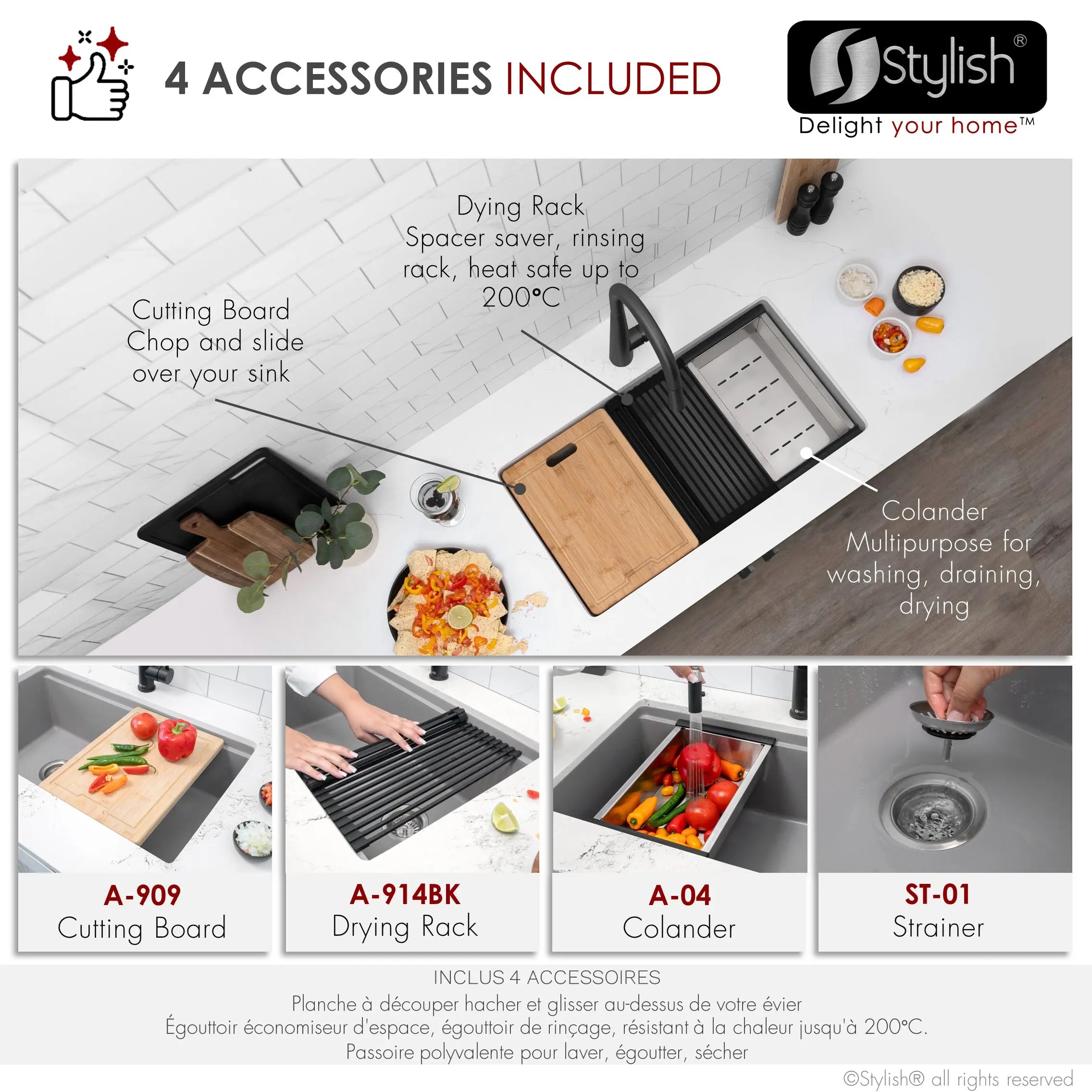 Complement the style and functionality of your sink with our accessories, designed to perfectly fit your single bowl dual mount composite granite sink while offering great convenience. The sink includes these high-quality accessories: