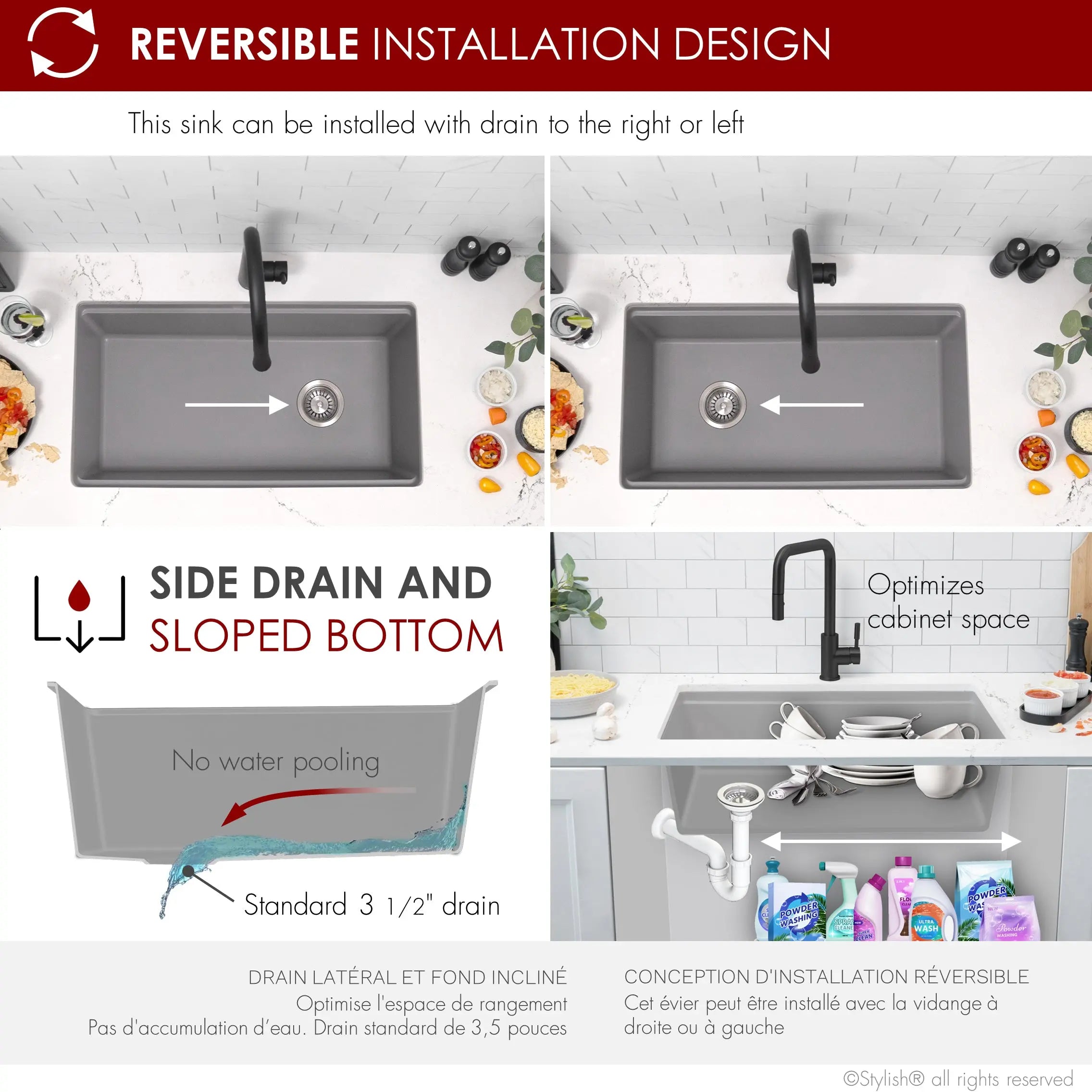 Designed with the ability to flip the sink around to switch whether the drain is on the left or right, giving you the freedom to choose whatever is convenient for your plumbing.