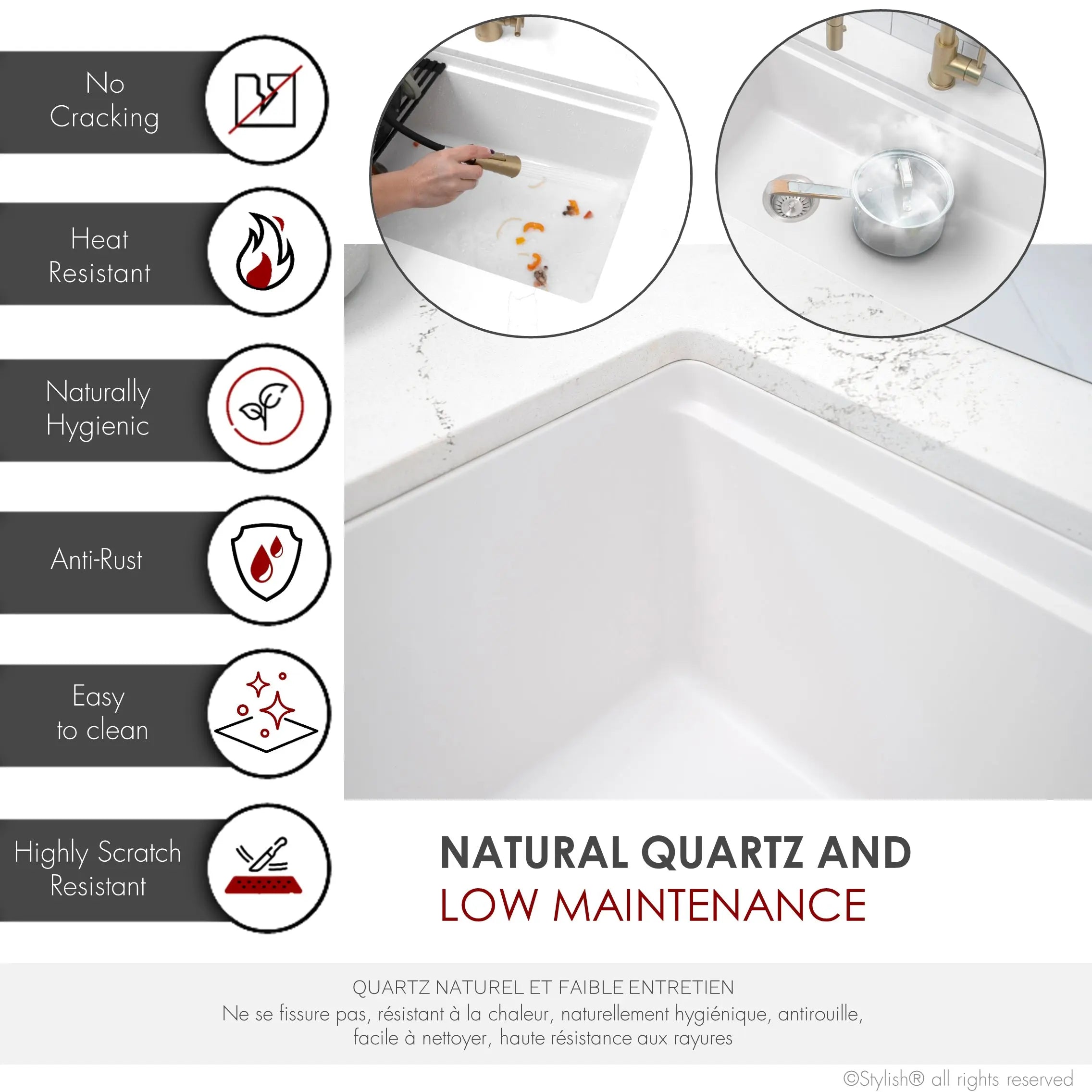 Made from 80% Quartz and 20% Acrylic Resin, this specially hardened composite is highly stain, scratch, heat, and dent-resistant, and is also extremely easy to clean and maintain.