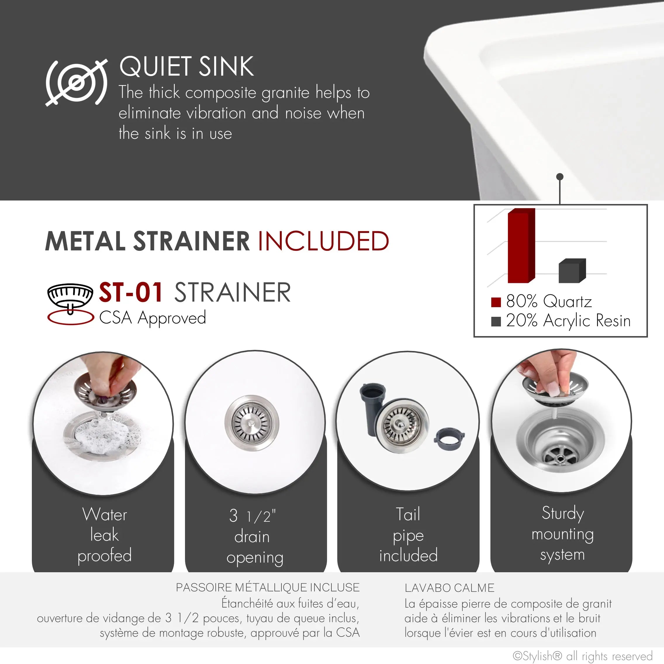 Complement the style and functionality of your sink with our accessories, designed to perfectly fit your single bowl dual mount composite granite sink while offering great convenience. The sink includes these high-quality accessories:
