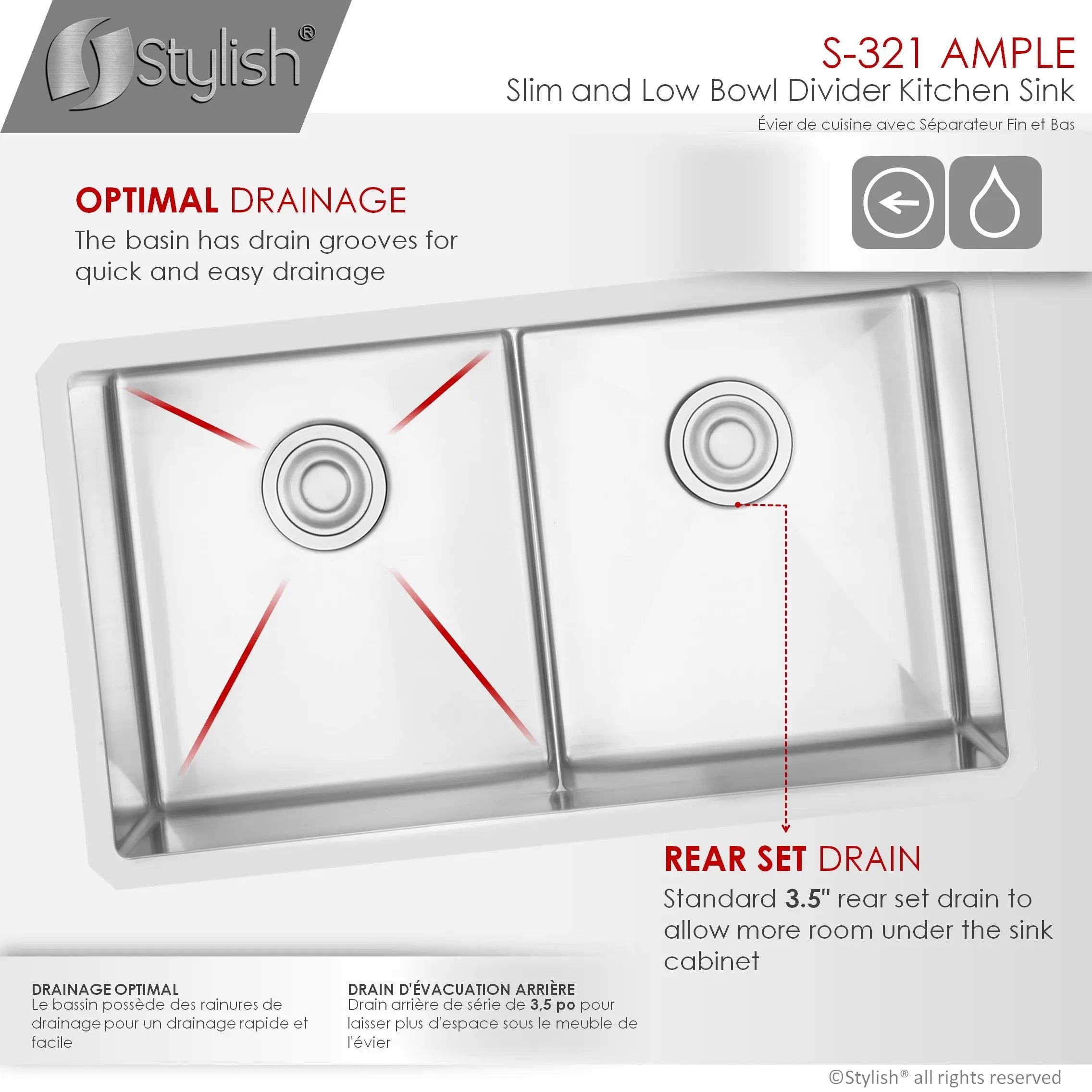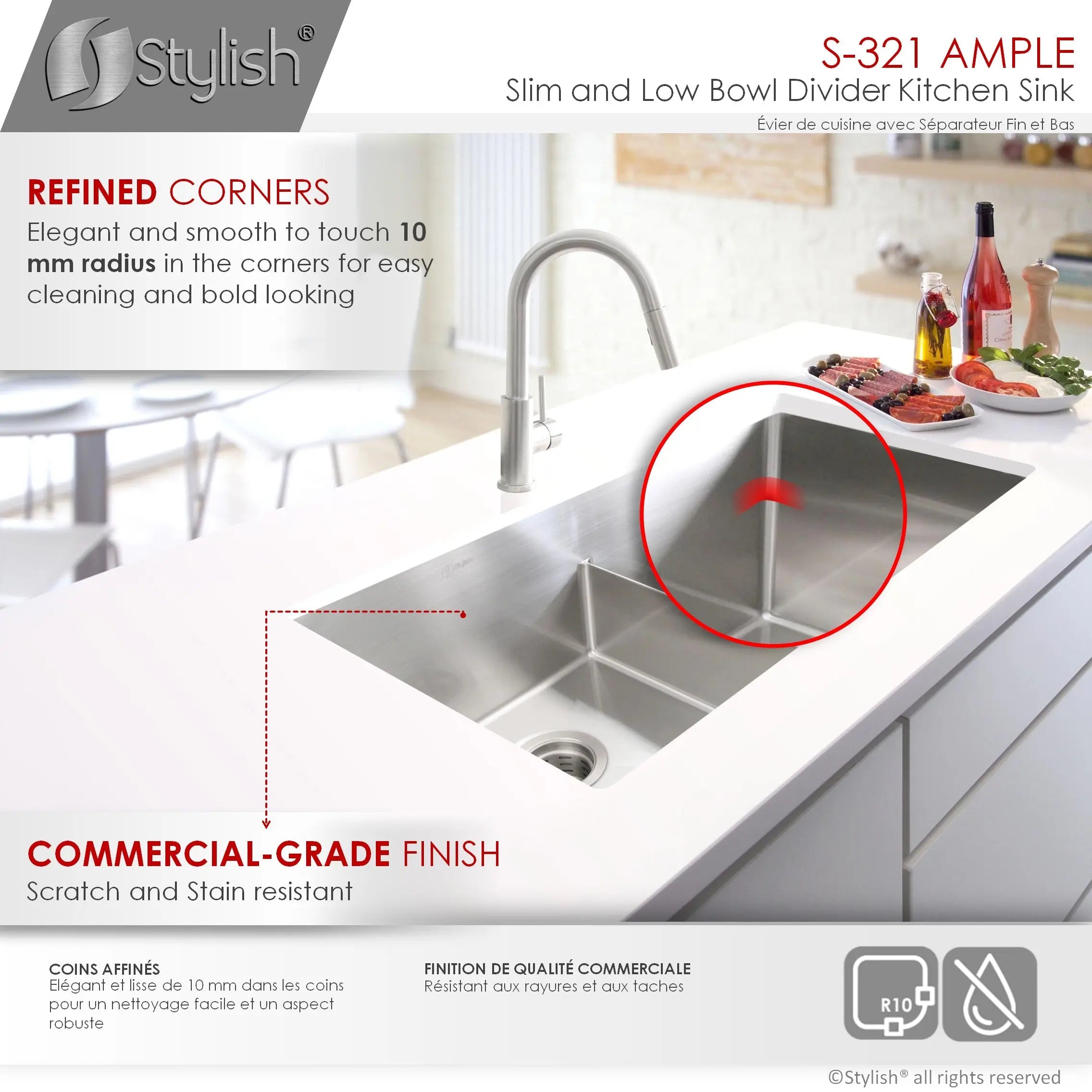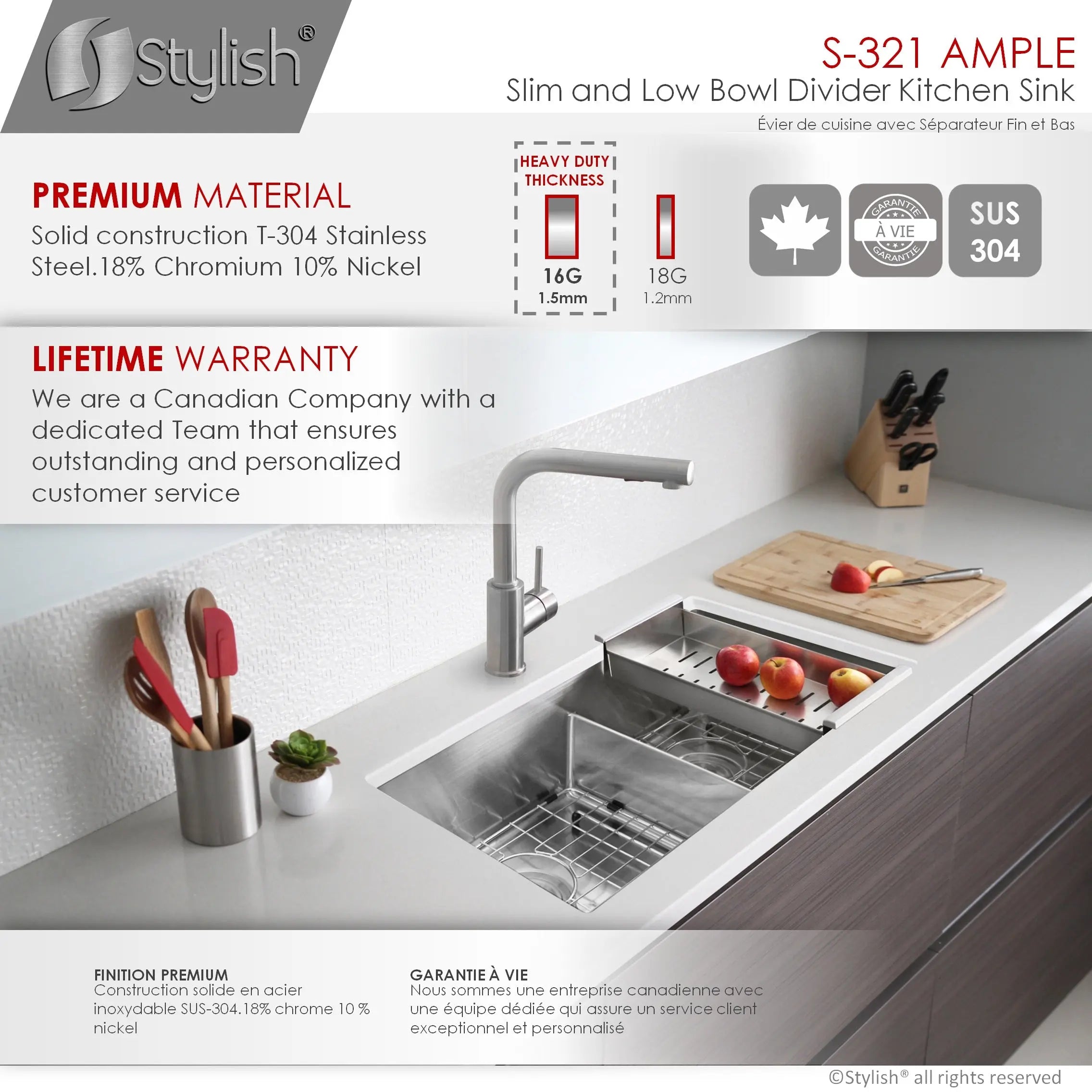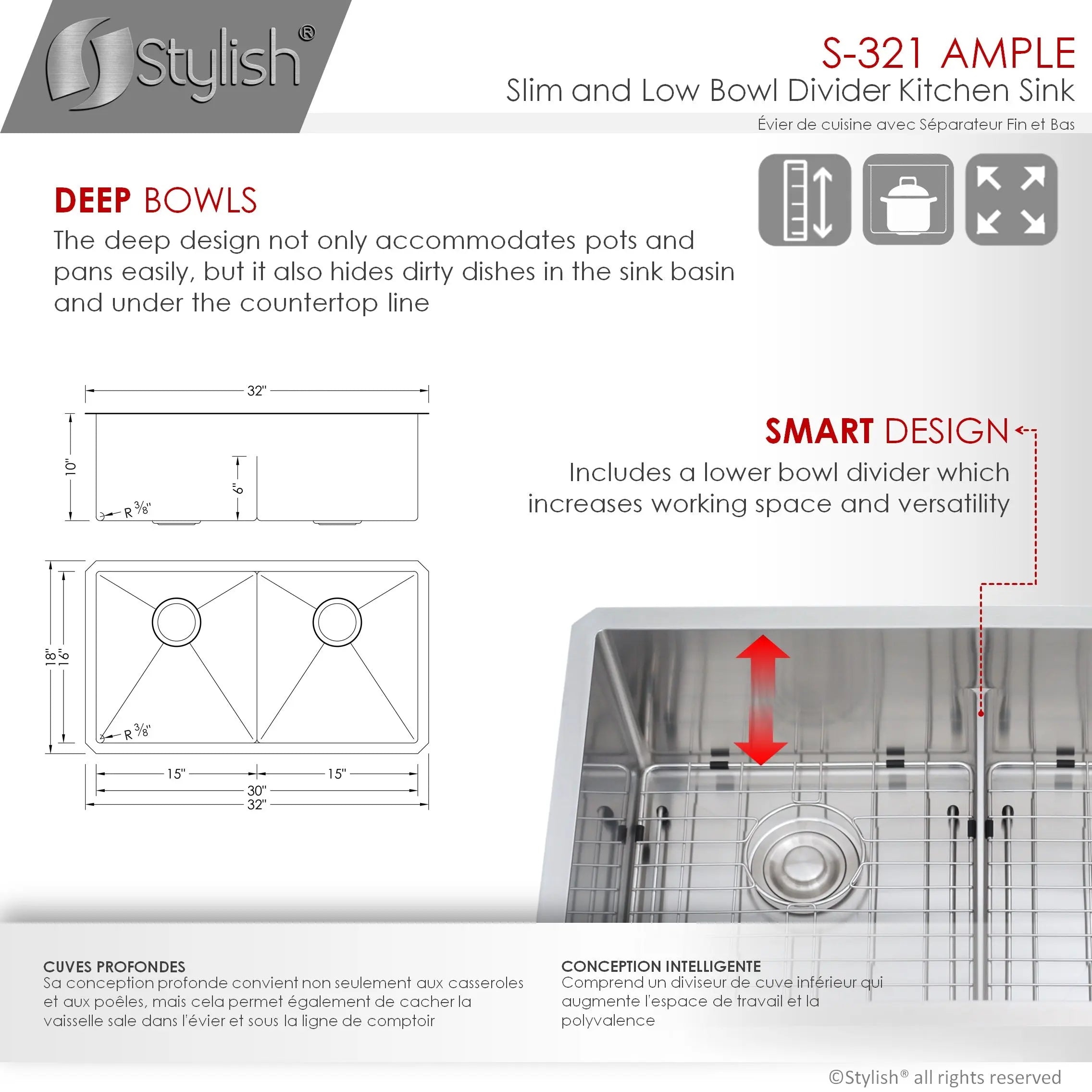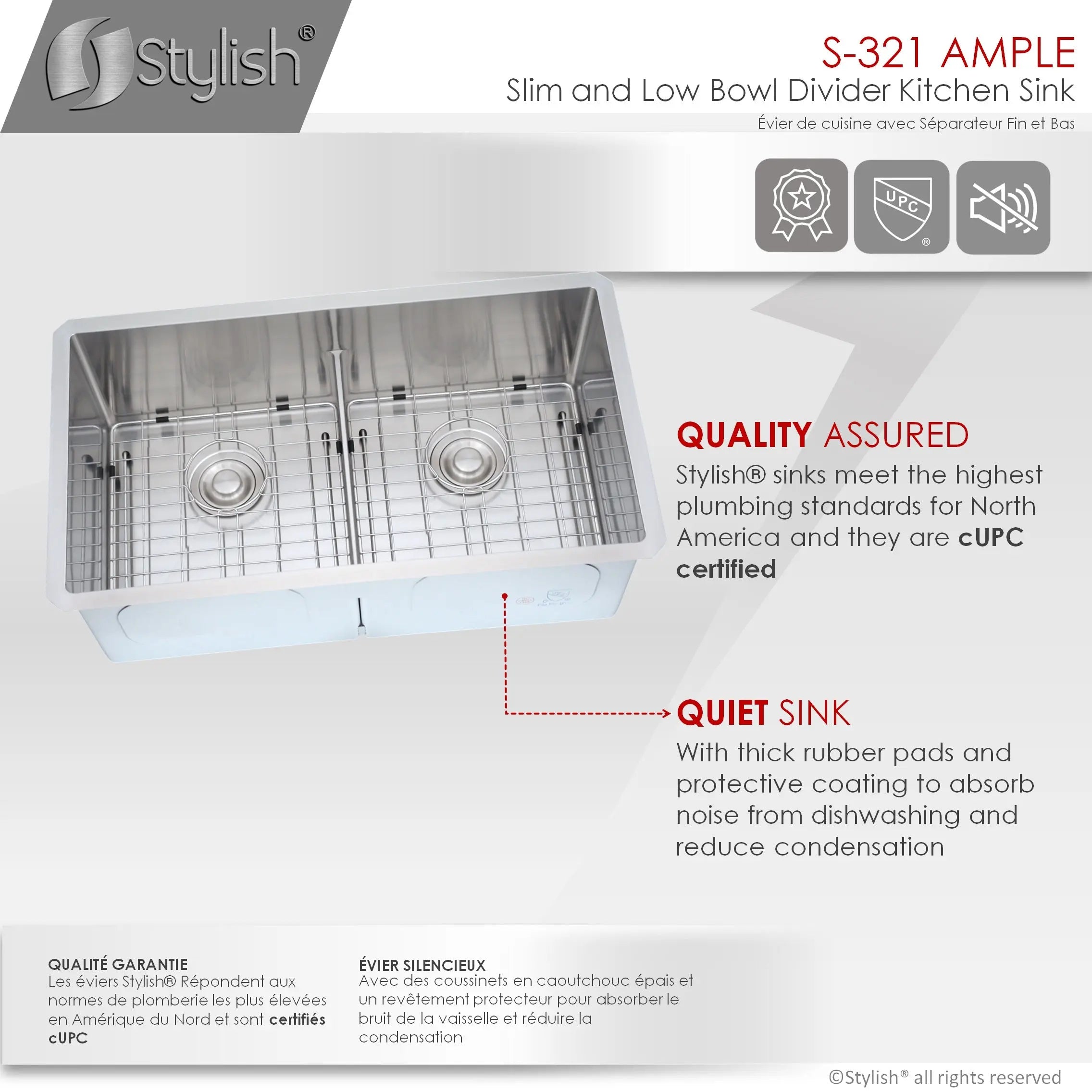 32 in Double Bowl Kitchen Sink, 16 Gauge Stainless Steel with Grids and Basket Strainers, by Stylish® S-321XG Ample Professionally designed with functionality in mind, this 32inch x 18inch undermount double bowl slim low divider kitchen sink is everything you need when it comes to functionality for your kitchen. This undermount double bowl kitchen sink comes with a slim low divider. The slim low divider design is a genius innovation to give you a double bowl sink without banging! It splits the sink into two bowls with a dividing short wall allowing you to rotate your large pans from side to side and wash a cookie sheet without a problem, just as if you were using with a single bowl sink. This design is the perfect blend of a double and a single bowl sink. The openness of a single bowl combined with the divided functionality of a double bowl. Get the best of both with this clever design. The divider in the middle will not get in the way while washing dishes and large pots, pans, and baking sheets. Your kitchen needs this Canadian designed sink. It includes a 10-inch deep double bowl sink, two luxury basket drain strainers, cutting template, mounting brackets and two stainless steel protective bottom grids; making this undermount double bowl sink both stylish and functional. This stainless steel kitchen sink with slim low divider offers a modern, linear style with rectangular bowls and 10mm tight radius in the corners making the sink easy to clean. Made of 16 Gauge T-304 grade stainless steel with a 18:10 Nickel: Chromium content ensuring complete resistance to rust. The sink is constructed from 16 Gauge stainless steel and comes with thick heavy-duty sound guard padding and spray-coating on the outside on all sides which provides sound insulation against noise and thermal insulation against condensation. The inside of the sink is finished in commercial grade brushed finish which will help to create a uniform patina as the sink ages. This double bowl undermount stainless steel kitchen sink will fit perfectly in any 34” cabinet kitchen space. Add more functionality into your kitchen with this amazing undermount double bowl kitchen sink with a slim low divider.