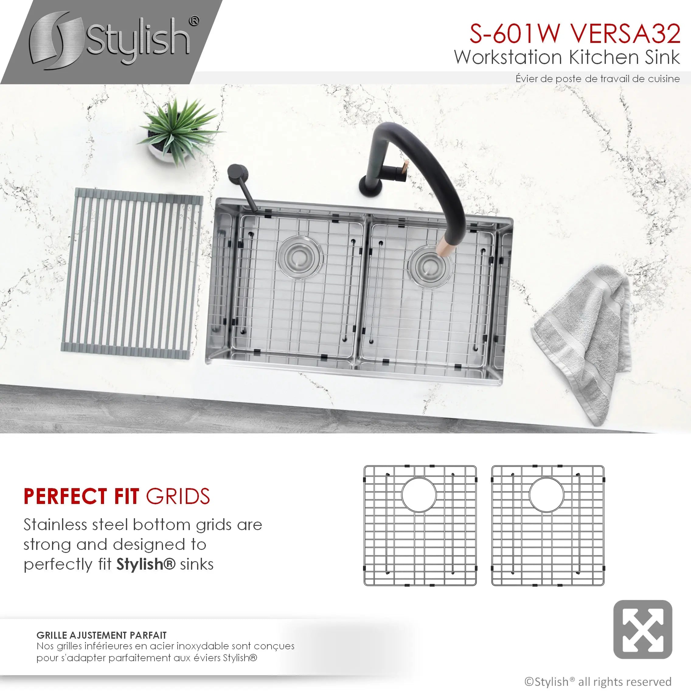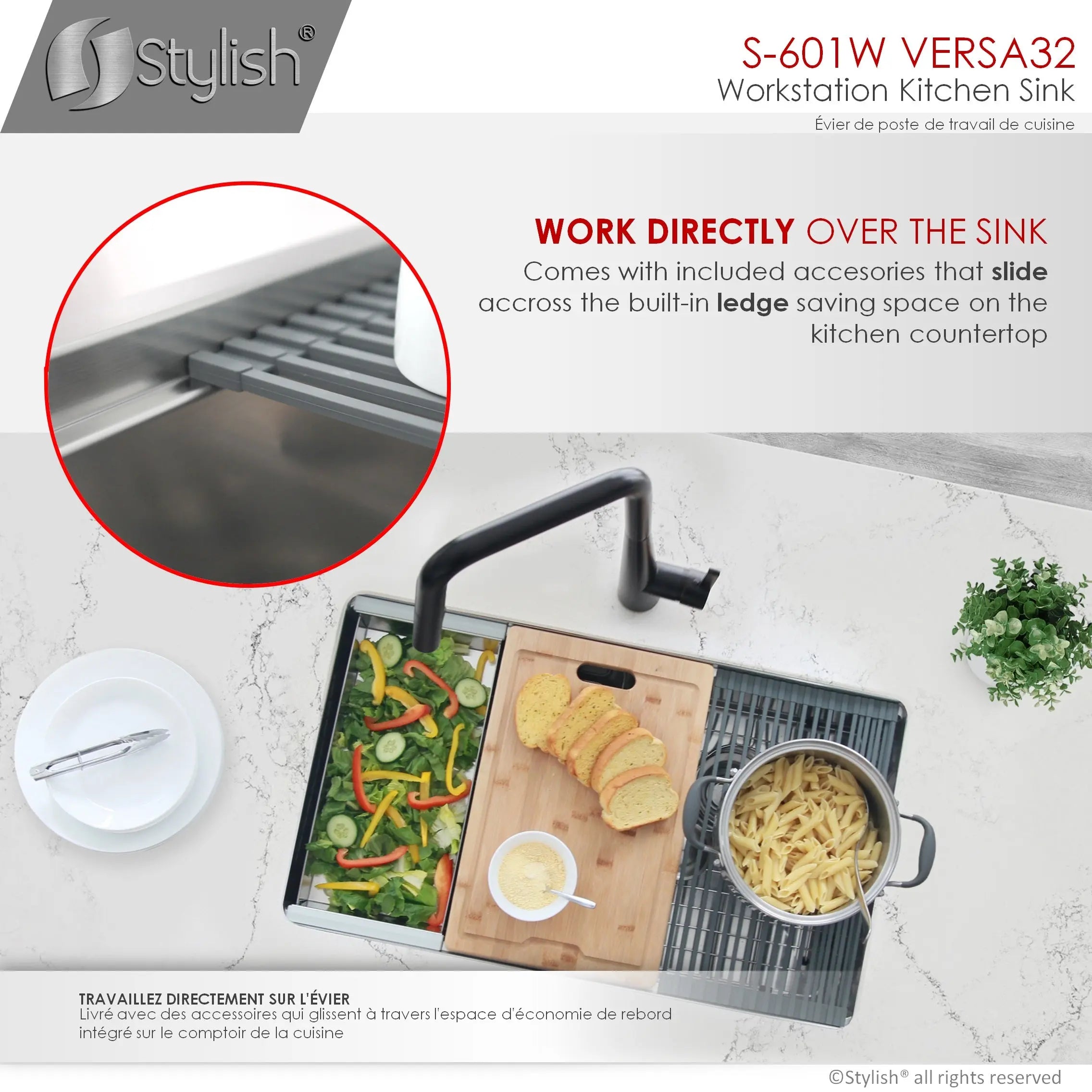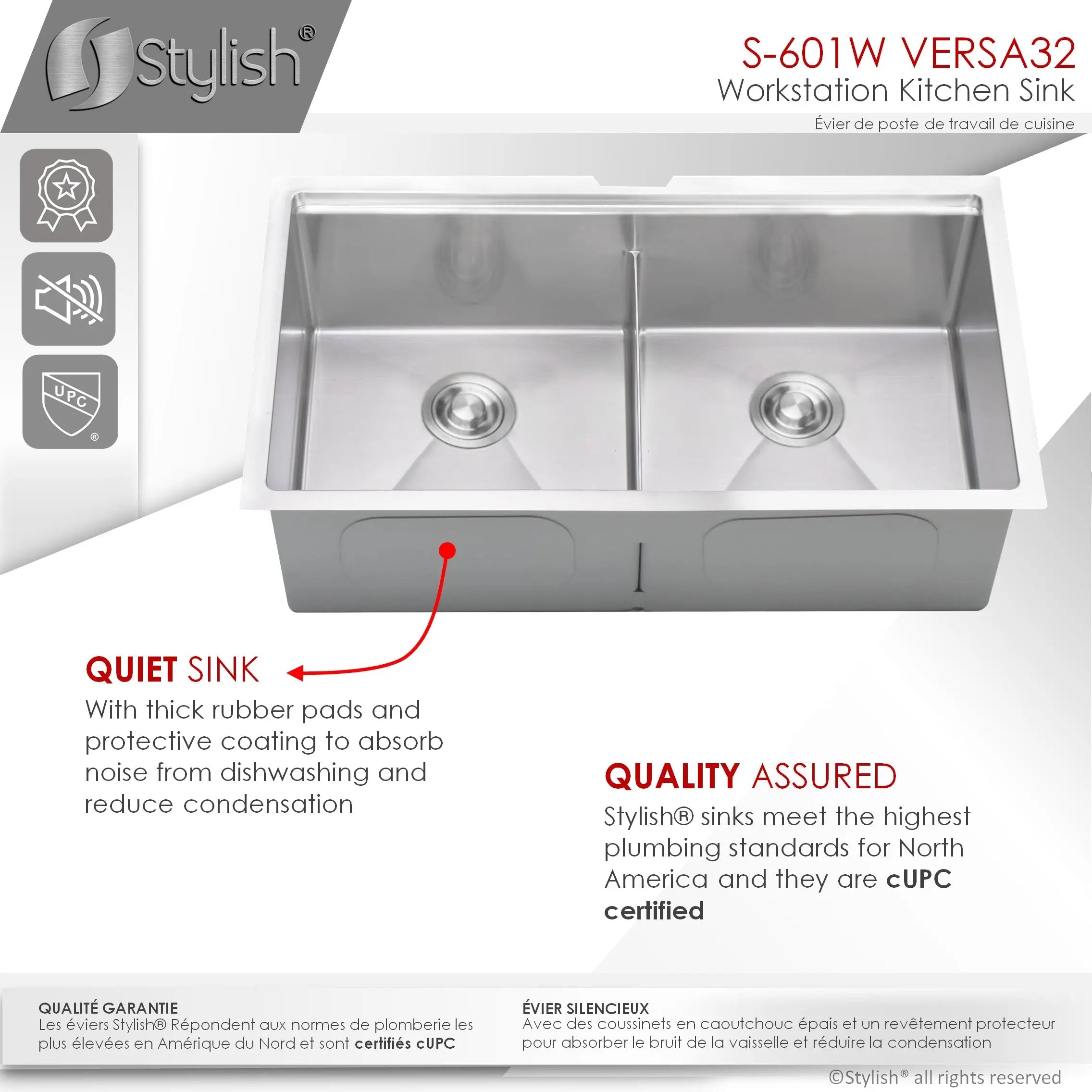32 inch Workstation Double Bowl Undermount 16 Gauge Stainless Steel Kitchen Sink with Built in Accessories, by Stylish® S-601W Versa32 This kitchen sink workstation combines the best of both worlds: a stainless steel double bowl kitchen sink with a slim and low divider for convenient space usage, and a functional ledge sink with built-in accessories (colander, roll-up drying rack and cutting board) that slide on the integrated tracks of the sink to streamline meal prep and clean up without losing space on your countertop. This 16G stainless still workstation sink includes a stainless-steel COLANDER that you can use for straining, draining, sieving, and filtering tasks like straining fruits, vegetables and draining cooked pasta. This kitchen sink with CUTTING BOARD made of high-quality anti-microbial and BPA free bamboo will make it easy to chop any food, cut fruits and veggies over the sink. This ledge kitchen sink also contains a DRYING RACK convenient for drying or rinsing vegetables, fruits, dishware, knife, glasses and cups.All Stylish sinks are equipped with a soundproofing system including a protective coating and extra-thick rubber pads to create a noticeable lower tone and overall a very quiet sink. This coat is sprayed underneath the sink to prevent water condensation. For added functionality, Stylish® VERSA workstation kitchen sinks come with luxury basket drain strainers, which are deeper and much more functional for catching food scraps than the regular strainers. Stylish® sinks are Canadian designed and meet the highest plumbing standards for North America. The sinks have drains towards the rear, for better utilization of the space under the sink cabinet. Also, sink basins have drain grooves for optimal drainage.Stylish handmade stainless steel sinks combine functionality, quality and affordability. Made of surgical-grade SUS 304 stainless steel in 16 Gauge, with an optimized 18pct Chromium and 10pct Nickel content to provide excellent strength and hardness. The specially chosen satin finish will hide water spots and maintain a uniform patina finish as the sink ages. The extra-deep basin accommodates pots and pans easily and hides dirty dishes in the sink basin and under the countertop line. The tight-10mm radius corners are perfectly blended through an automated machine buffing system and careful hand-polished, for a luxurious finish. This sink comes with two bottom grids, bamboo cutting board, colander and a roll-up drying rack