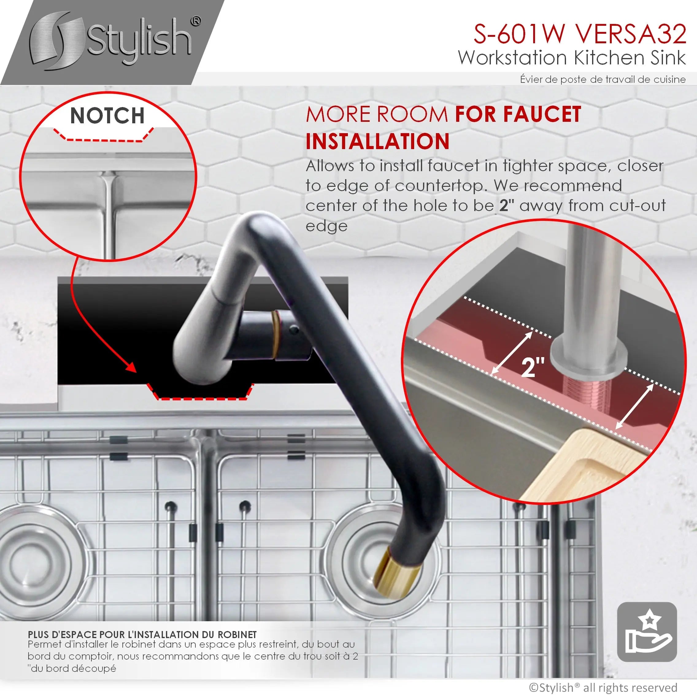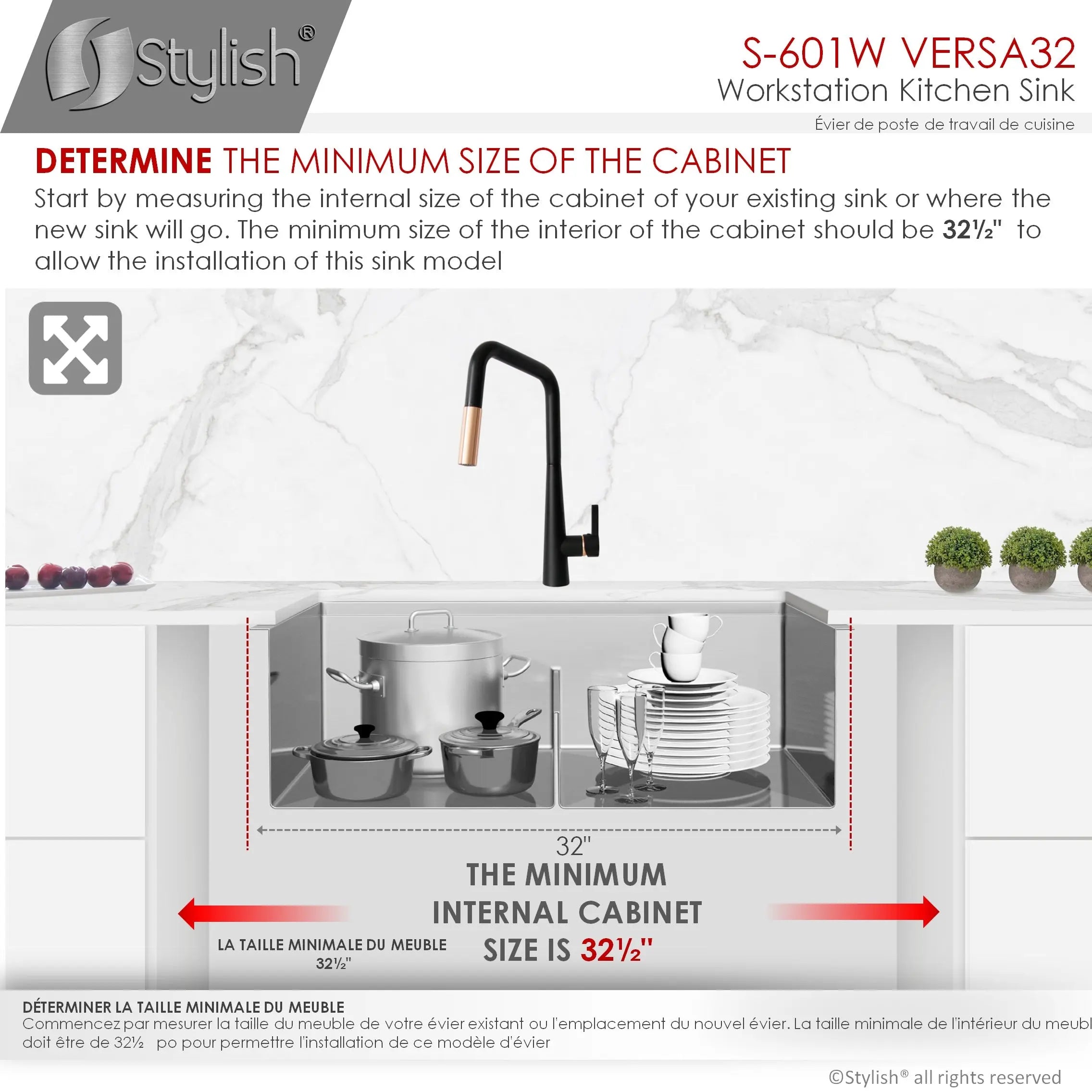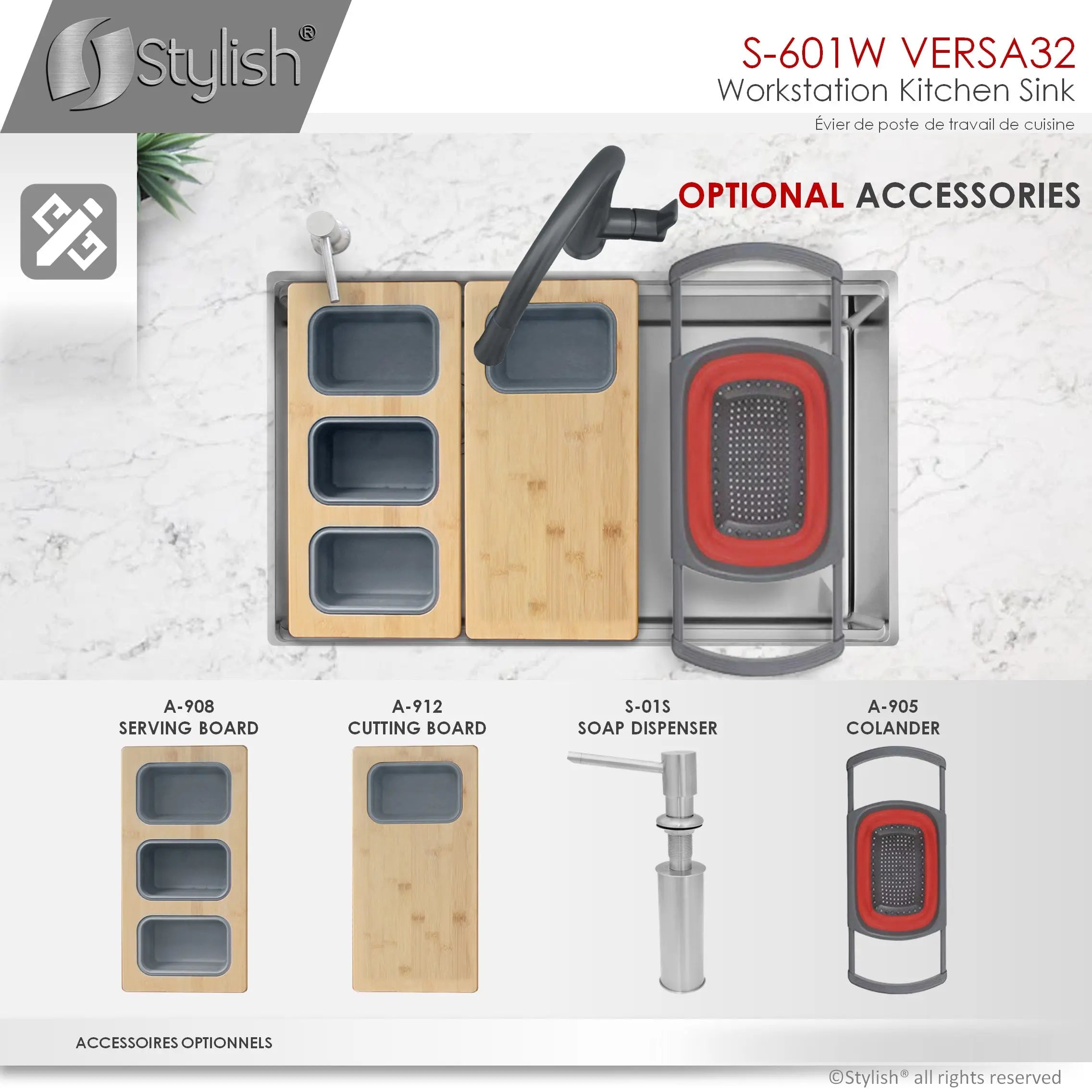 32 inch Workstation Double Bowl Undermount 16 Gauge Stainless Steel Kitchen Sink with Built in Accessories, by Stylish® S-601W Versa32 This kitchen sink workstation combines the best of both worlds: a stainless steel double bowl kitchen sink with a slim and low divider for convenient space usage, and a functional ledge sink with built-in accessories (colander, roll-up drying rack and cutting board) that slide on the integrated tracks of the sink to streamline meal prep and clean up without losing space on your countertop. This 16G stainless still workstation sink includes a stainless-steel COLANDER that you can use for straining, draining, sieving, and filtering tasks like straining fruits, vegetables and draining cooked pasta. This kitchen sink with CUTTING BOARD made of high-quality anti-microbial and BPA free bamboo will make it easy to chop any food, cut fruits and veggies over the sink. This ledge kitchen sink also contains a DRYING RACK convenient for drying or rinsing vegetables, fruits, dishware, knife, glasses and cups.All Stylish sinks are equipped with a soundproofing system including a protective coating and extra-thick rubber pads to create a noticeable lower tone and overall a very quiet sink. This coat is sprayed underneath the sink to prevent water condensation. For added functionality, Stylish® VERSA workstation kitchen sinks come with luxury basket drain strainers, which are deeper and much more functional for catching food scraps than the regular strainers. Stylish® sinks are Canadian designed and meet the highest plumbing standards for North America. The sinks have drains towards the rear, for better utilization of the space under the sink cabinet. Also, sink basins have drain grooves for optimal drainage.Stylish handmade stainless steel sinks combine functionality, quality and affordability. Made of surgical-grade SUS 304 stainless steel in 16 Gauge, with an optimized 18pct Chromium and 10pct Nickel content to provide excellent strength and hardness. The specially chosen satin finish will hide water spots and maintain a uniform patina finish as the sink ages. The extra-deep basin accommodates pots and pans easily and hides dirty dishes in the sink basin and under the countertop line. The tight-10mm radius corners are perfectly blended through an automated machine buffing system and careful hand-polished, for a luxurious finish. This sink comes with two bottom grids, bamboo cutting board, colander and a roll-up drying rack