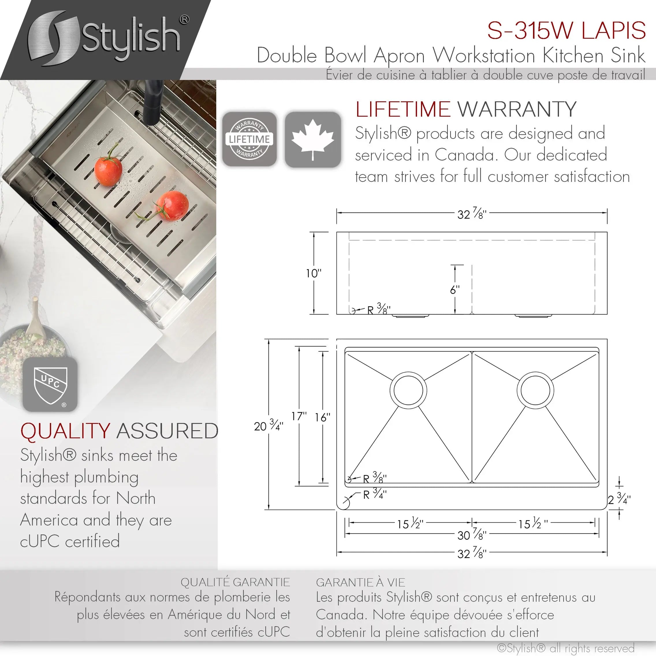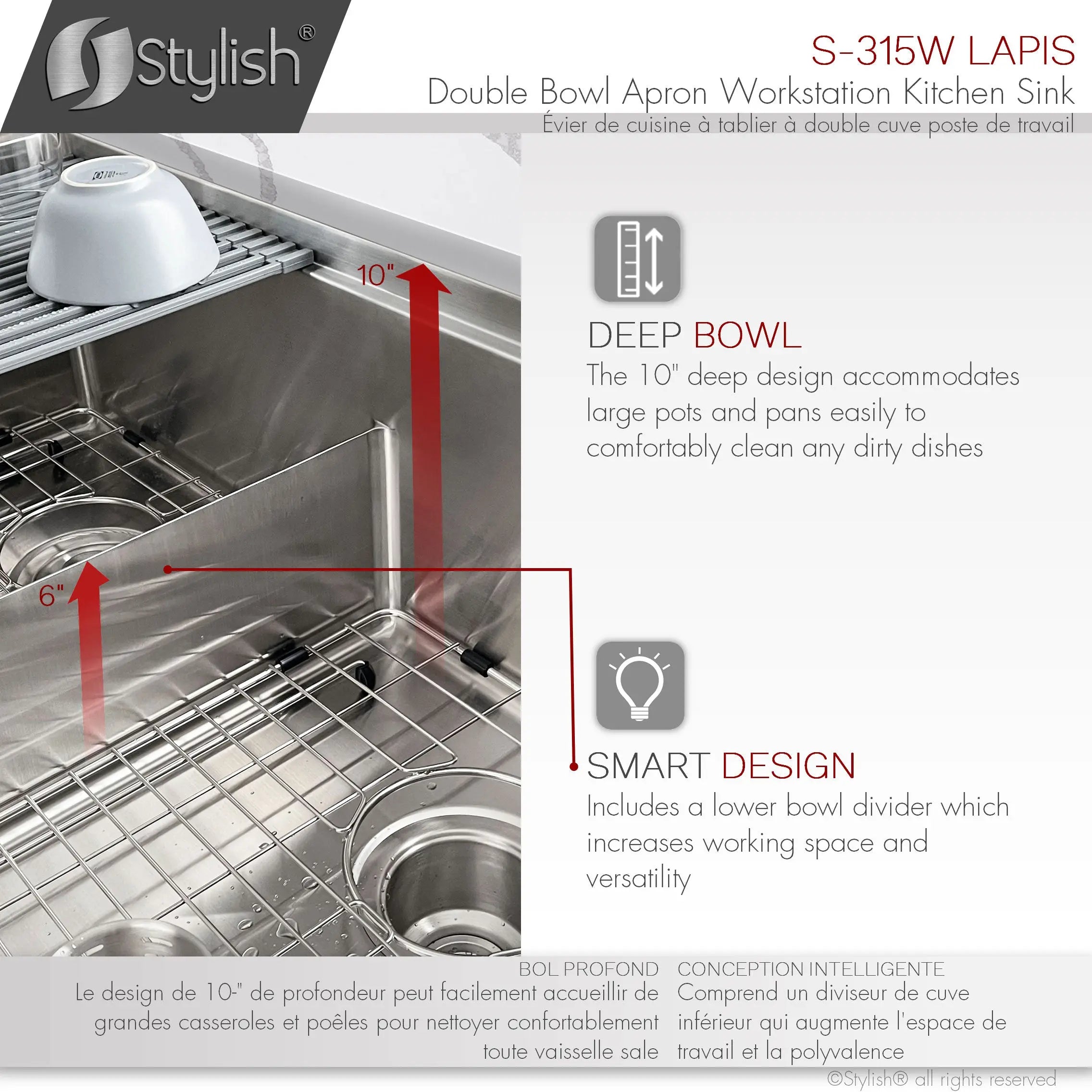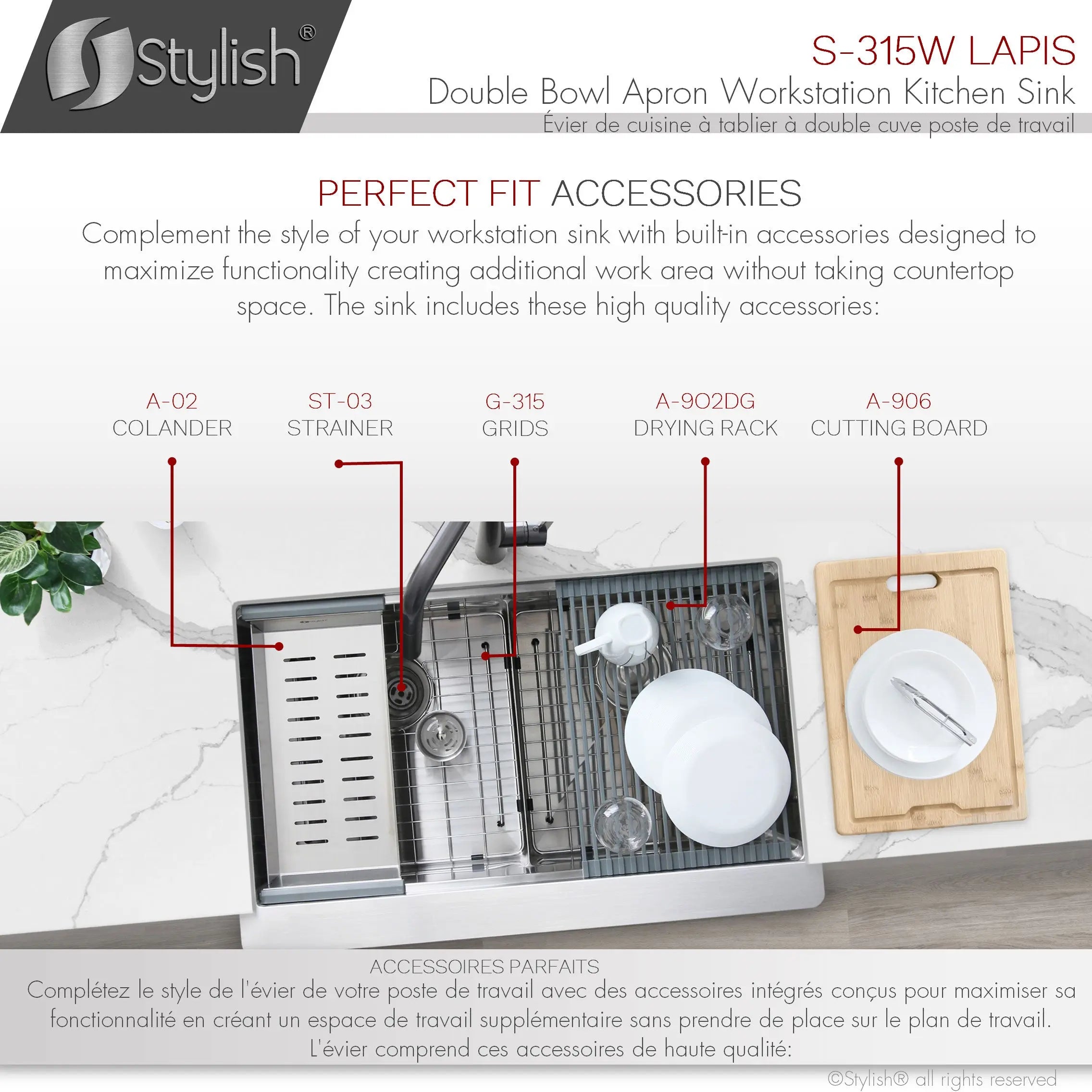 33 in Farmhouse Workstation Double Bowl Stainless Steel Apron Kitchen Sink with Built-in Accessories, by Stylish® S-315W Lapis Introducing our stainless steel double bowl workstation apron kitchen sink. Become your own private chef with all the features this workstation kitchen sink has to offer. Not to mention the beautiful apron/farmhouse look that will completely transform your kitchen design. This 33 x 21 inch stainless steel double bowl workstation sink is made of premium 16 gauge stainless steel and can be installed undermount or top-mount to match your design. So versatile, this workstation kitchen sinks comes with two protective stainless steel bottom grids, two luxury stainless steel basket strainers, a stainless steel colander, a bamboo cutting board and a roll-up drying rack. All these included accessories fit perfectly over the kitchen sink. This double bowl workstation sink also comes with installation instructions and mounting brackets, it is very easy to install. To top it off, this stainless steel apron kitchen sink has been designed with a low and slim divider, making it very easy to move large kitchen accessories around the sink. The 10 inch deep bowls allow you to wash larger pots and pans and also help hide dirty dishes for later washing. This double bowl dual mount workstation apron kitchen sink is equipped with a soundproofing system including a protective stone guard coating and extra thick rubber pads to keep vibrations and loud sounds at bay while in use. This coat is sprayed underneath the sink to prevent water condensation as well. The drain in this stainless steel workstation apron sink has been placed towards the rear to allow for optimal drainage and more space under the kitchen cabinet for storage. The tight 10mm radius corners of this apron sink are perfectly blended through an automated machine buffing system, and carefully hand polished, for a luxurious finish. Rounded corners make maintenance as simple as wiping the surface with a damp cloth. This is truly a home chef’s dream workstation apron kitchen sink, prep food over the kitchen sink with our amazing accessories, save space on you kitchen countertop and give your kitchen a whole new look.
