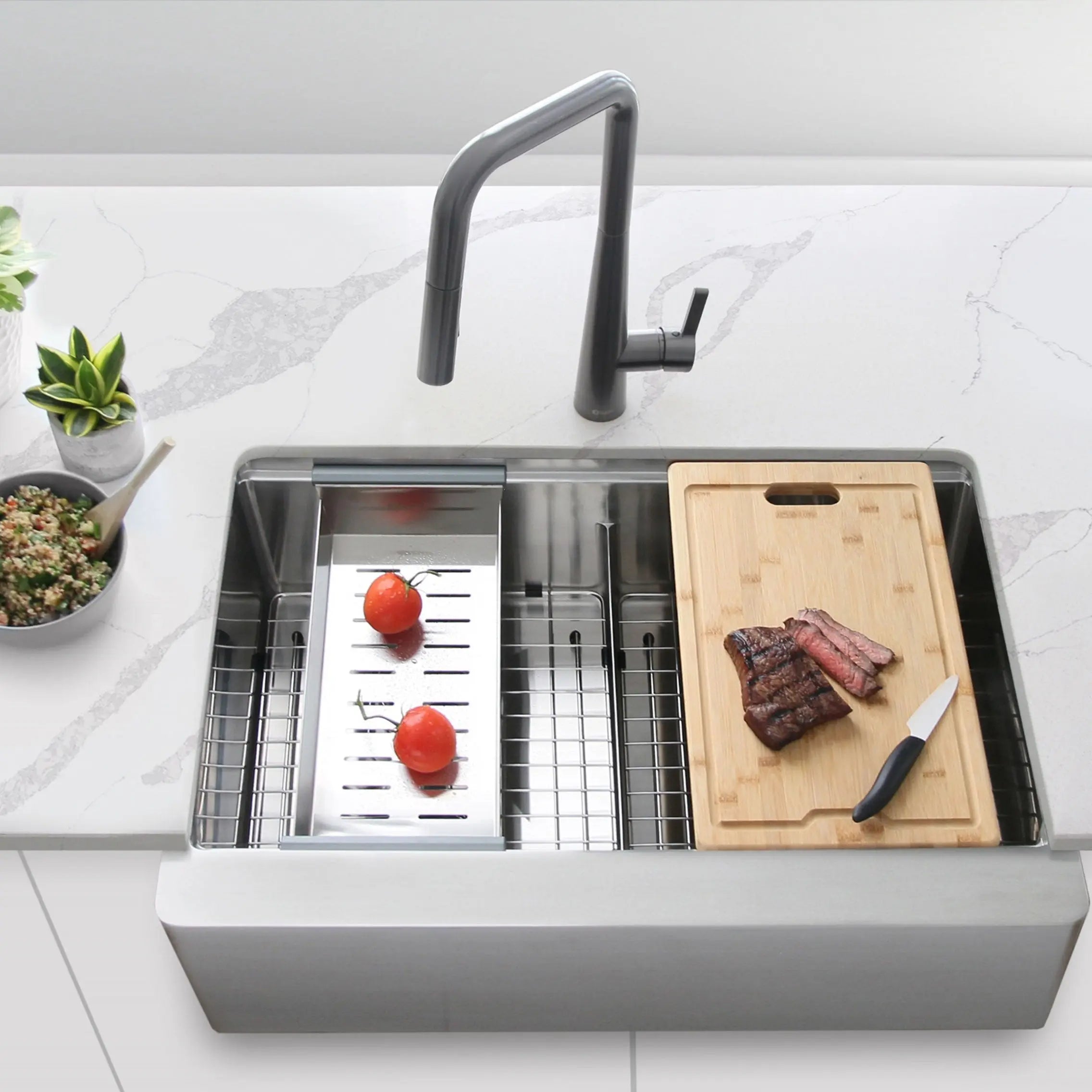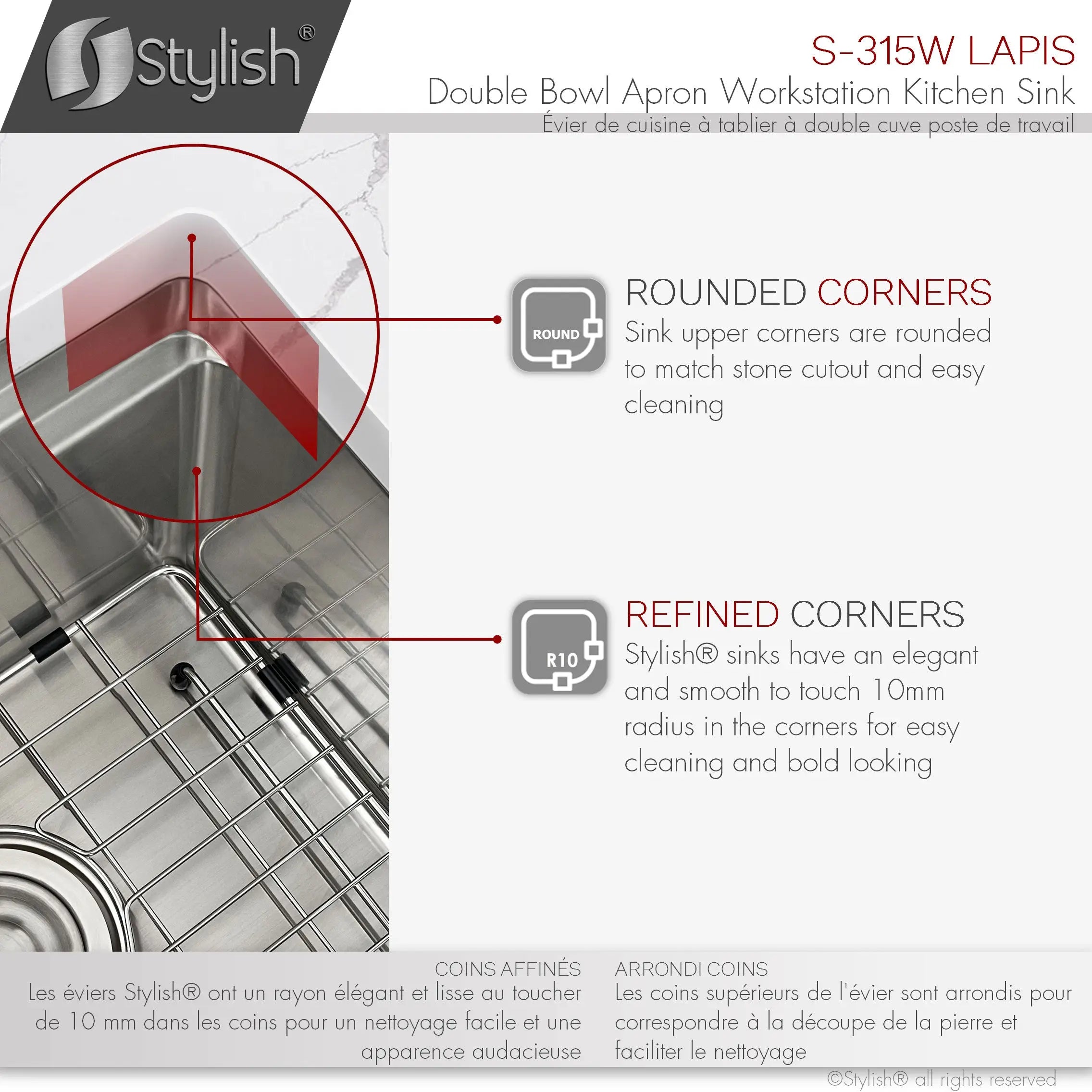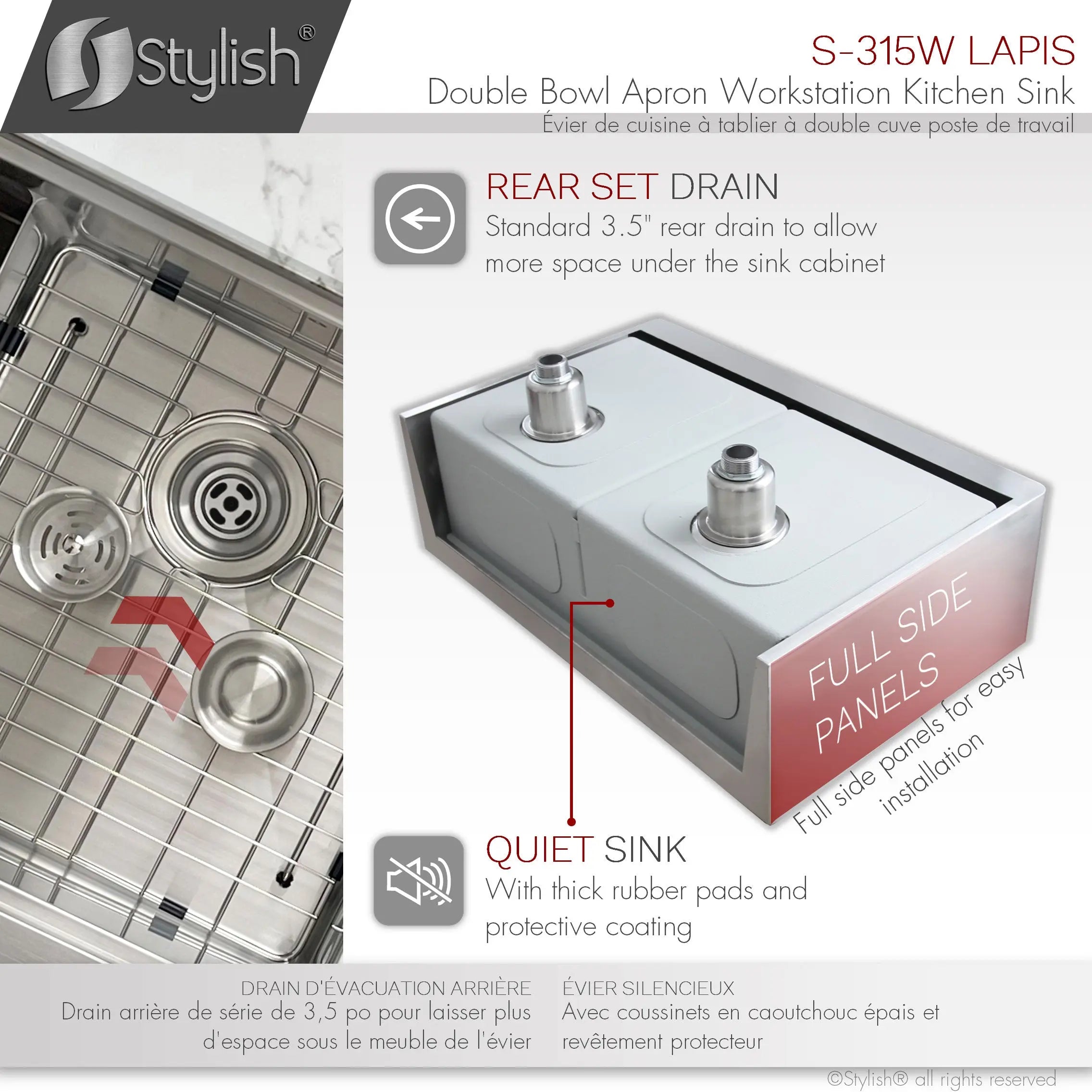 33 in Farmhouse Workstation Double Bowl Stainless Steel Apron Kitchen Sink with Built-in Accessories, by Stylish® S-315W Lapis Introducing our stainless steel double bowl workstation apron kitchen sink. Become your own private chef with all the features this workstation kitchen sink has to offer. Not to mention the beautiful apron/farmhouse look that will completely transform your kitchen design. This 33 x 21 inch stainless steel double bowl workstation sink is made of premium 16 gauge stainless steel and can be installed undermount or top-mount to match your design. So versatile, this workstation kitchen sinks comes with two protective stainless steel bottom grids, two luxury stainless steel basket strainers, a stainless steel colander, a bamboo cutting board and a roll-up drying rack. All these included accessories fit perfectly over the kitchen sink. This double bowl workstation sink also comes with installation instructions and mounting brackets, it is very easy to install. To top it off, this stainless steel apron kitchen sink has been designed with a low and slim divider, making it very easy to move large kitchen accessories around the sink. The 10 inch deep bowls allow you to wash larger pots and pans and also help hide dirty dishes for later washing. This double bowl dual mount workstation apron kitchen sink is equipped with a soundproofing system including a protective stone guard coating and extra thick rubber pads to keep vibrations and loud sounds at bay while in use. This coat is sprayed underneath the sink to prevent water condensation as well. The drain in this stainless steel workstation apron sink has been placed towards the rear to allow for optimal drainage and more space under the kitchen cabinet for storage. The tight 10mm radius corners of this apron sink are perfectly blended through an automated machine buffing system, and carefully hand polished, for a luxurious finish. Rounded corners make maintenance as simple as wiping the surface with a damp cloth. This is truly a home chef’s dream workstation apron kitchen sink, prep food over the kitchen sink with our amazing accessories, save space on you kitchen countertop and give your kitchen a whole new look.