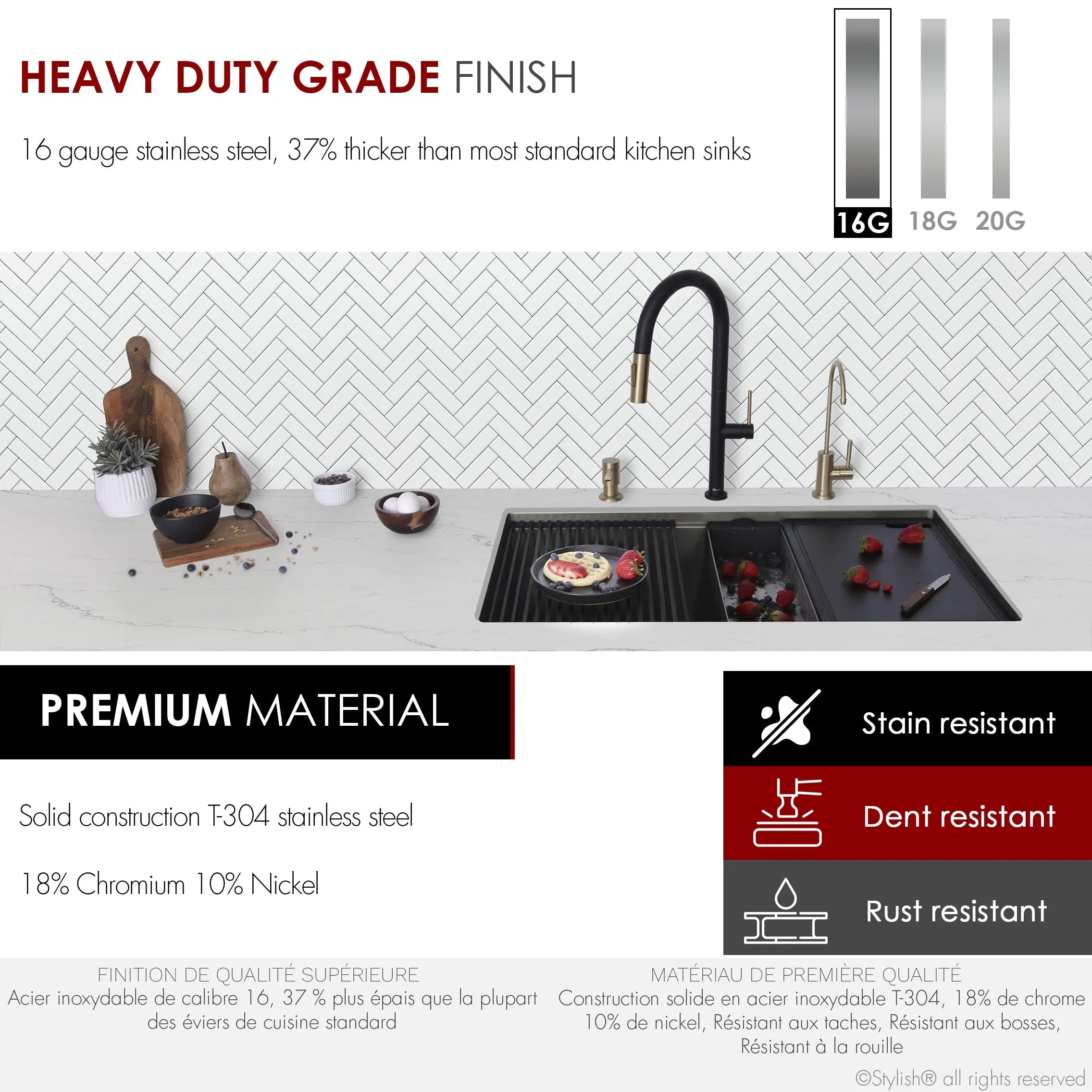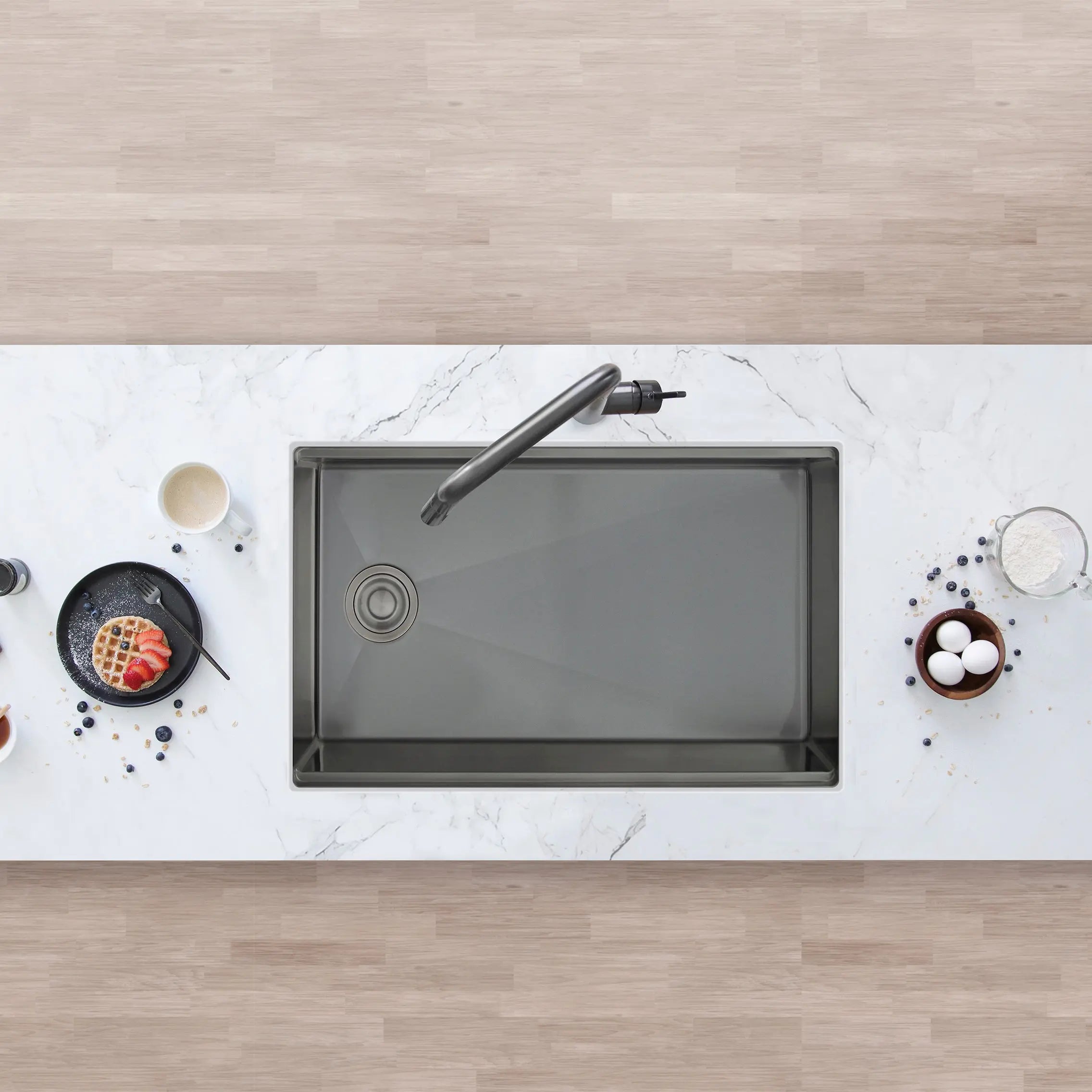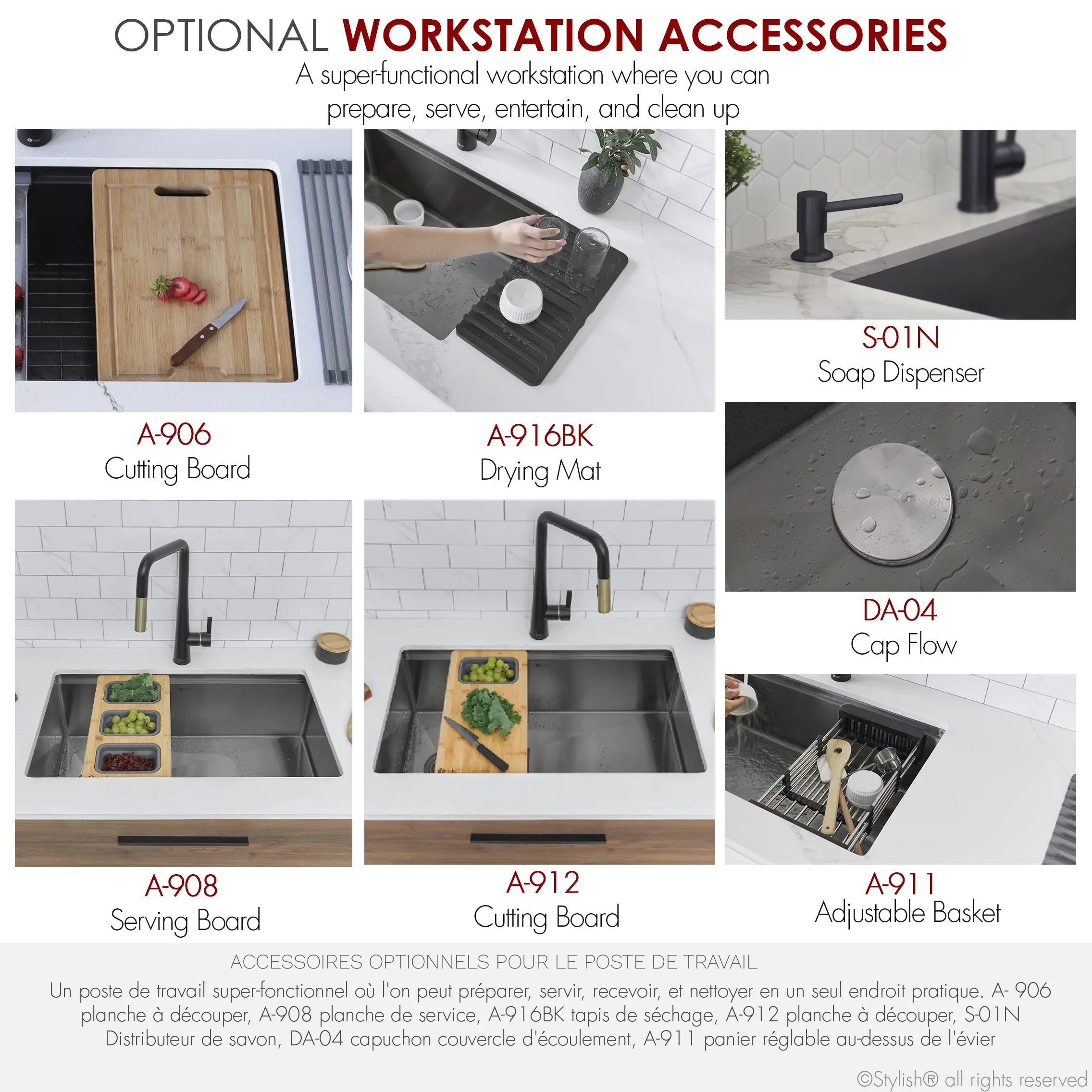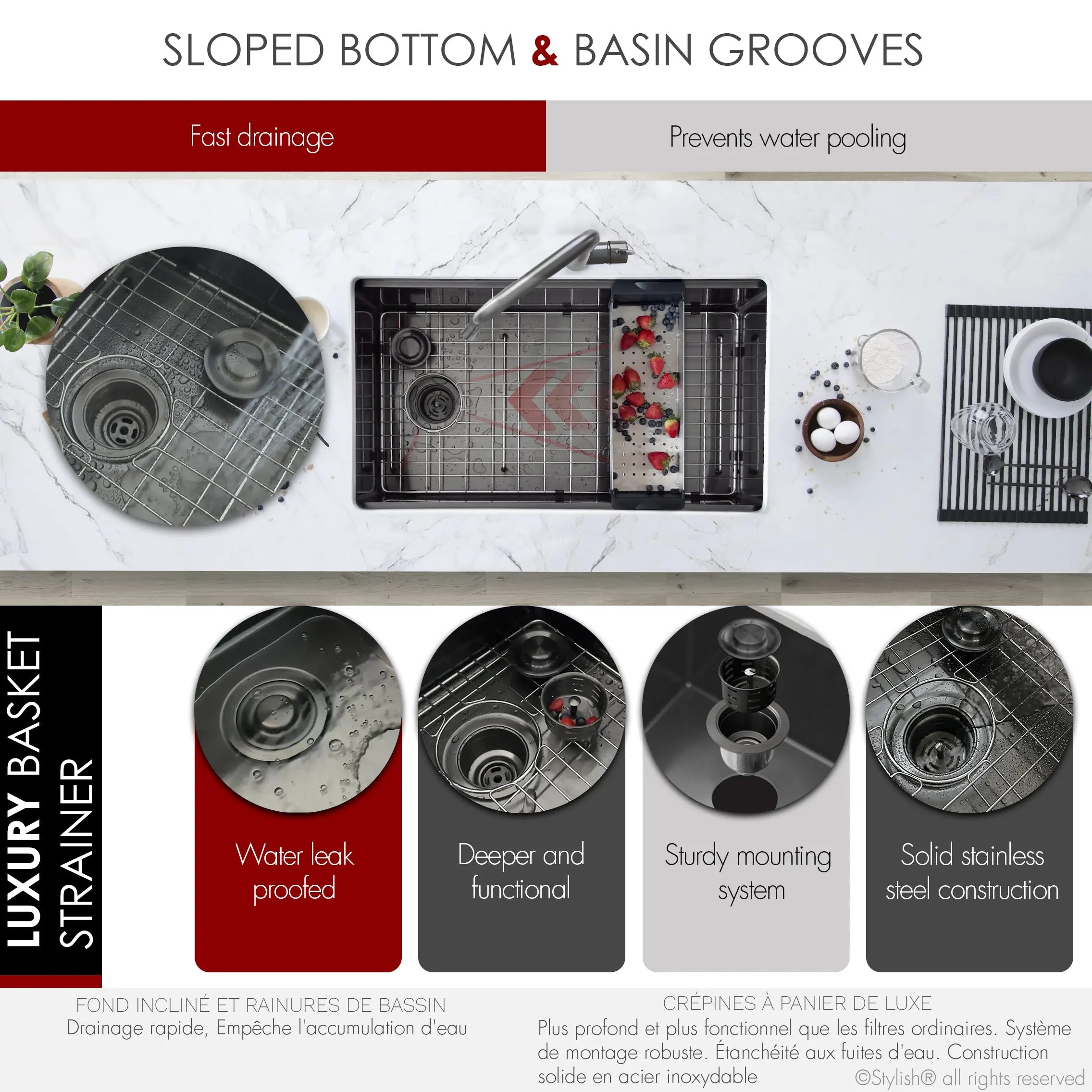 Complete your kitchen setup with the 33" single bowl undermount sink, which includes 5 accessories: the stainless-steel grid, silicone-coated rack, black wood fiber cutting board, luxury basket strainer, and a metal colander.