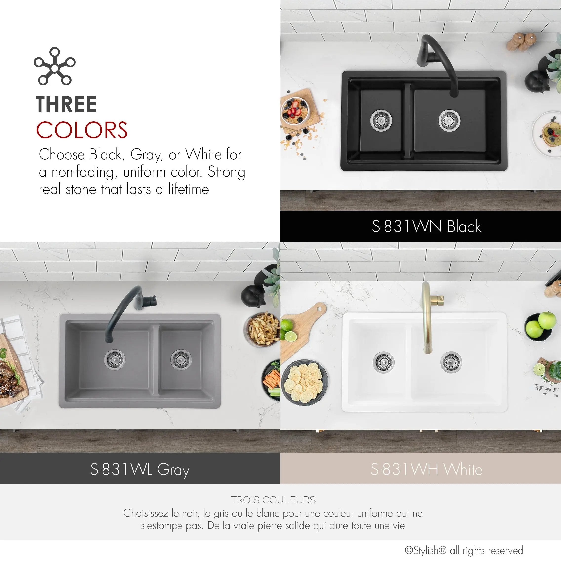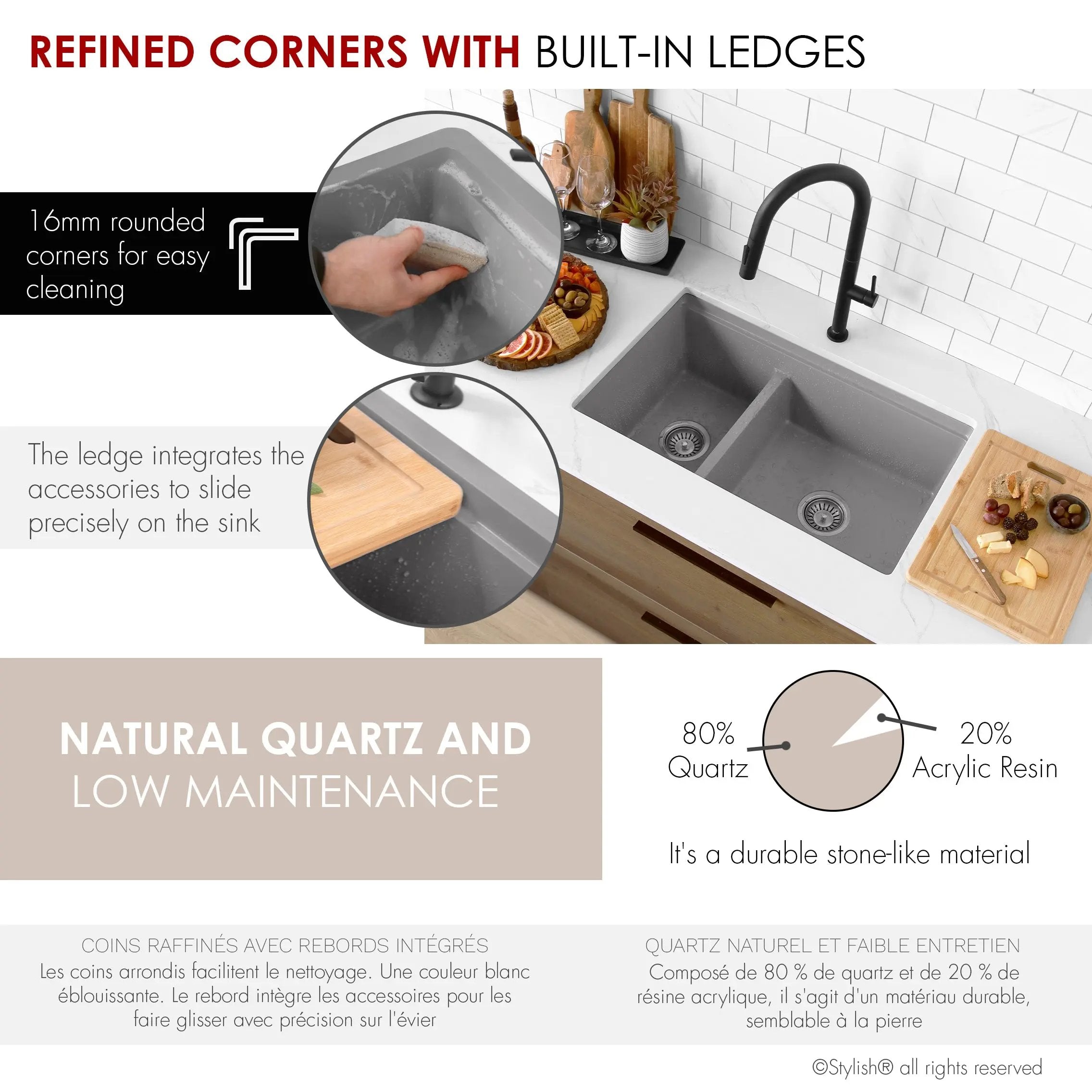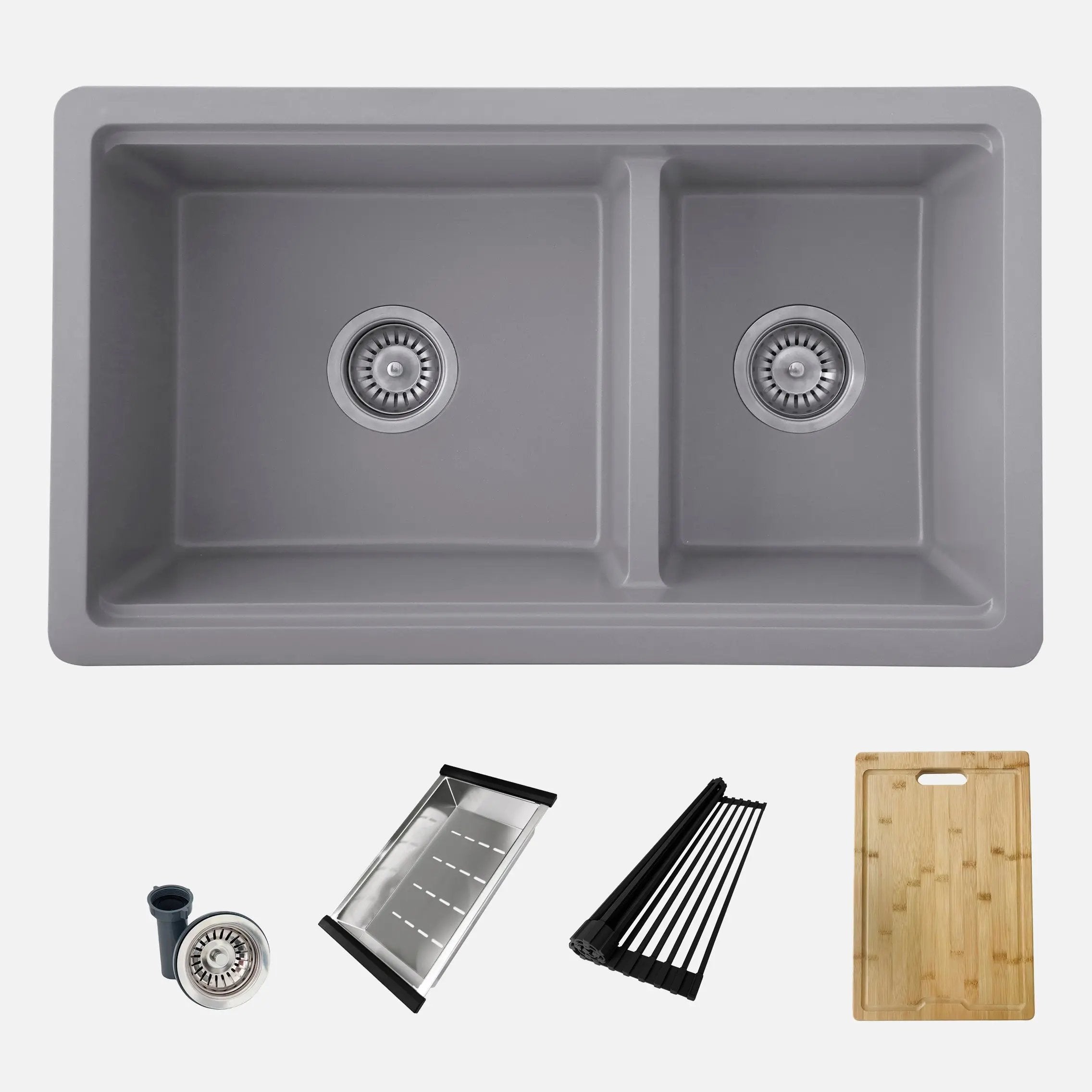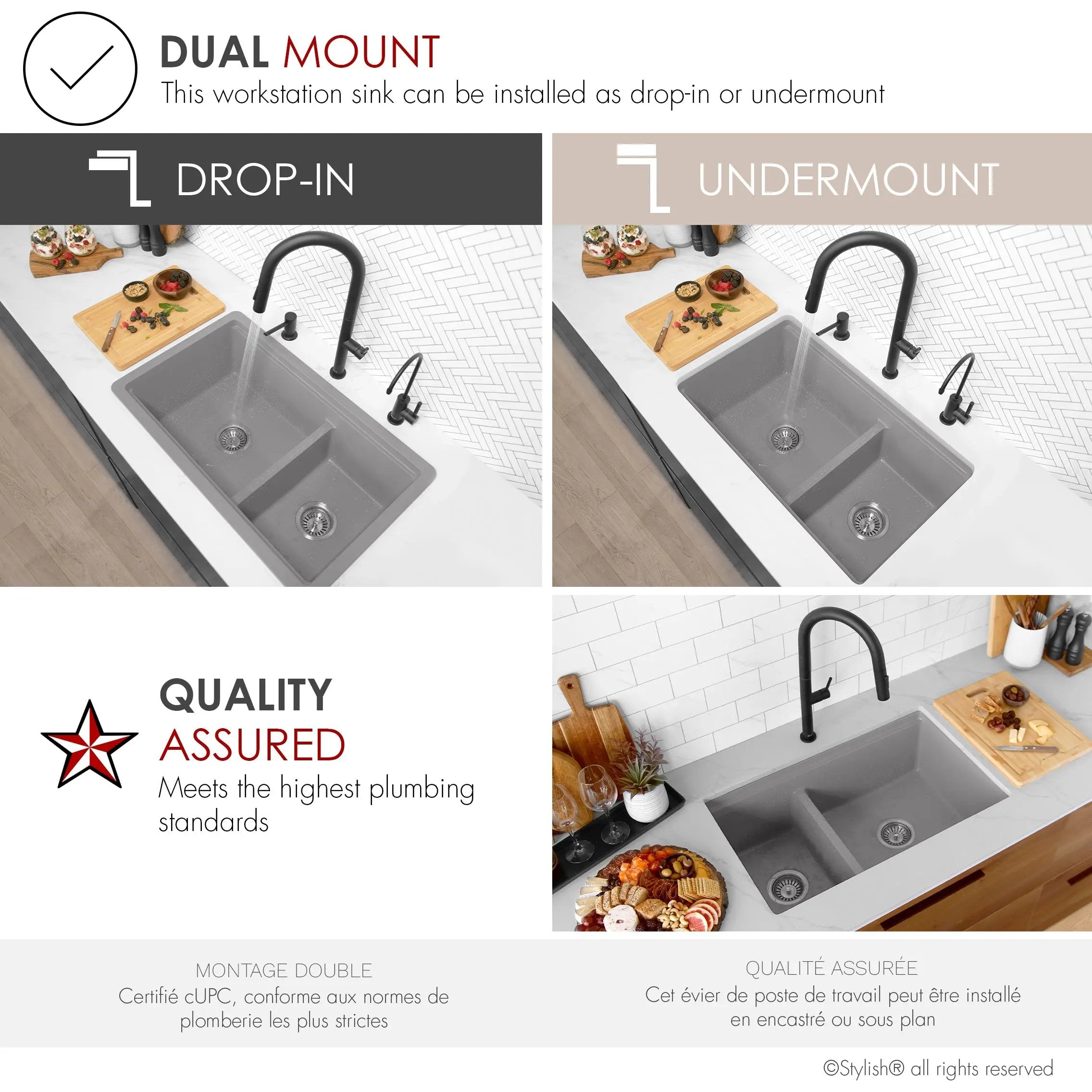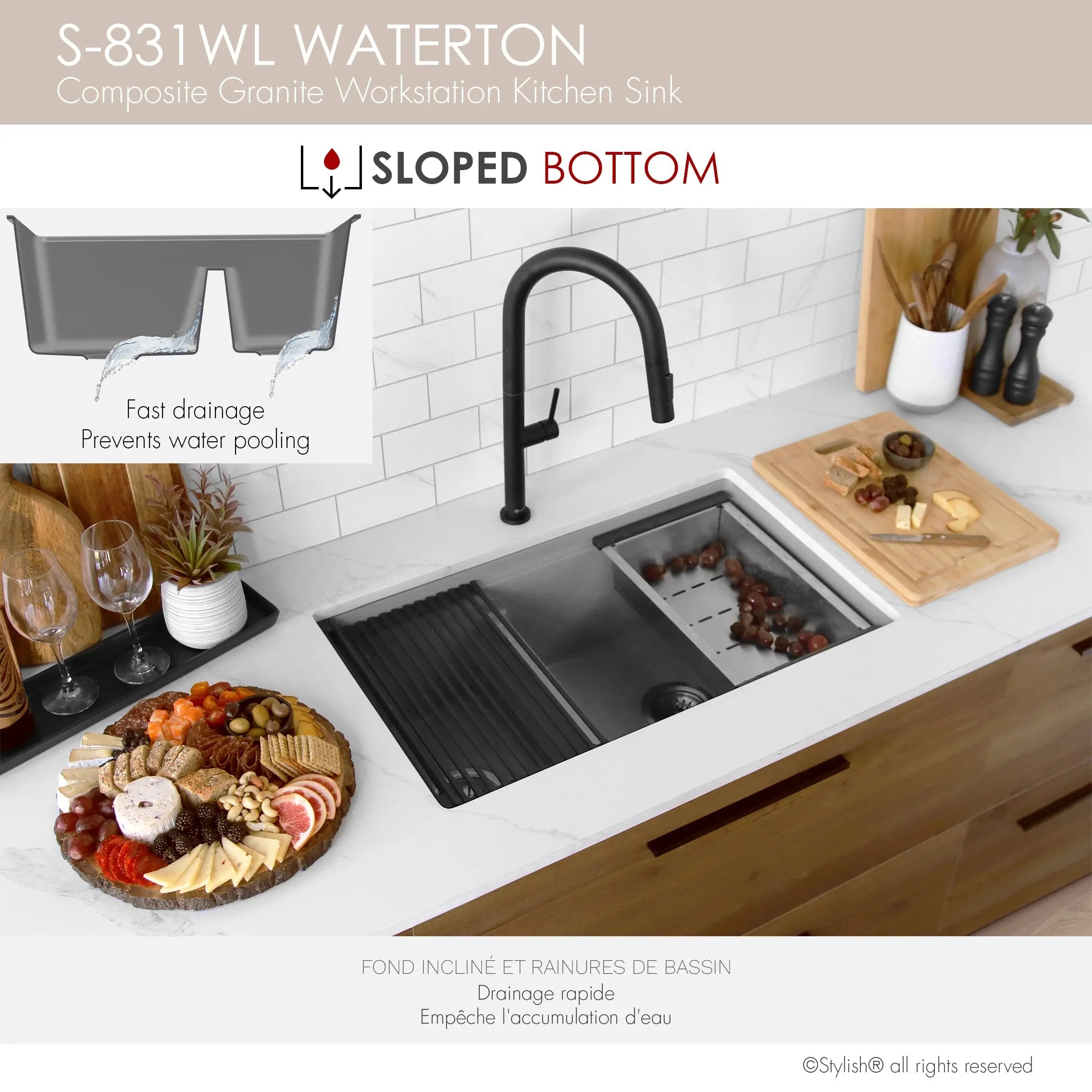 Enhance your kitchen experience with our exceptional 30-inch double bowl, 60/40 double-mount sink. Made of composite granite containing 80% natural quartz, this sink is not only beautiful and durable, but also remarkably low maintenance. Featuring a lowered 60/40 separator and deep 9-½-inch basins, this sink offers ample space for all kitchen needs. The lowered separator and spacious bowl make it easy to handle even the largest pots and pans. This sink can be installed above the counter or under the worktop, and is reversible, with the large bowl installed on the left or right, depending on customer preference. Transform your sink into a versatile culinary workstation with the five included accessories: colander, metal colander, drainer and cutting board. These accessories offer endless possibilities for culinary creativity at your fingertips. Thick granite, highly scratch-resistant and easy to clean, ensures silent operation. Available in three stunning colors: black, gray and white, this sink promises durable, unalterable colors that will stand the test of time. Enjoy efficient drainage and optimize your worktop space with the ability to work directly above the sink. Adopt the perfect blend of functionality and style in your kitchen with the Waterton workstation sink, part of the Stylish Pietra series