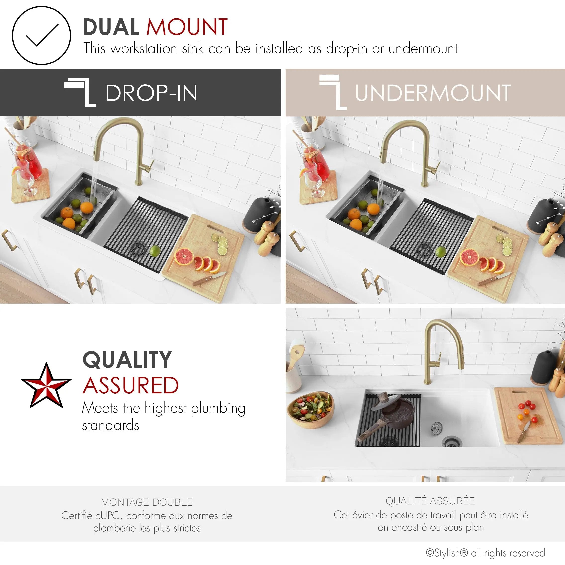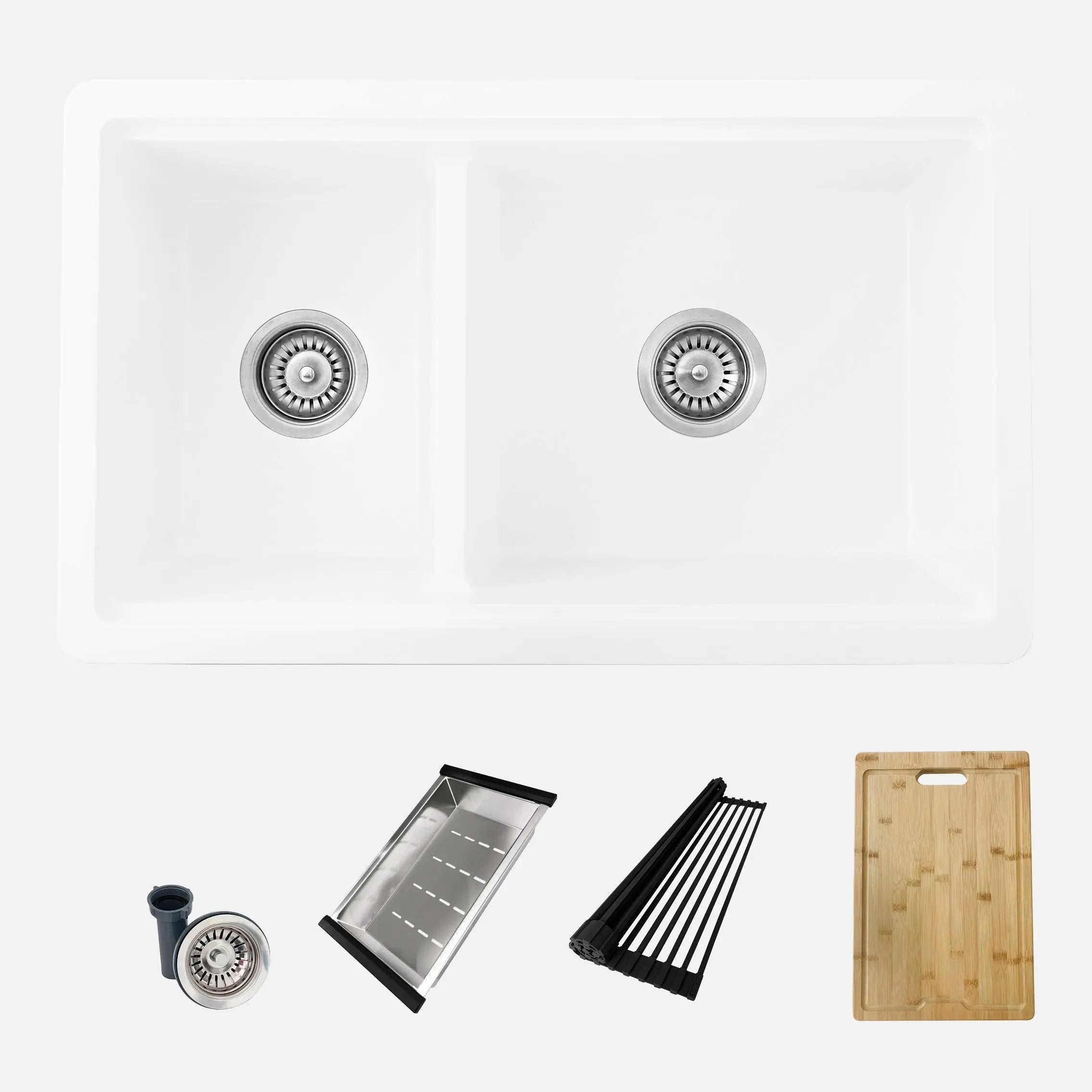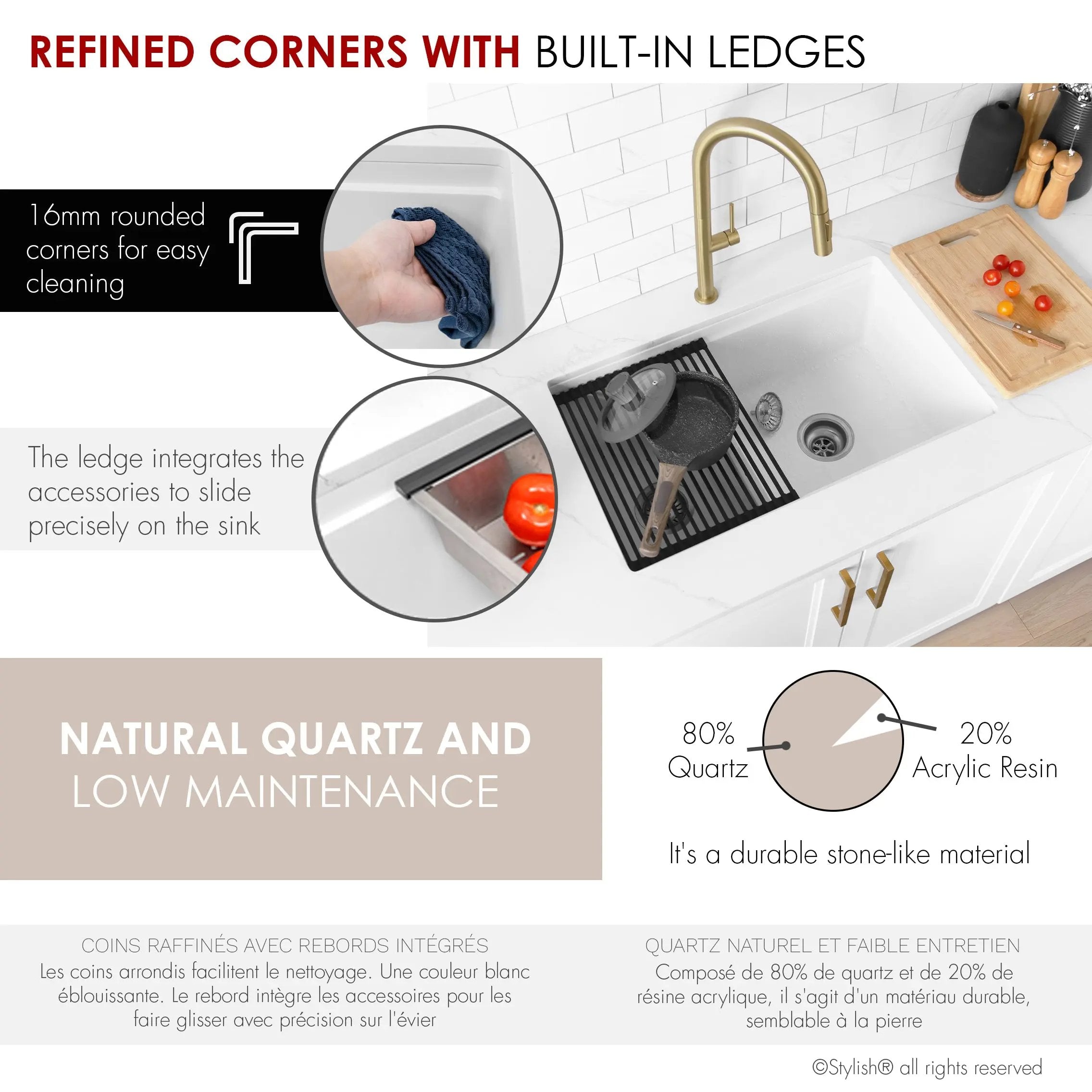 Enhance your kitchen experience with our exceptional 30-inch double bowl, 60/40 double-mount sink. Made of composite granite containing 80% natural quartz, this sink is not only beautiful and durable, but also remarkably low maintenance. Featuring a lowered 60/40 separator and deep 9-½-inch basins, this sink offers ample space for all kitchen needs. The lowered separator and spacious bowl make it easy to handle even the largest pots and pans. This sink can be installed above the counter or under the worktop, and is reversible, with the large bowl installed on the left or right, depending on customer preference. Transform your sink into a versatile culinary workstation with the five included accessories: colander, metal colander, drainer and cutting board. These accessories offer endless possibilities for culinary creativity at your fingertips. Thick granite, highly scratch-resistant and easy to clean, ensures silent operation. Available in three stunning colors: black, gray and white, this sink promises durable, unalterable colors that will stand the test of time. Enjoy efficient drainage and optimize your worktop space with the ability to work directly above the sink. Adopt the perfect blend of functionality and style in your kitchen with the Waterton workstation sink, part of the Stylish Pietra series