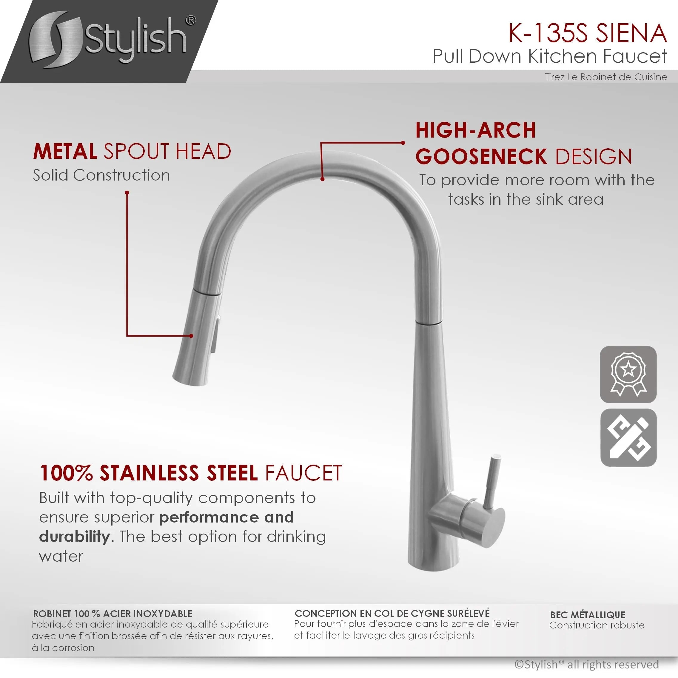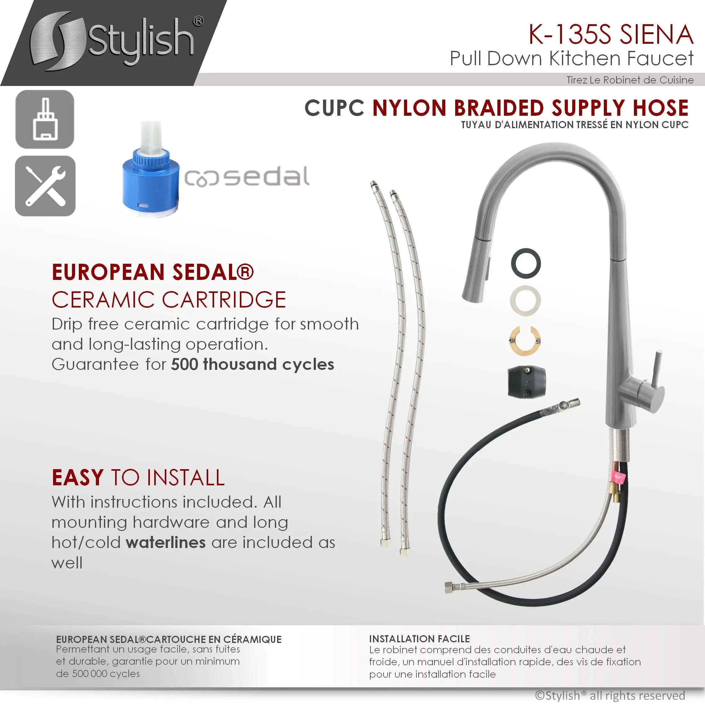 The K135-Siena faucet by Stylish®. This faucet is made of 100% stainless steel and has been manufactured with top-quality components to ensure superior performance and durability. With a streamlined design and flexible functionality, this pull-down faucet is the perfect fit for your kitchen. The sleek lines and soft curves create a beautifully balanced silhouette that suits a range of styles, from classic to contemporary. This versatile faucet features an ergonomic pull-down metal spray head with a magnetic retraction system and a single-lever handle for effortless flow control.