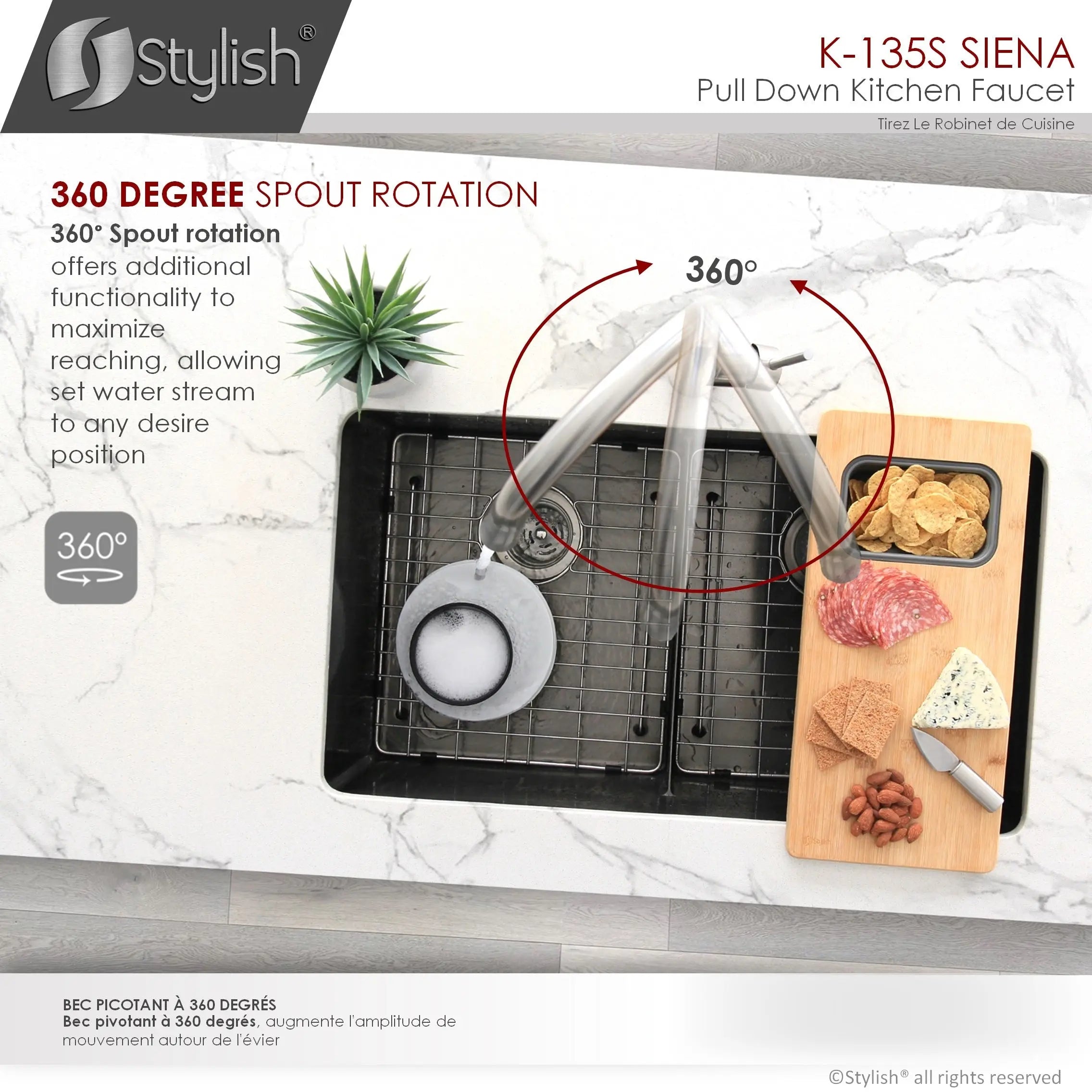 Its 360° swivel spout head rotation offers additional functionality to ensure a better range of motion and complete sink access.