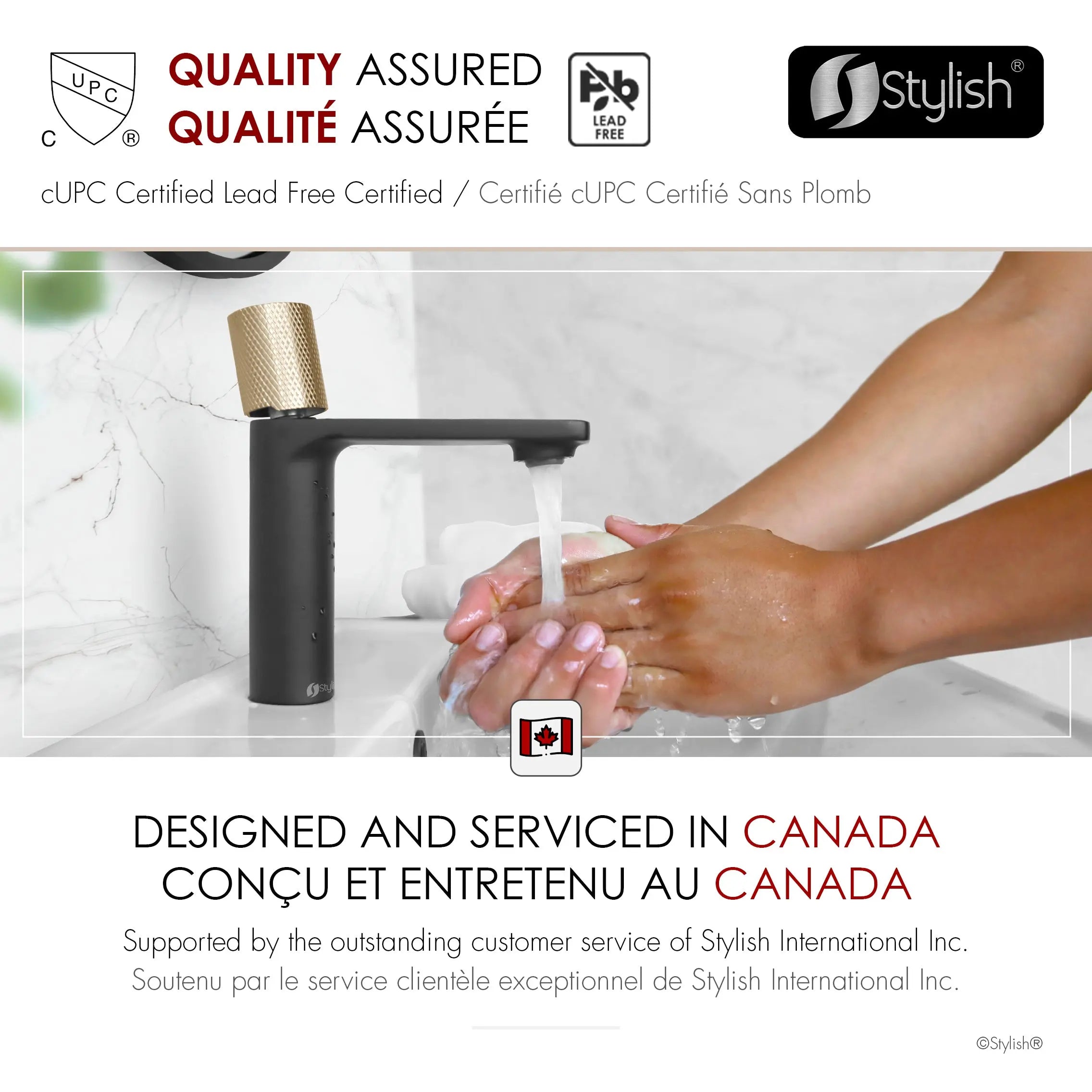 Designed for a single hole installation with included hot-cold supply lines for standard US and Canada plumbing connections.