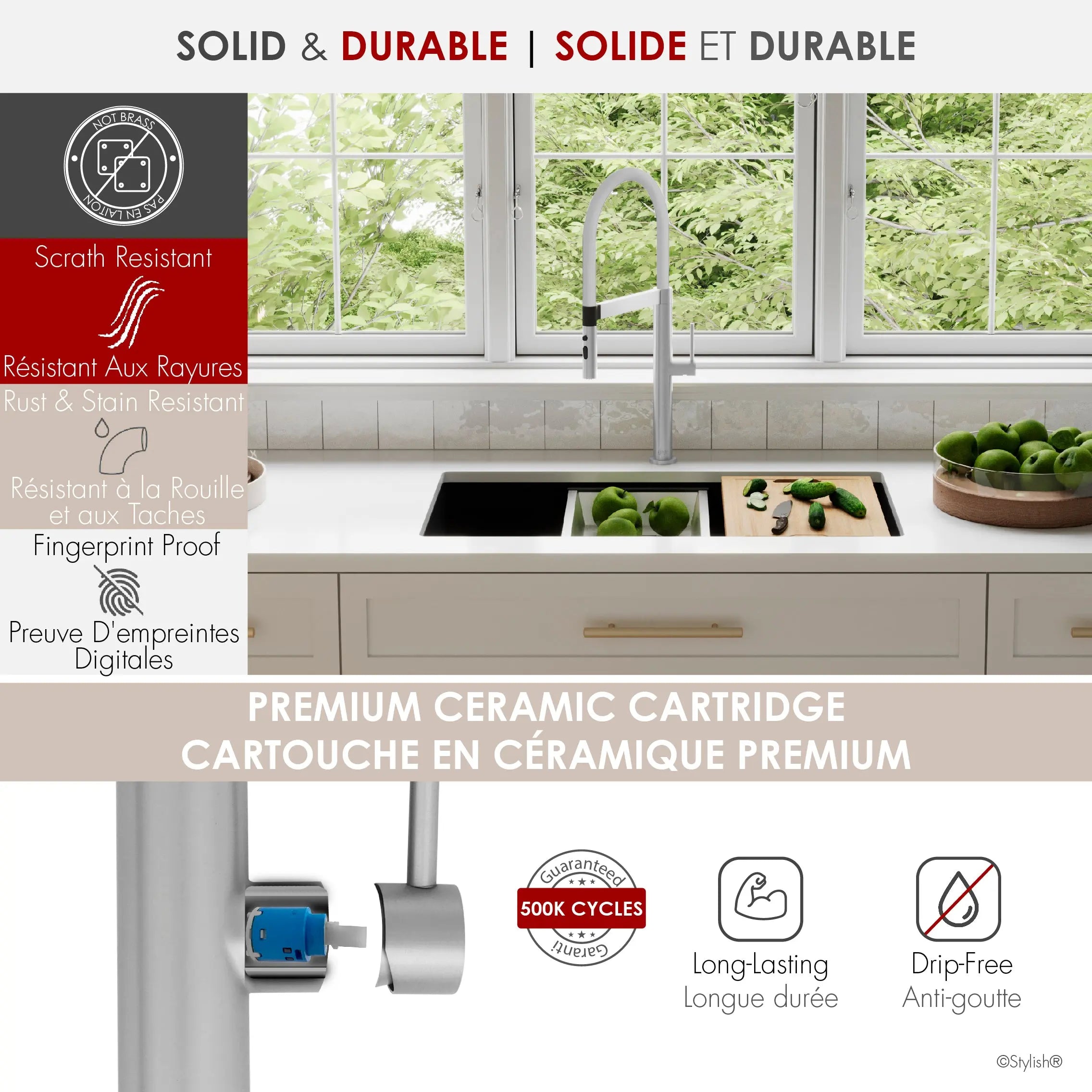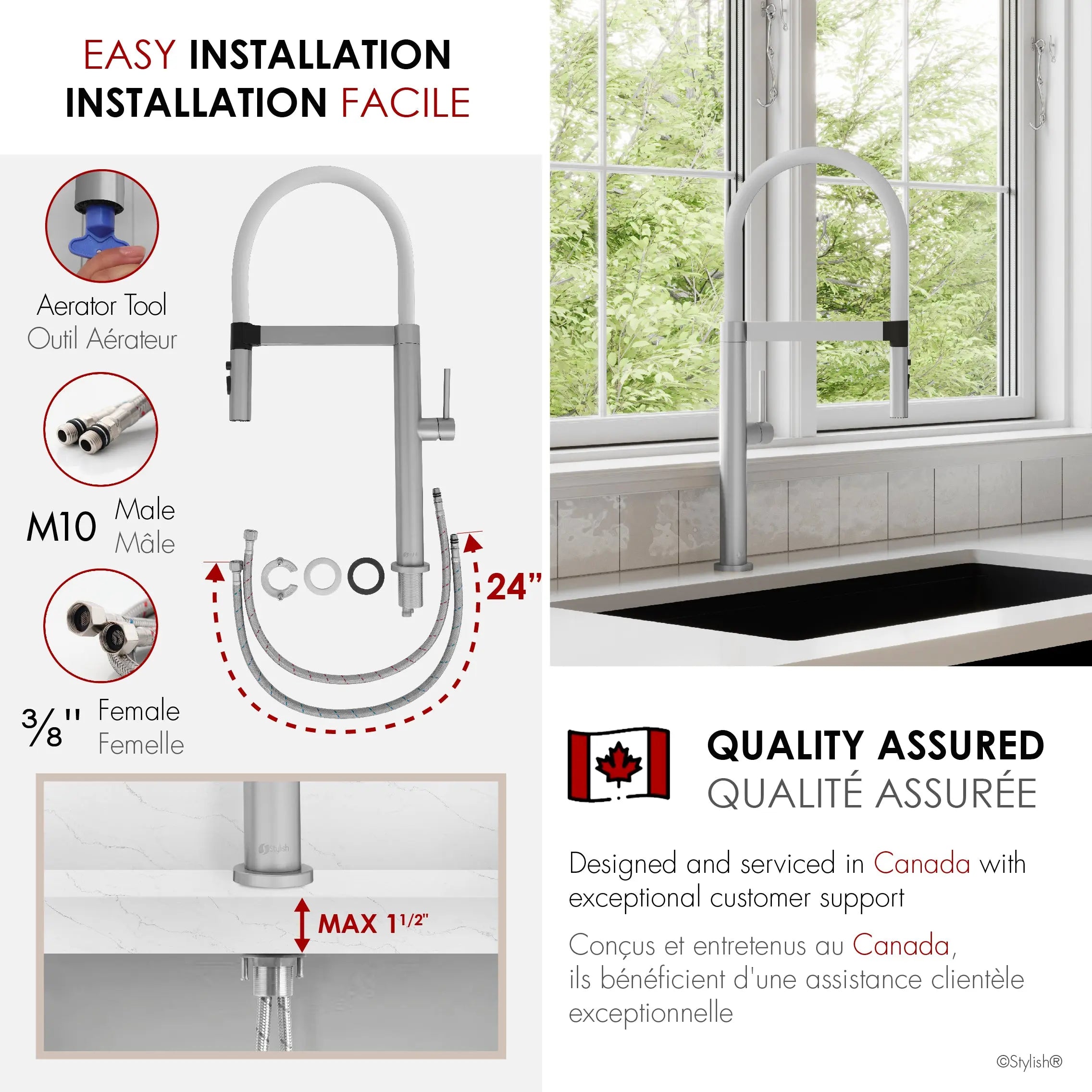 This kitchen faucet is designed to meet the highest plumbing standards in North America. Made from stainless steel and top-quality components, it is engineered to ensure quality and longevity. This pull-out single handle kitchen faucet is extra durable and will not rust or corrode.