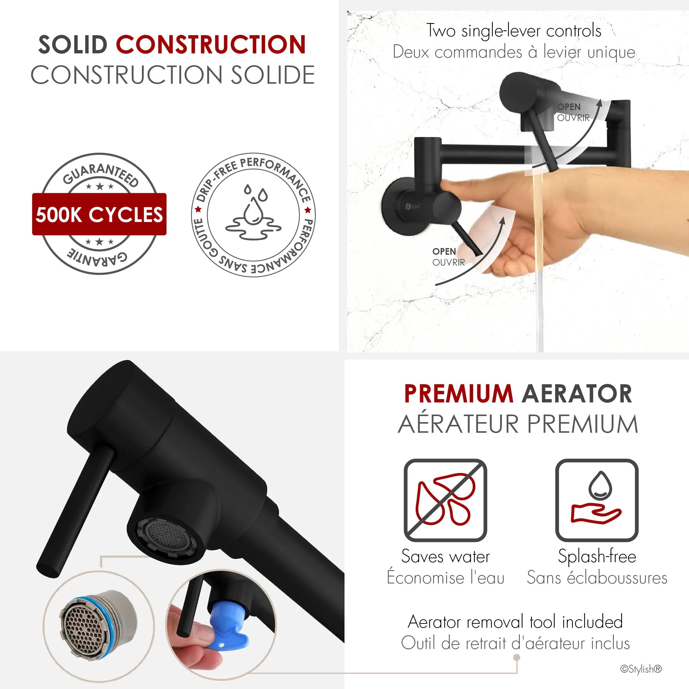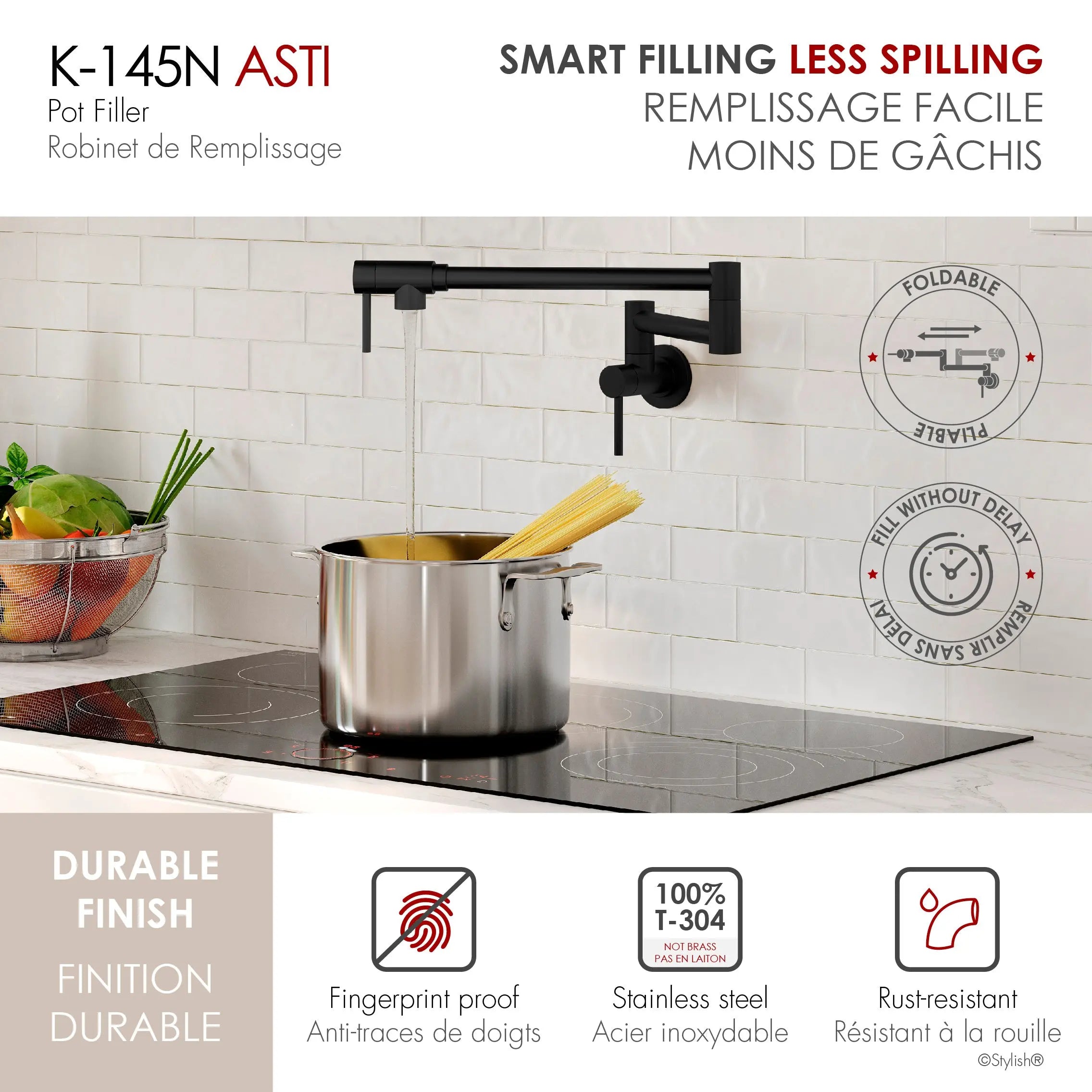Our stylish kitchen pot filler faucet is available in three beautiful finishes that will complement your kitchen decor. Choose from Matte Black, Stainless Steel, and Gold.