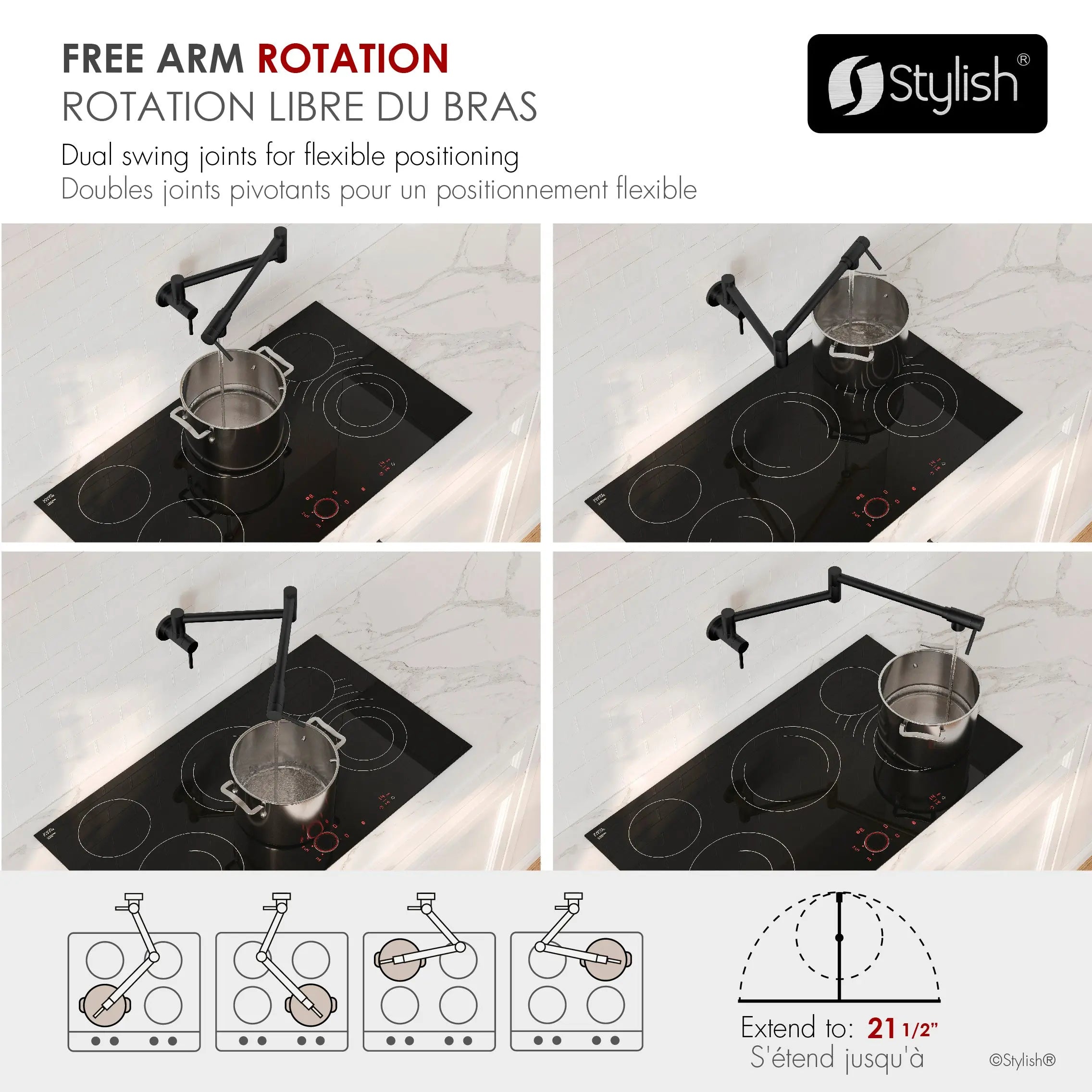 Filling water directly over your stove has never been easier with our wall mount kitchen pot filler faucet. The smart and modern design of our kitchen pot filler allows you to easily add water directly over your cooktop or stove and retract it easily when not in use. The pot filler faucet's arm can rotate 360 degrees, making it easier to add water. When not in use, the arm can be folded up to save space in the kitchen. The double-jointed foldable spout arm can reach 21" at full extension.
