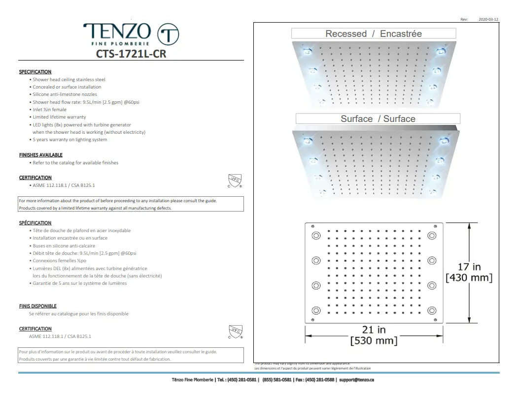 ![Tenzo Recessed Ceiling shower head 43x53cm [17x21in] with LED - Plumbing Market](http://www.plumbingmarket.ca/cdn/shop/files/Tenzo-Recessed-Ceiling-shower-head-43x53cm-_17x21in_-with-LED-Plumbing-Market-247023680.jpg?height=430&v=1760149665)